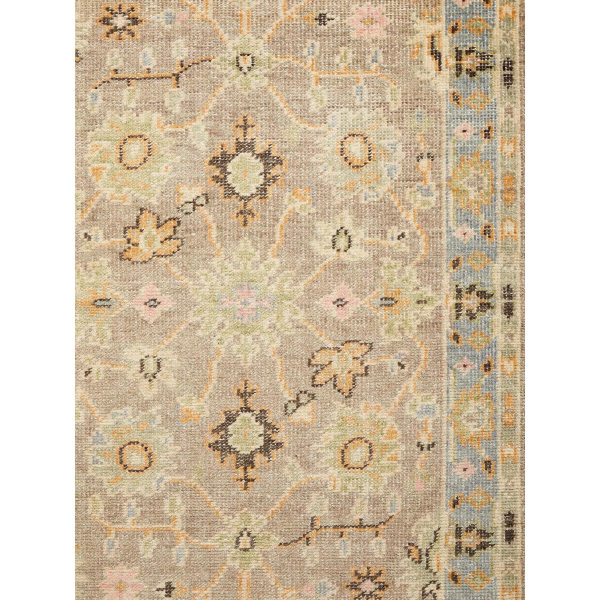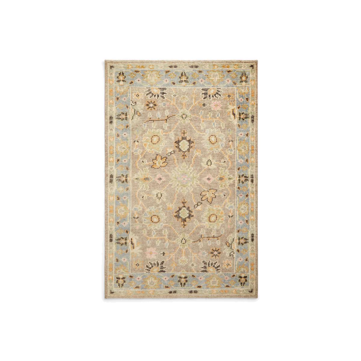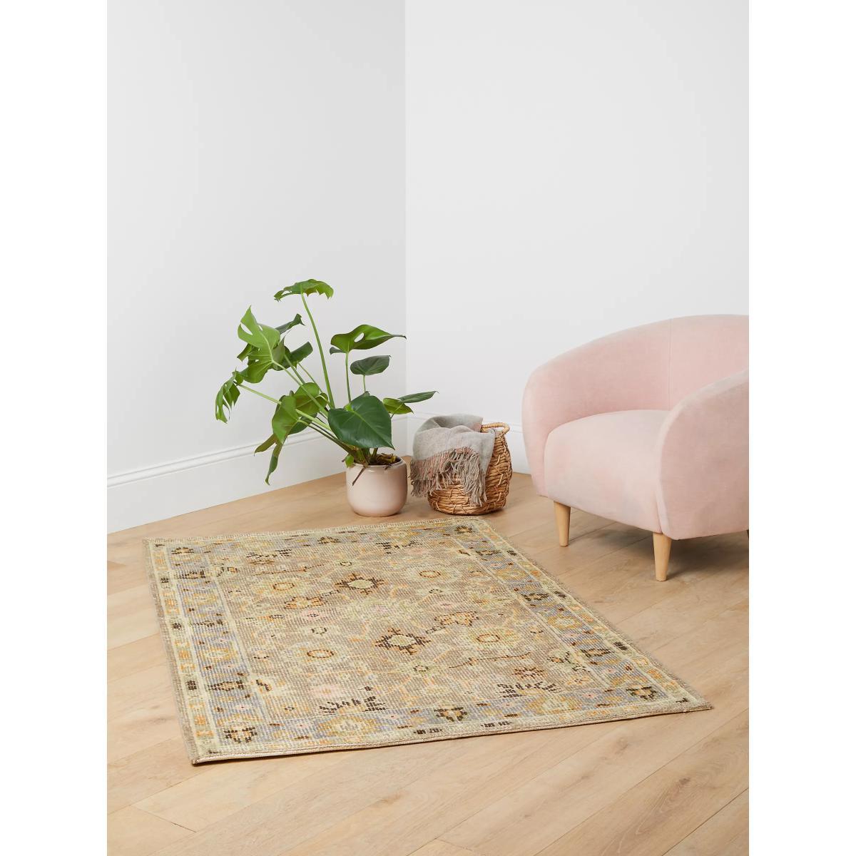 Adorned with a traditional take on floral, rug design for a shabby chic, vintage style, this hand knotted rug is made from a blend of fabrics like wool and cotton for a strong and soft feel underfoot. This rug has been knotted by hand, the oldest and most individual way a rug can be made. This involves an intricate process of weaving by hand on a loom where yarns are tied one at a time, giving the rug a durable construction. About your new rug We recommend. It prevents your rug from moving underfoot and protects against colour transfer to the floor Natural fibres may shed. This will reduce over time, and shouldn’t affect your rug’s lifespan or performance When vacuuming your rug, use suction only. Rotating brushes may damage the fibres Blot any spills with a clean, dry cloth. Do not rub or use harsh detergents. Textile backed