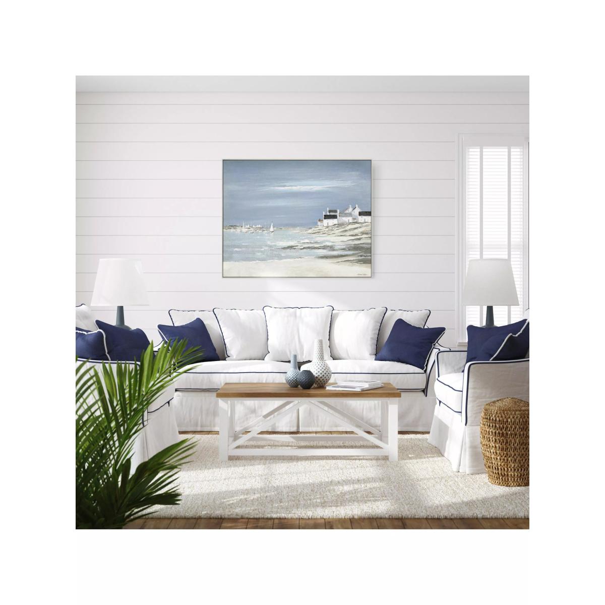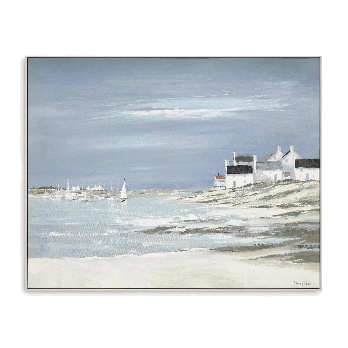 I love this one for its calming blue tones and understated coastal vibe, making it versatile for both modern and traditional interiors. It works particularly well in living rooms or bedrooms aiming for a tranquil, seaside feel. To style it, consider pairing with neutral or soft grey textiles to allow the artwork to be a statement piece. It also pairs beautifully with natural materials like light wood or wicker, adding to its relaxed mood. Remember, due to its sizeable dimensions, display it at eye level to maximise impact, and consider pairing with complementary smaller accessories in similar colour palettes to create a cohesive look.