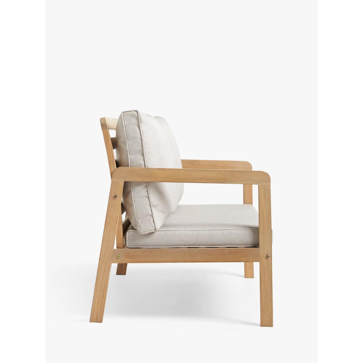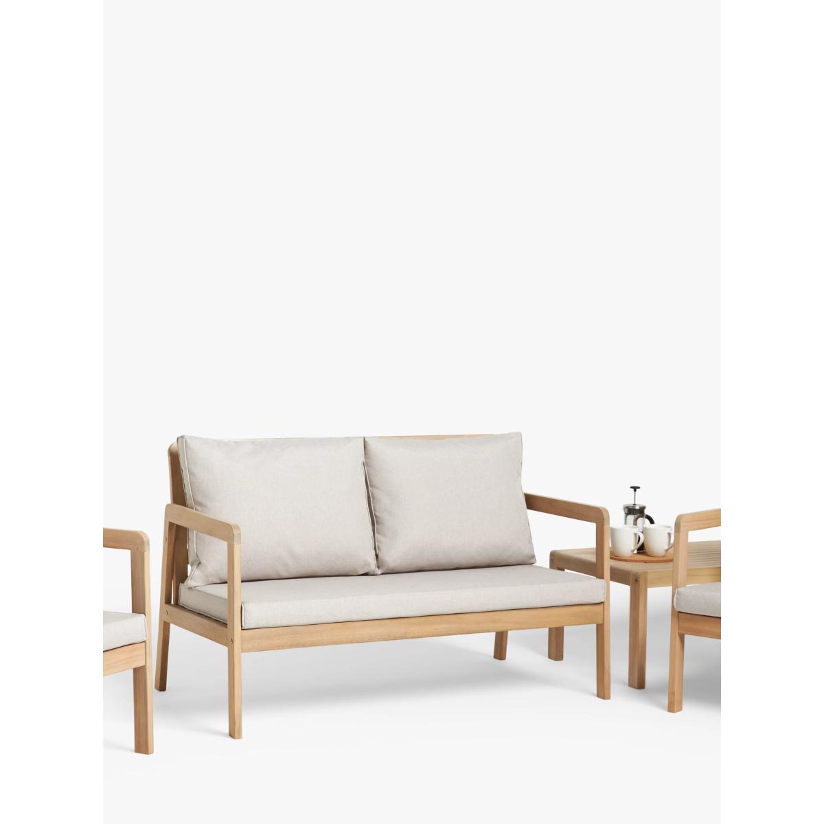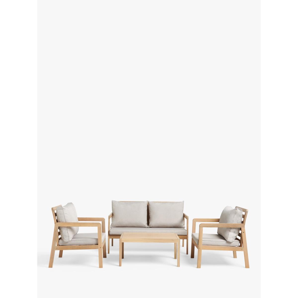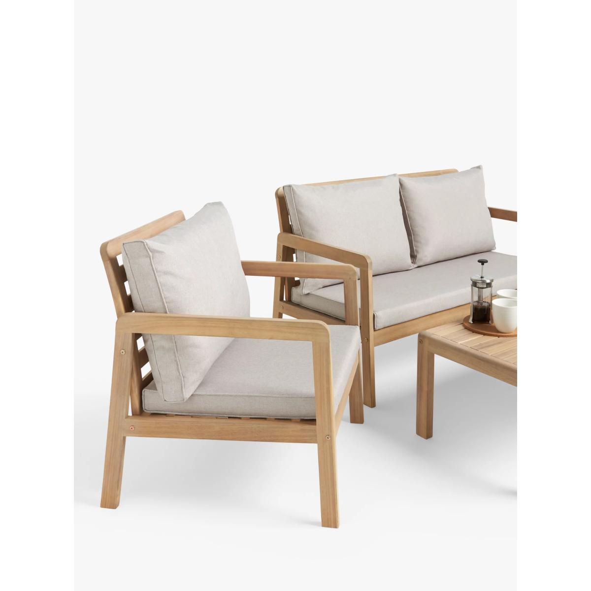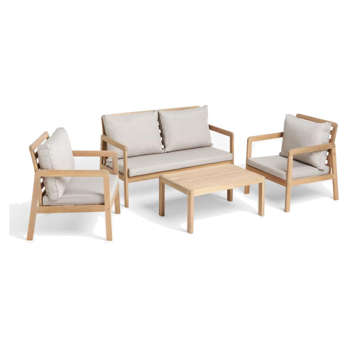Acacia wood garden lounge set. Set includes two armchairs, a two-seater sofa and a square coffee table. All our outdoor wooden furniture ranges are made from sustainably sourced, naturally weather-resistant tropical hardwoods. All our outdoor cushions are shower-resistant and our seating is rigorously weight-tested, ensuring stability and strength. Key features: Two garden armchairs and a two-seater garden sofa Square coffee table Naturally weather-resistant acacia wood Shower-resistant seat and backrest cushions Part of our ANYDAY Acacia Wood range of garden furniture Garden furniture care: To keep your outdoor furniture in the best condition, store it in a cool, dry, well-ventilated spot indoors over the winter. If it’s staying outside, use an outdoor furniture cover whenever the weather is wet or unseasonal. Make sure furniture is clean and dry before storing it away and keep cushions in a clean and dry place when not in use. Choose the perfect outdoor furniture We have a selection of wooden furniture for you to choose from which will suit the home or garden. Below are a few options to consider when choosing your perfect outdoor furniture. TeakA premium and popular wood with an attractive appearance which ages beautifully. Strong, durable and resistant to rot and decay, this furniture requires little maintenanceEucalyptusDistinctive scent and appearance which darkens as it ages. Provides similar natural benefits to teak including moisture resistance, hardness and durability. It's plentiful in supply which makes the furniture an inexpensive choice. AcaciaNaturally durable, this wood is incredibly hard and is unlikely to suffer damage during everyday use. It provides similar natural benefits to teak, yet unlike many other hardwoods, acacia is also relatively fast growing which minimises the environmental impact.