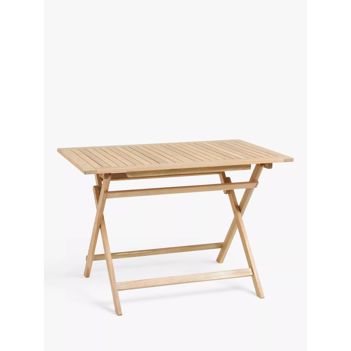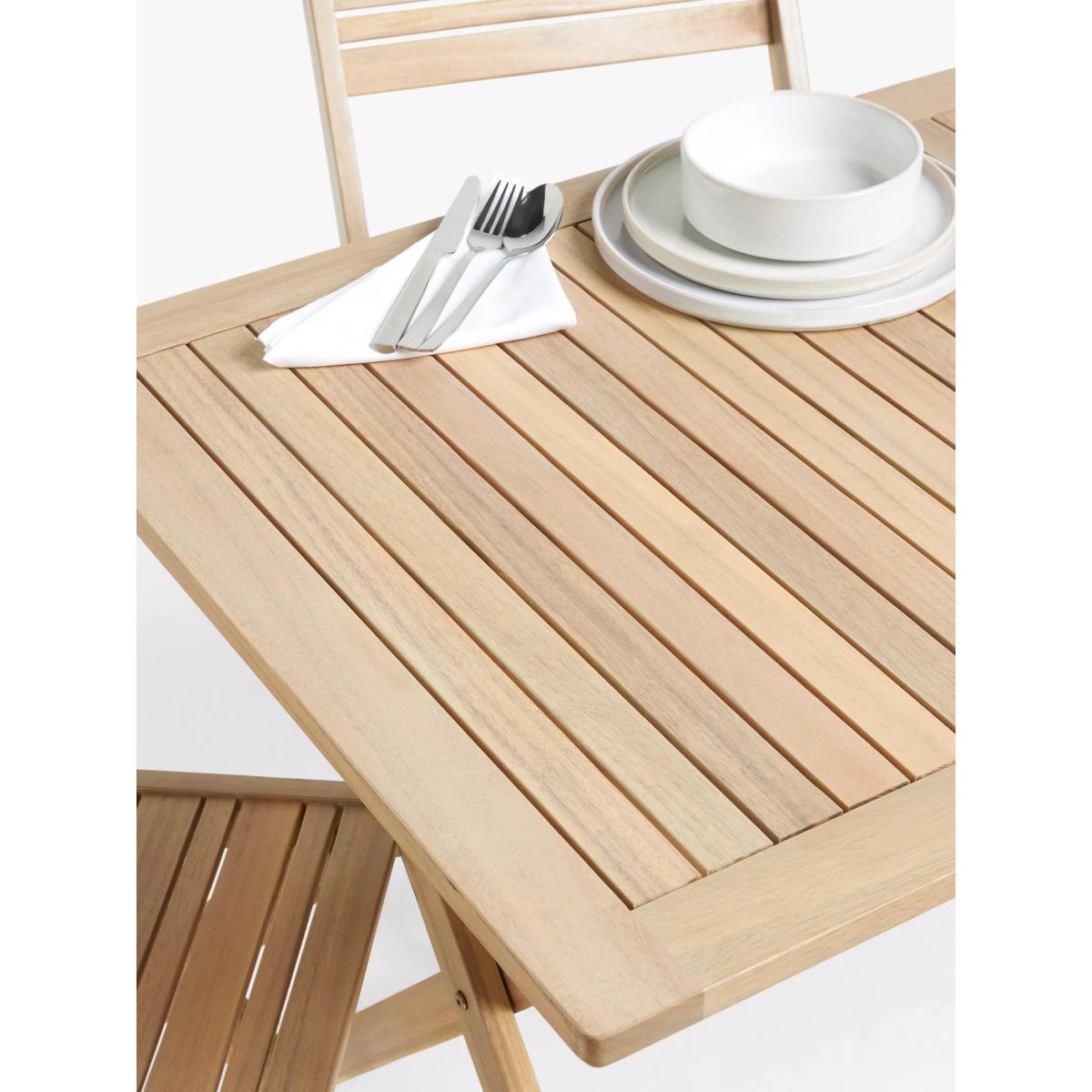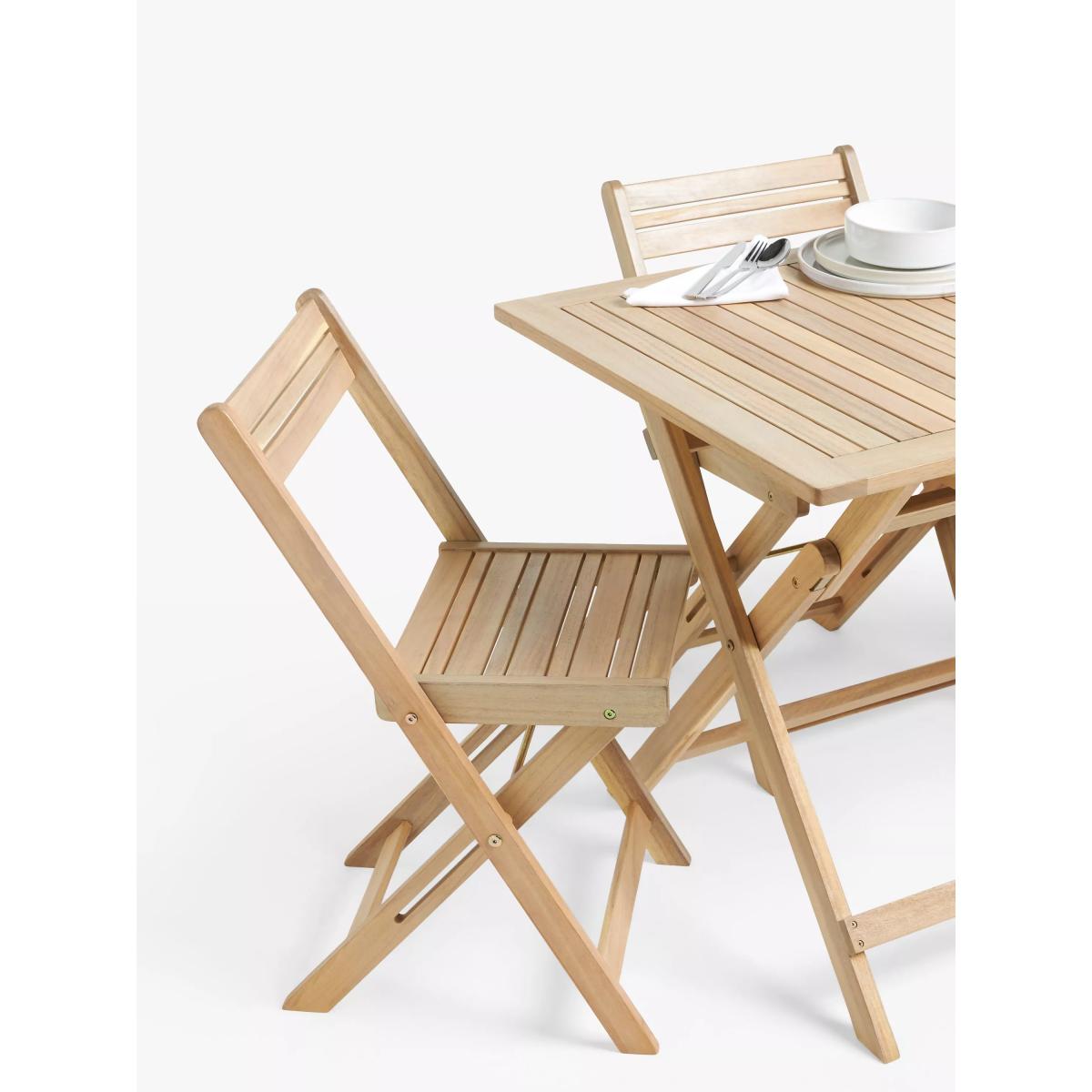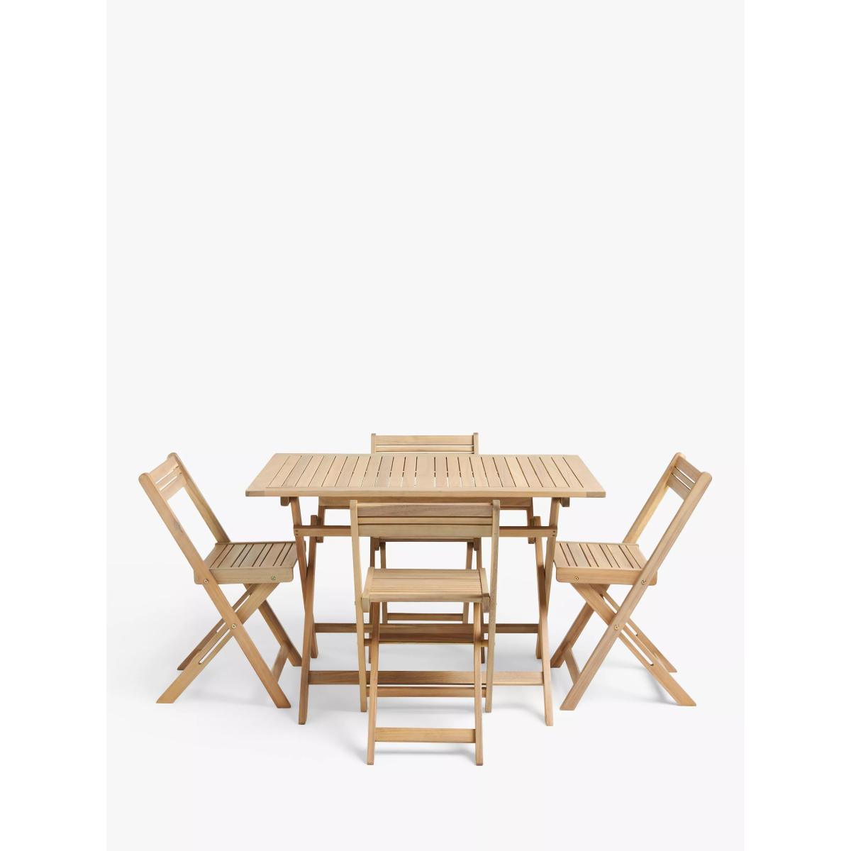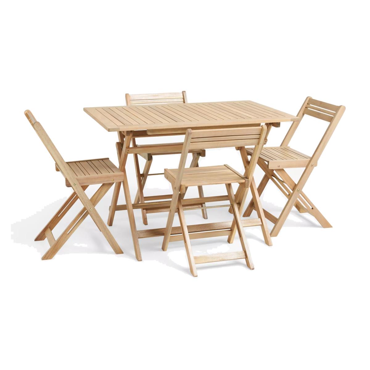 Acacia wood garden dining set, a foldable design for compact storage. This set includes four chairs and a rectangular dining table. All our outdoor wooden furniture ranges are made from sustainably sourced, naturally weather-resistant tropical hardwoods. Seating is rigorously weight-tested, ensuring stability and strength. Key features: Four garden chairs and a rectangular dining table Foldable design for compact storage Naturally weather-resistant acacia wood Part of our ANYDAY Acacia Wood range of garden furniture Garden furniture care: To keep your outdoor furniture in the best condition, store it in a cool, dry, well-ventilated spot indoors over the winter. If it's staying outside, use an outdoor furniture cover whenever the weather is wet or unseasonal. Make sure furniture is clean and dry before storing it away. Choose the perfect outdoor furniture We have a selection of wooden furniture for you to choose from which will suit the home or garden. Below are a few options to consider when choosing your perfect outdoor furniture. TeakA premium and popular wood with an attractive appearance which ages beautifully. Strong, durable and resistant to rot and decay, this furniture requires little maintenanceEucalyptusDistinctive scent and appearance which darkens as it ages. Provides similar natural benefits to teak including moisture resistance, hardness and durability. It's plentiful in supply which makes the furniture an inexpensive choice. AcaciaNaturally durable, this wood is incredibly hard and is unlikely to suffer damage during everyday use. It provides similar natural benefits to teak, yet unlike many other hardwoods, acacia is also relatively fast growing which minimises the environmental impact.