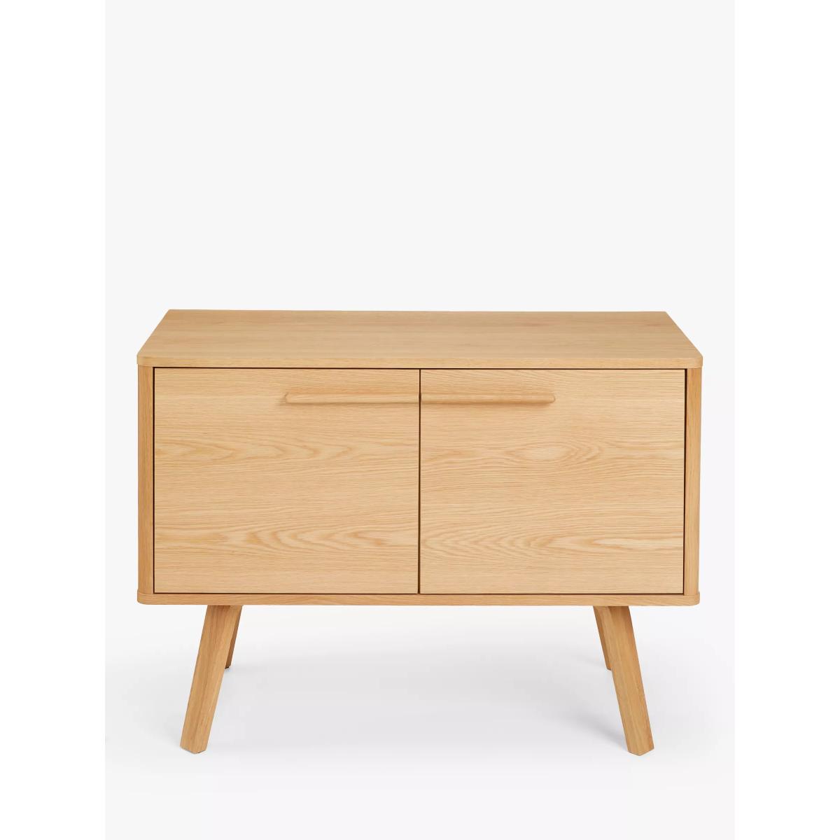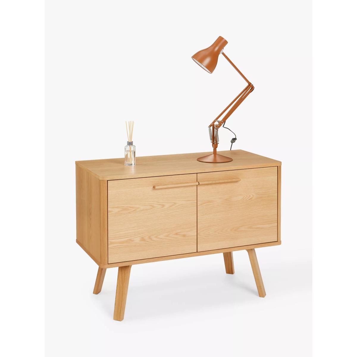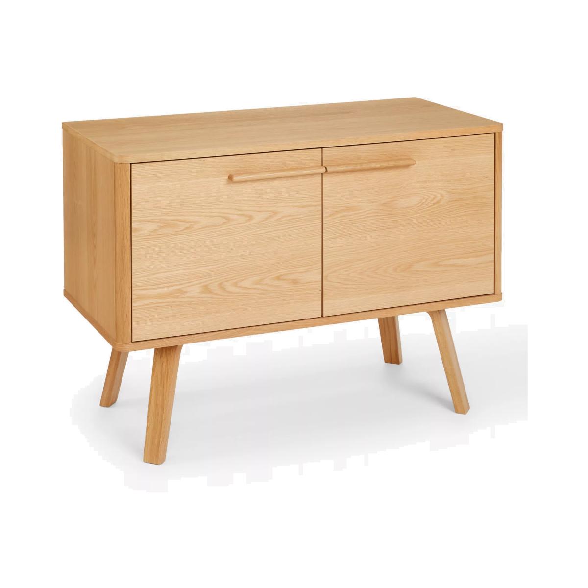 This compact, oak veneer sideboard offers relaxed mid-century styling, with classic splayed legs that are set under the base and linear handles that meet in the centre, sweeping a line across the front of the piece to give the simple profile an elegant focal point. With 2 adjustable shelves, it provides plenty of storage space in a small footprint and comes with two cable holes at the back so you can use it for TVs or other media devices, too. Want to see it first? You may want to see and get a feel for the furniture in one of our shops before ordering. We'll be able to tell you where the range you'd like to view is on display. With great prices and great design, our new brand offers style and quality for modern living today. Whatever you need, there's joy to be found in ANYDAY.