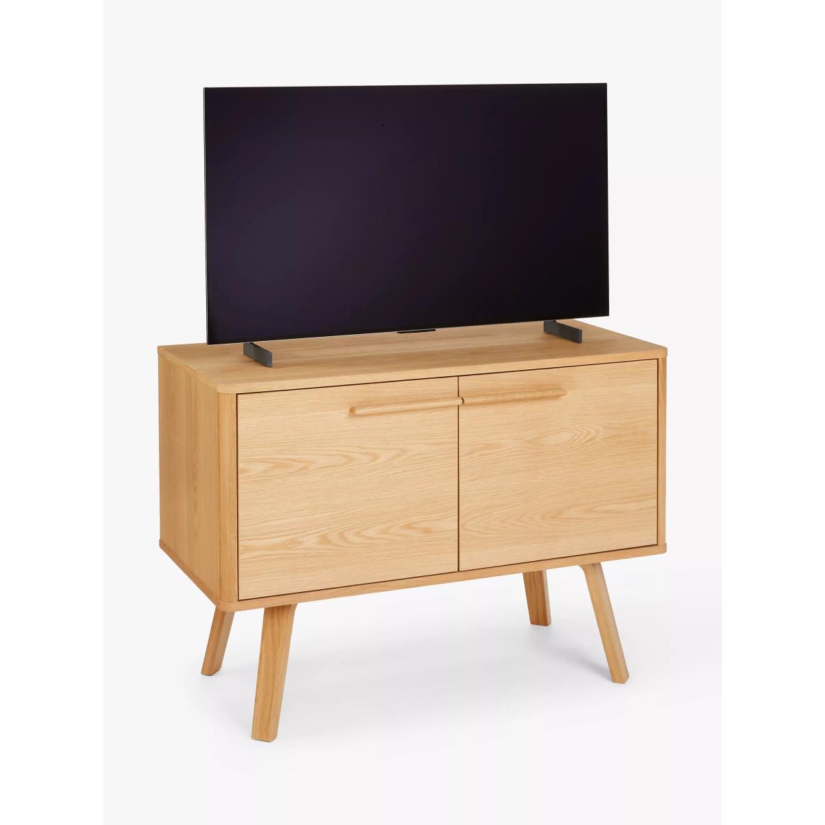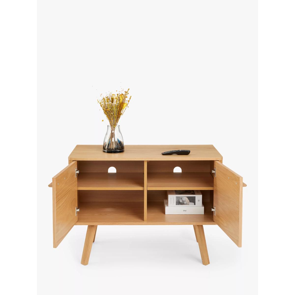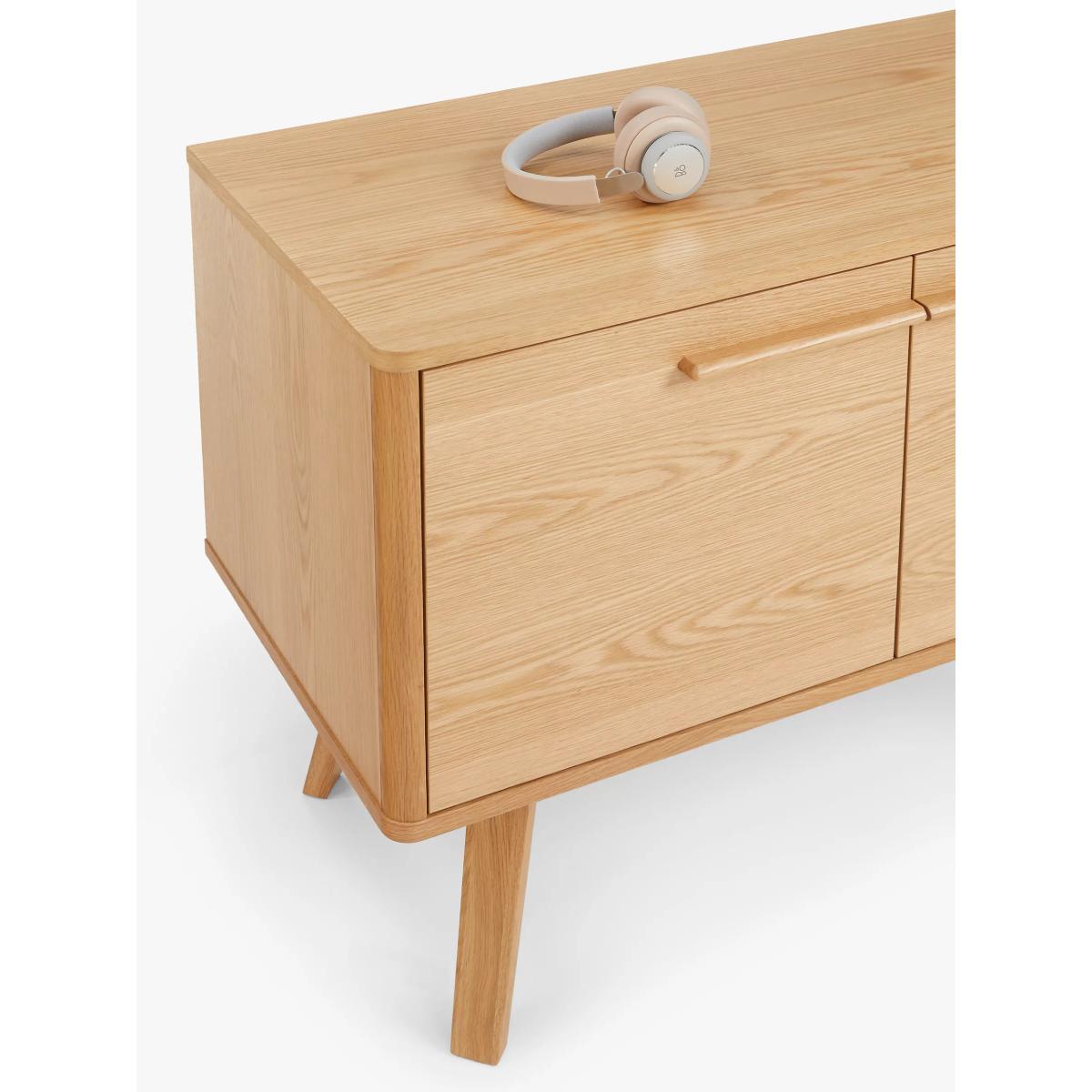 This compact, oak veneer sideboard offers relaxed mid-century styling, with classic splayed legs that are set under the base and linear handles that meet in the centre, sweeping a line across the front of the piece to give the simple profile an elegant focal point. With 2 adjustable shelves, it provides plenty of storage space in a small footprint and comes with two cable holes at the back so you can use it for TVs or other media devices, too. Want to see it first? You may want to see and get a feel for the furniture in one of our shops before ordering. We'll be able to tell you where the range you'd like to view is on display. With great prices and great design, our new brand offers style and quality for modern living today. Whatever you need, there's joy to be found in ANYDAY.