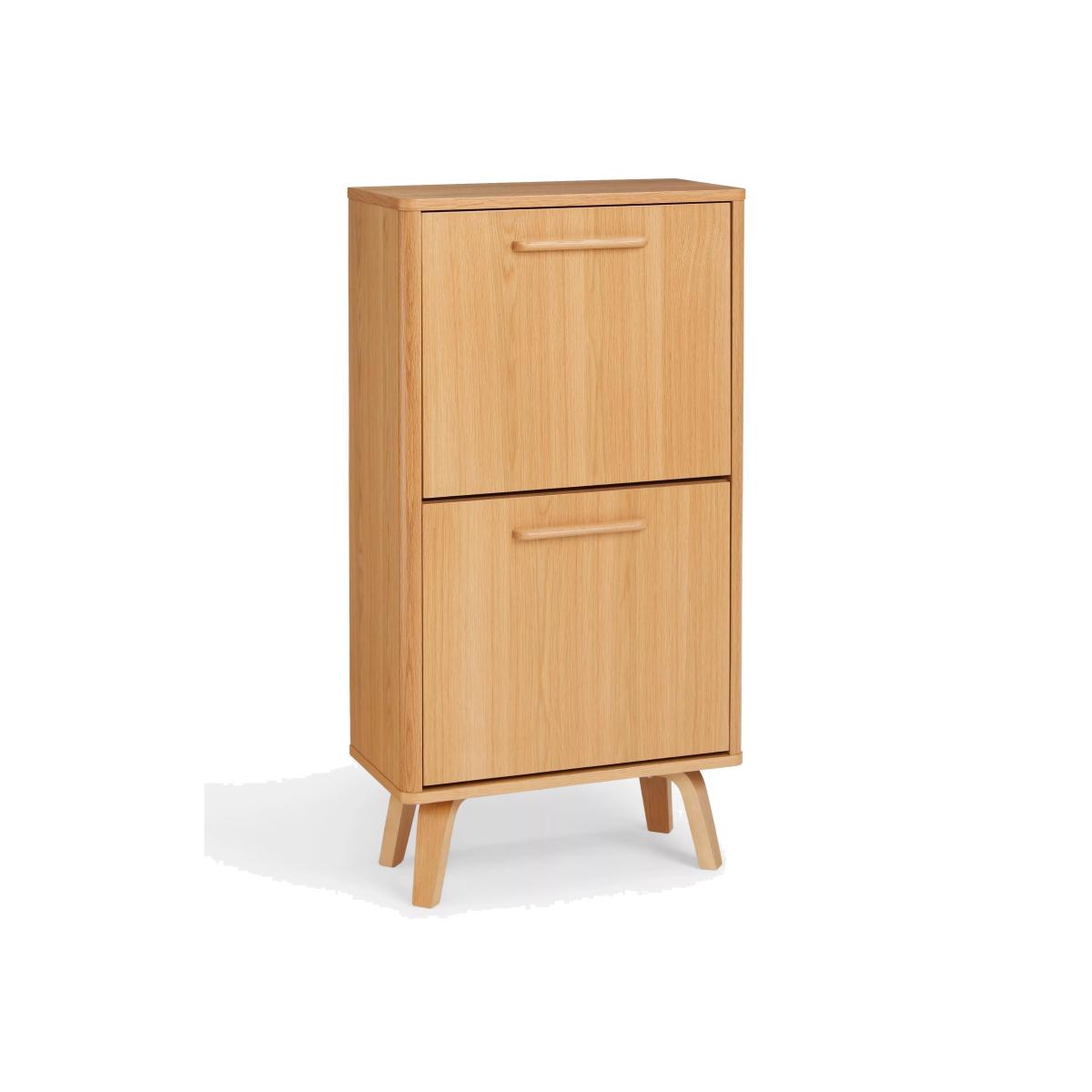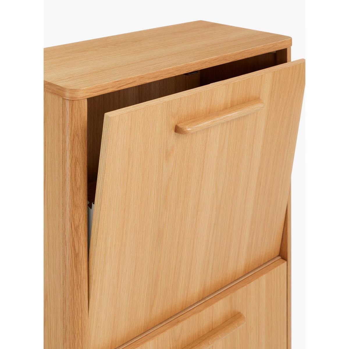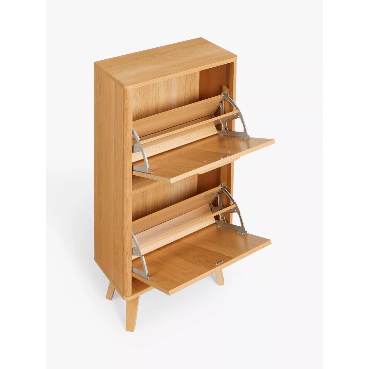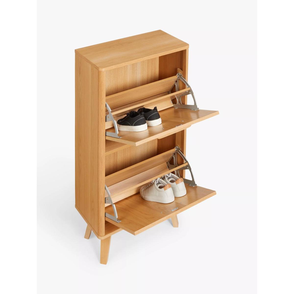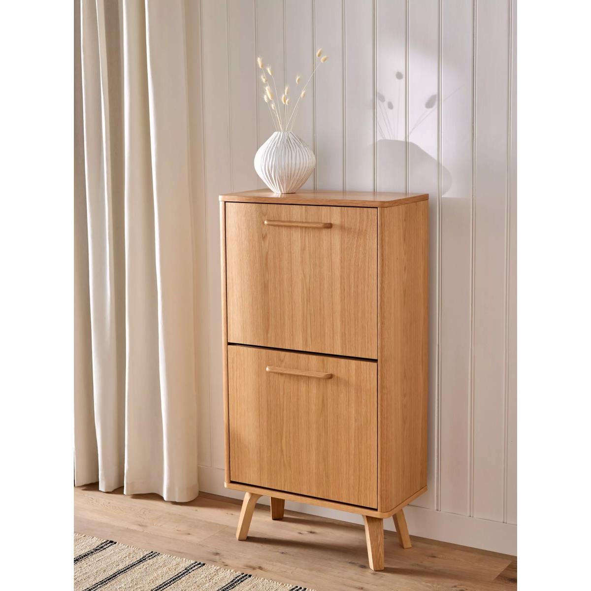 This oak veneer shoe storage unit offers relaxed mid-century styling, with classic splayed legs that are set under the base and linear handles that meet in the centre, sweeping a line across the front of the piece to give the simple profile an elegant focal point. Each section pulls down to store all your footwear, while the top can be used for display. Want to see it first? You may want to see and get a feel for the furniture in one of our shops before ordering. We'll be able to tell you where the range you'd like to view is on display. With great prices and great design, our new brand offers style and quality for modern living today. Whatever you need, there's joy to be found in ANYDAY.