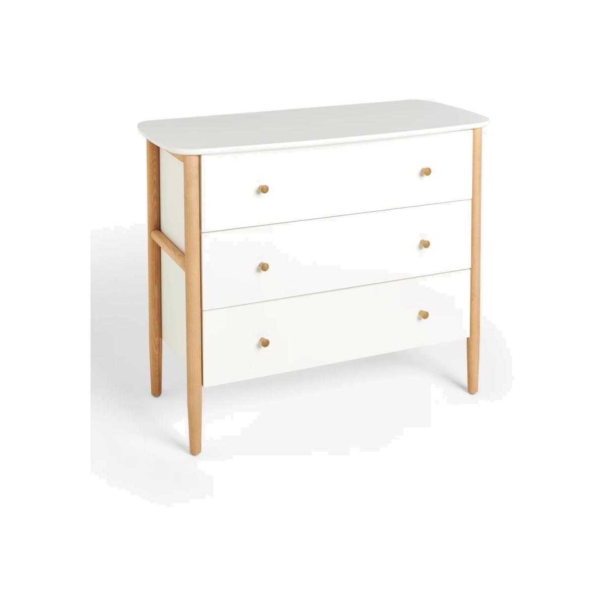 I love this chest as it offers a clean, modern look with its white finish contrasted by natural wood accents, making it incredibly versatile. It works well in contemporary, Scandinavian, or minimalist interiors, but can also soften more rustic or coastal styles. Practical styling tips include pairing it with neutral or pastel colours for a calming vibe, or adding textured accessories like woven baskets or patterned textiles for visual interest. It’s perfect for bedrooms, nurseries, or even as additional storage in living areas. The three drawers provide ample space for organisation, and the simple design makes it a timeless piece that can adapt as your space evolves.