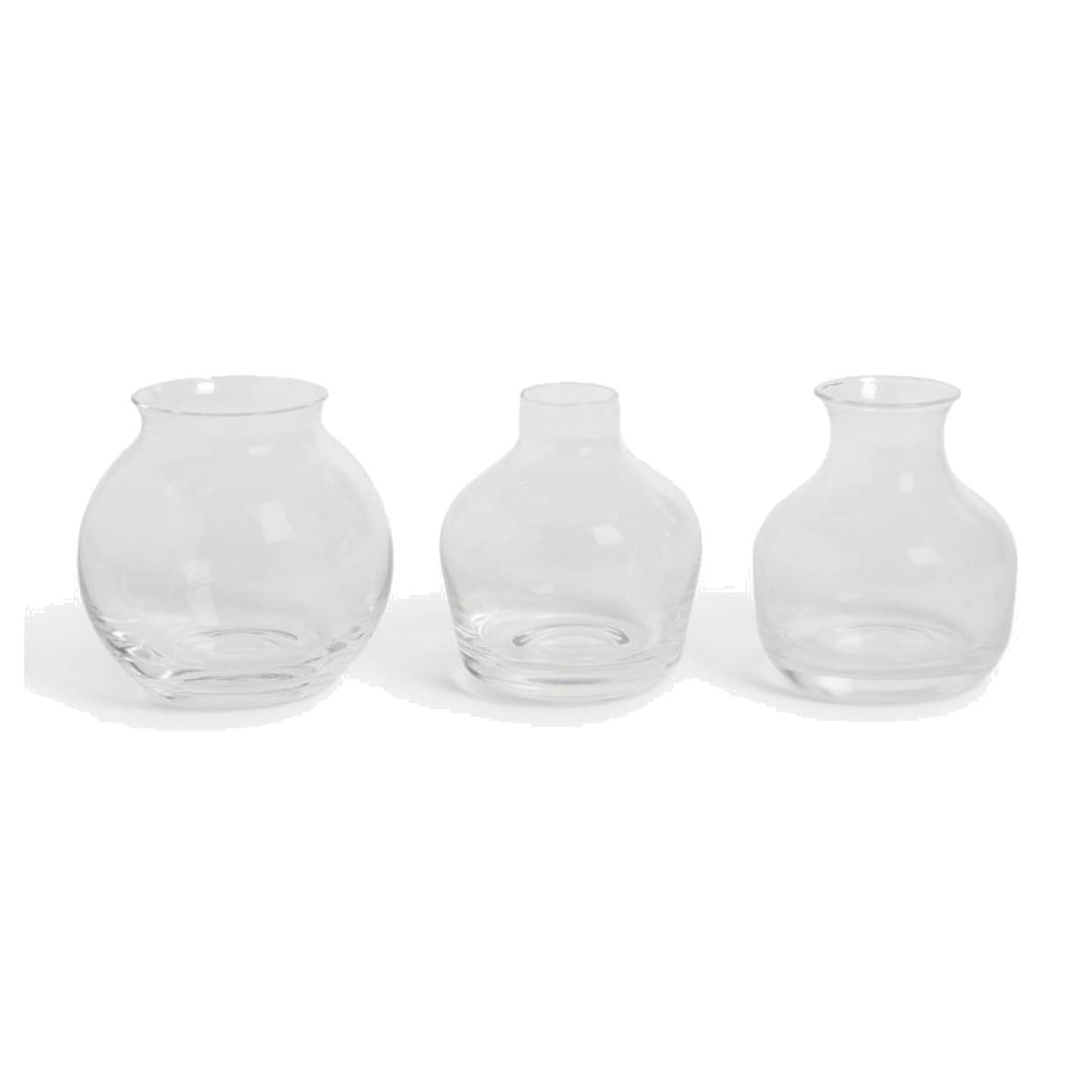 Trio of stem and bud glass vases in different shapes. Ideal for displaying together with single stem arrangements or other simple arrangements.