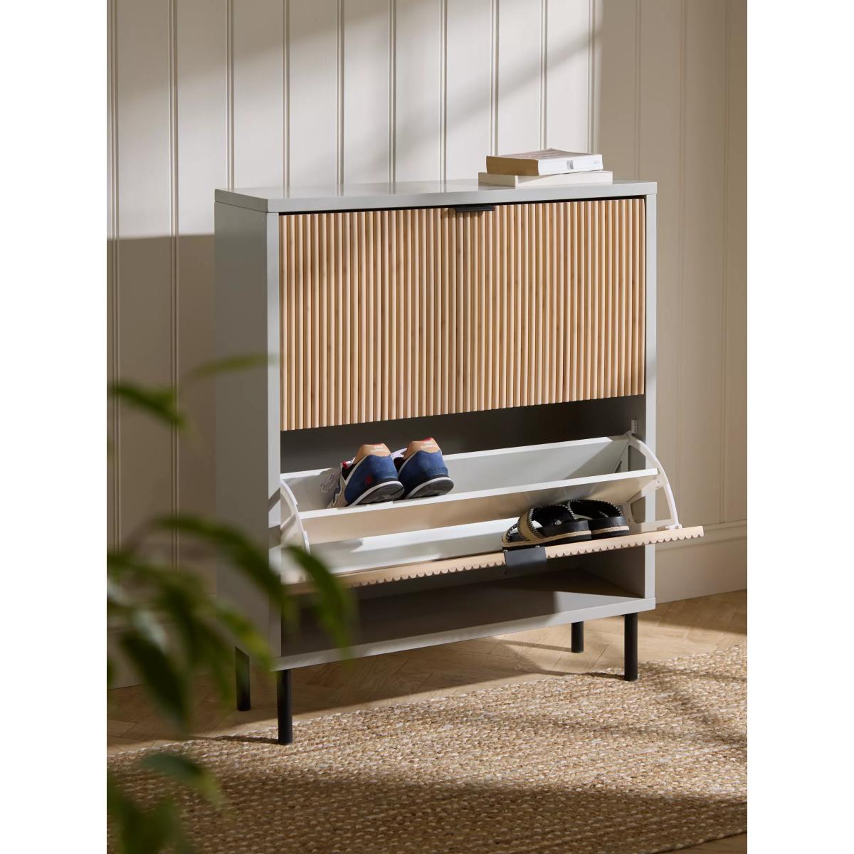 I really rate this Ridge shoe rack for its clean lines and clever use of texture - the black frame teamed with slatted timber fronts brings a subtle Scandi touch without feeling fussy. It’s ideal in a hallway or under-stair space where you need to tuck shoes out of sight yet still keep them to hand. To style it, group a slim ceramic tray and a small plant on top to catch keys and loose change, then hang a round mirror or simple coat hooks above for a coordinated drop zone. Because it’s so neutral, it slots effortlessly into contemporary, minimalist or even industrial schemes - just pop a woven basket alongside for umbrellas or scarves to complete the look.