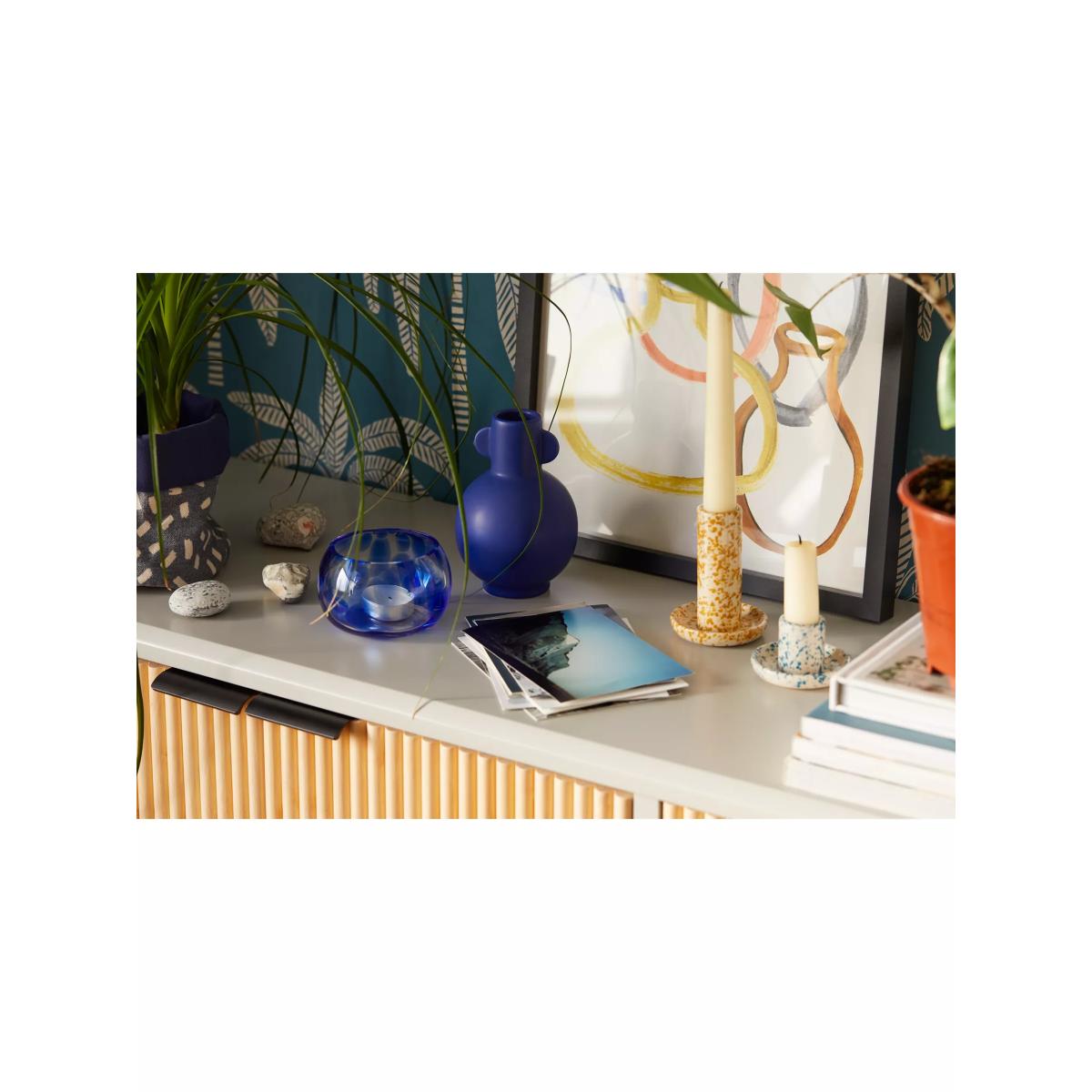 I love this tealight holder for its vibrant blue colour and contemporary design, making it a versatile piece for a variety of interiors. It works particularly well in modern or coastal-style spaces, where its bold hue can add a pop of colour and visual interest. Practical styling tips include grouping it with other glassware or metallic accents to create a layered look, or using it as a statement piece on a mantle, side table, or dining table. Its rounded shape and playful pattern also mean it pairs nicely with neutral or minimal décor, giving any space a relaxed yet stylish vibe.