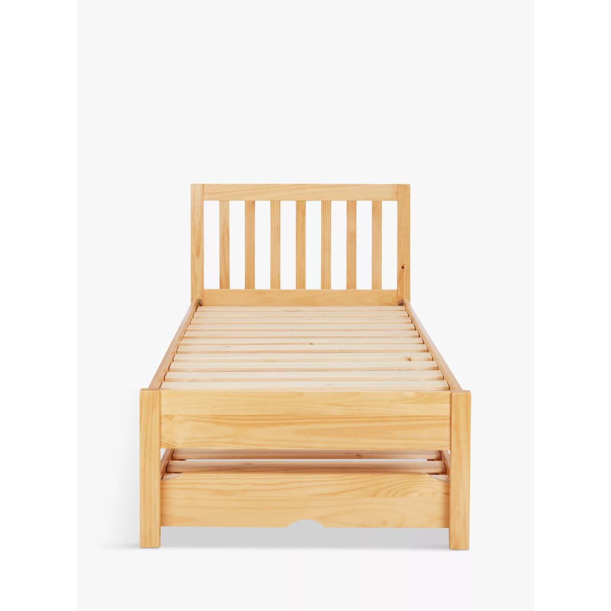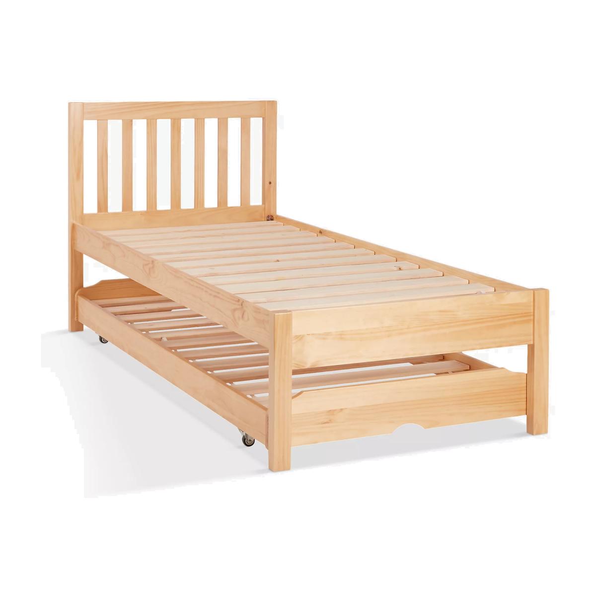We've designed this useful bed frame with a trundle base that can be expanded to the height of the main frame. Ideal for hosting guests, it's easy to assemble and made from hard-wearing pine wood, with solid slats in the base of both frames providing a firm foundation for your mattresses. The trundle frame is easy to pull-out and it stores neatly underneath the main frame when not in use. Available in a Natural finish which highlights the real knots and grains in the wood, or in a painted finish for a cleaner, more modern look. The mattress for the trundle bed must not exceed 20cm in depth. Want to see it first? You may want to see and get a feel for the furniture in one of our shops before ordering. We'll be able to tell you where the range you'd like to view is on display. With great prices and great design, our new brand offers style and quality for modern living today. Whatever you need, there’s joy to be found in ANYDAY.