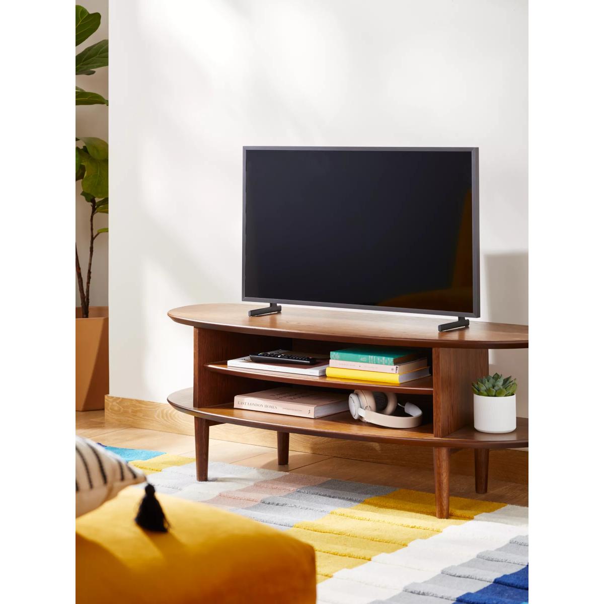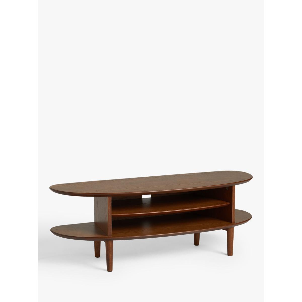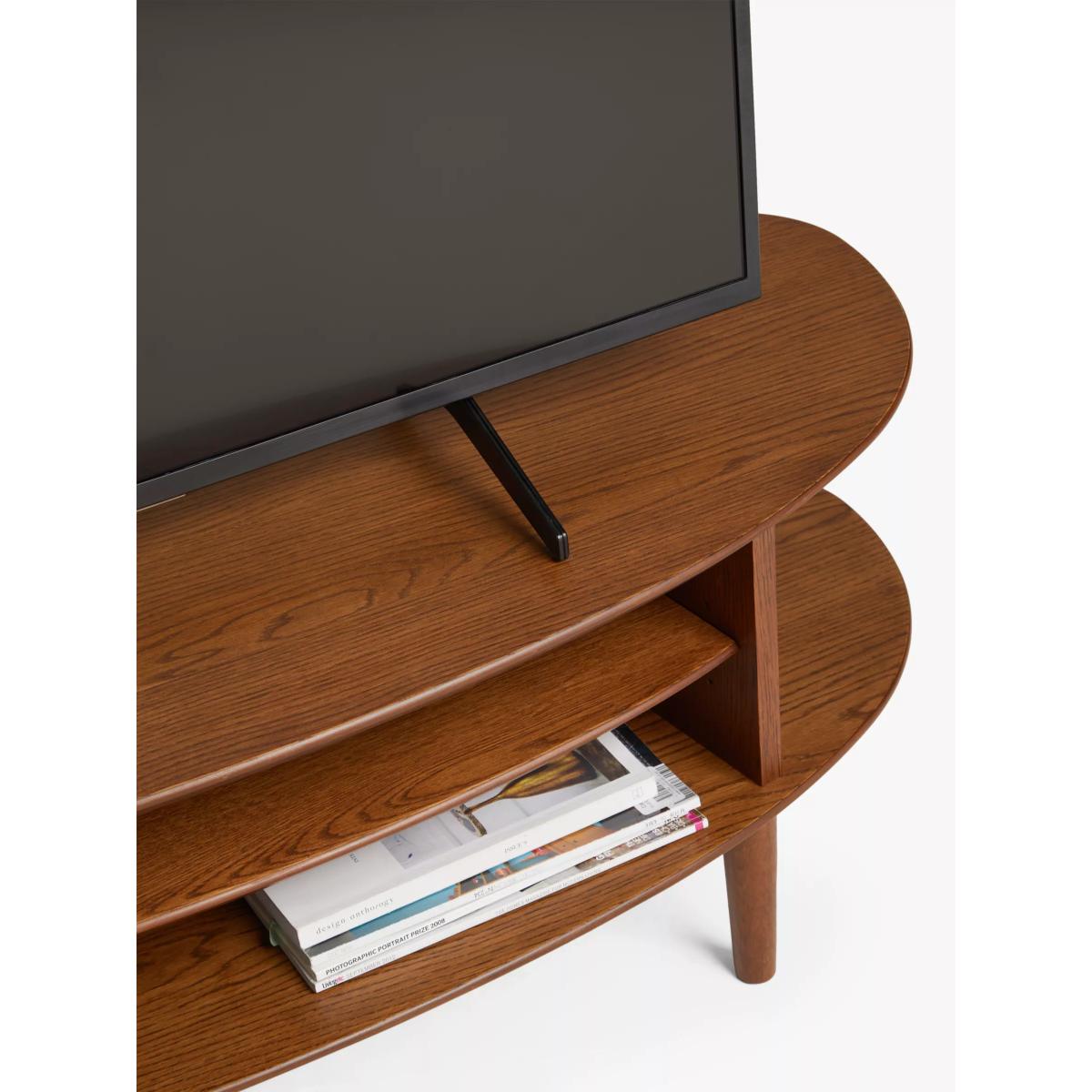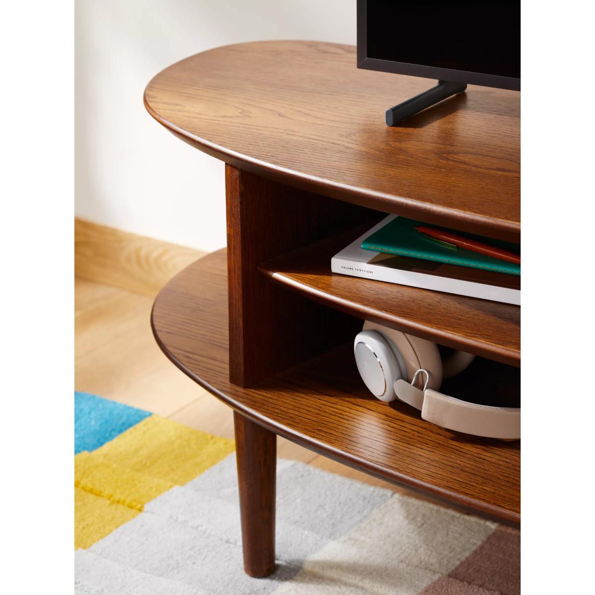 Functional furniture with a sculptural twist. Our in-house designers created this TV stand with a focus on distinctive shapes and warm, natural materials. It's made from a combination of solid oak, high-quality MDF and birch wood and its smooth, rounded shape provides two levels of storage space. One shelf is fixed, the other adjustable, and there's a hole at the back to neatly feed-through cables. With spindle-shaped, tapered legs and a choice of finishes, this practically-sized TV stand is perfect for your modern home. Want to see it first? You may want to see and get a feel for the furniture in one of our shops before ordering. We'll be able to tell you where the range you'd like to view is on display. With great prices and great design, our new brand offers style and quality for modern living today. Whatever you need, there’s joy to be found in ANYDAY.