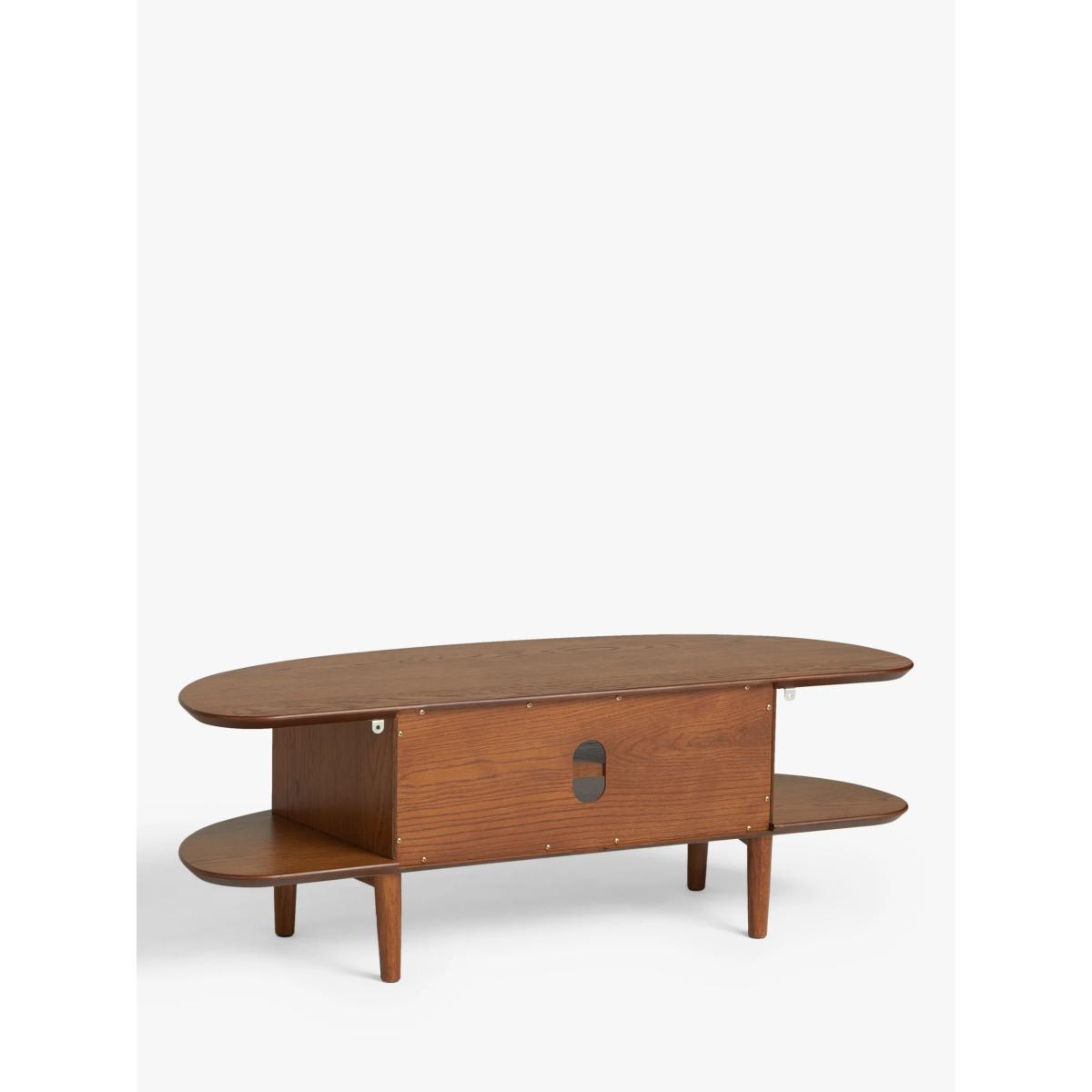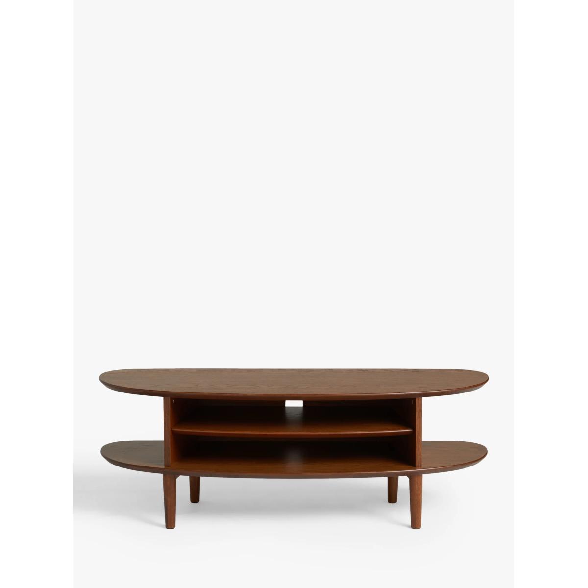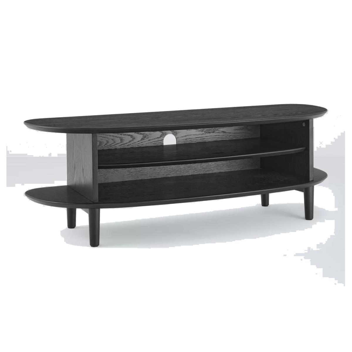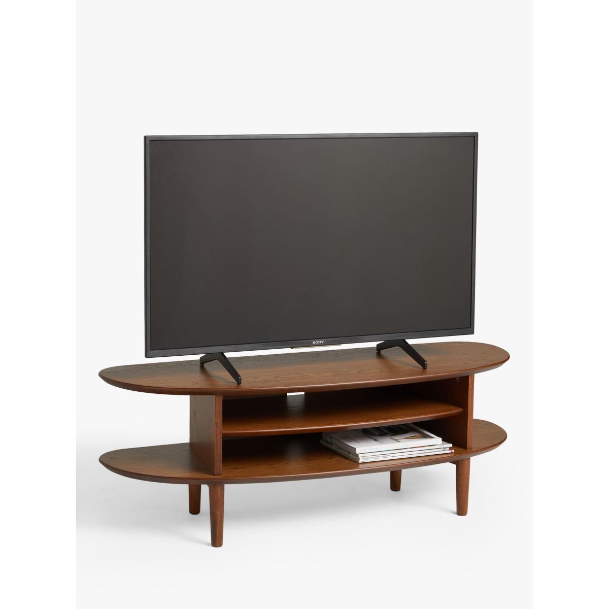 Functional furniture with a sculptural twist. Our in-house designers created this TV stand with a focus on distinctive shapes and warm, natural materials. It's made from a combination of solid oak, high-quality MDF and birch wood and its smooth, rounded shape provides two levels of storage space. One shelf is fixed, the other adjustable, and there's a hole at the back to neatly feed-through cables. With spindle-shaped, tapered legs and a choice of finishes, this practically-sized TV stand is perfect for your modern home. Want to see it first? You may want to see and get a feel for the furniture in one of our shops before ordering. We'll be able to tell you where the range you'd like to view is on display. With great prices and great design, our new brand offers style and quality for modern living today. Whatever you need, there’s joy to be found in ANYDAY.