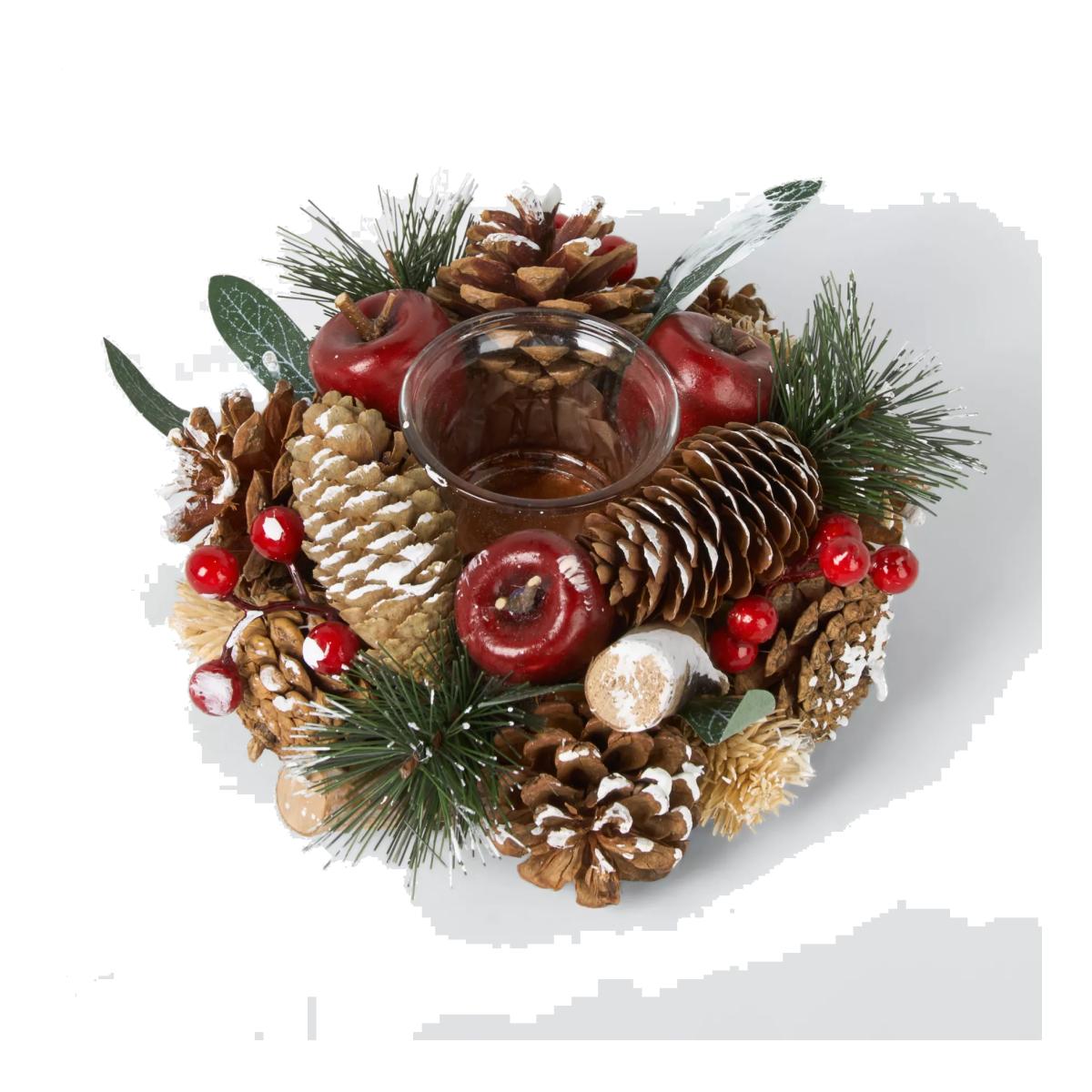 This single tealight holder is made from natural pine cones and trimmed with sprigs, apples and red berries. Tealight not included.