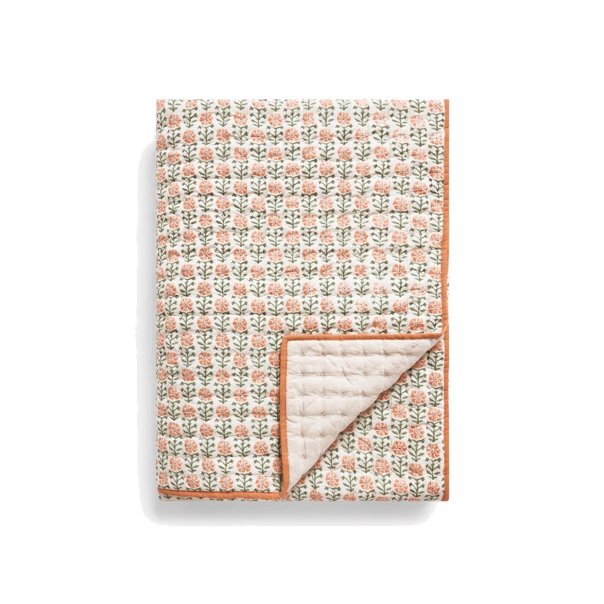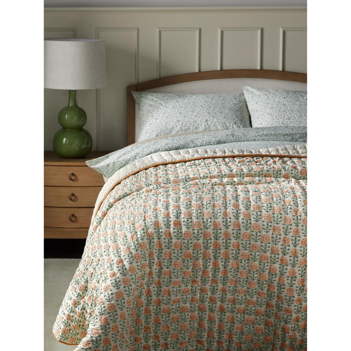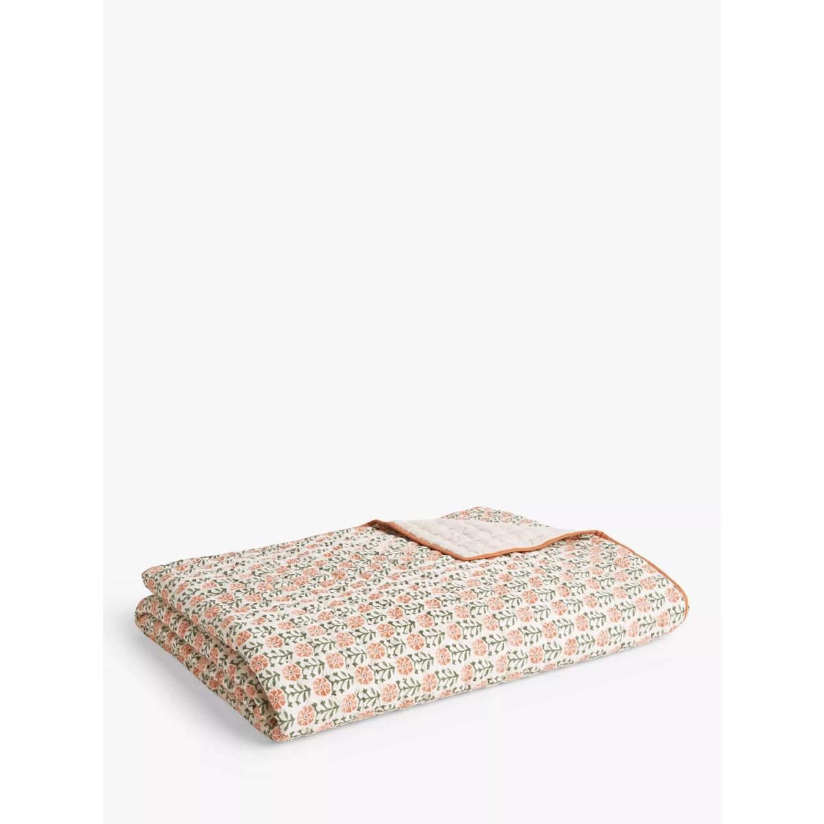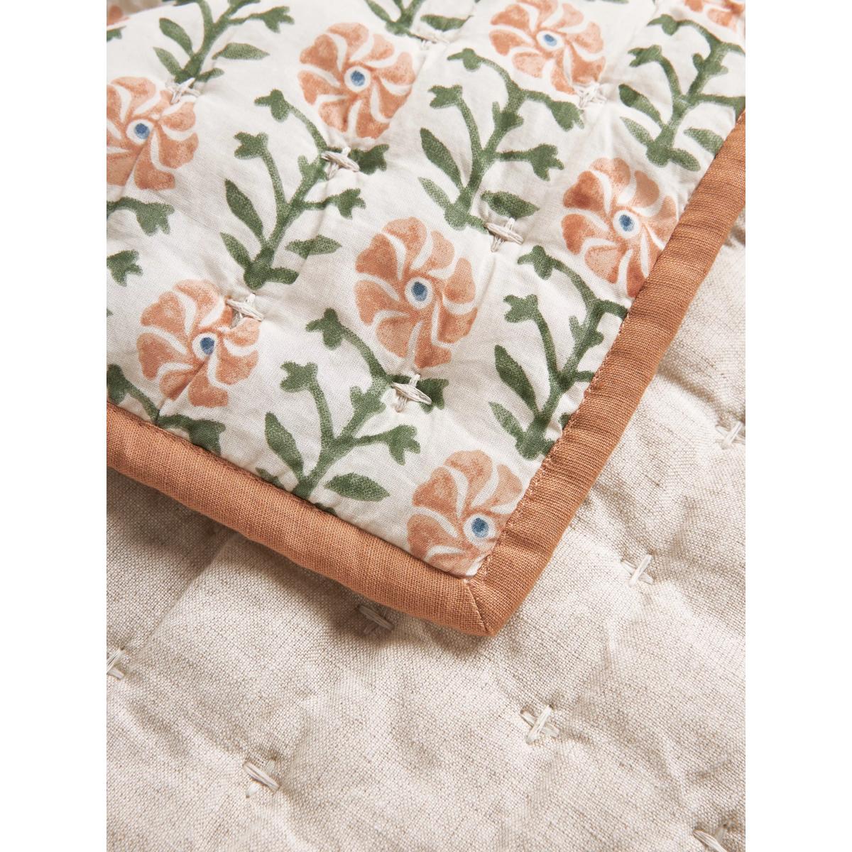 A lightly hand-quilted floral bedspread with a plain backing made from 100% linen. Choose from shades of warming terracotta or cool blue to suit your bedroom style. Both are reversible. 220 x 220 is recommended for double and kingsize beds. Better Cotton By choosing our cotton products, you’re supporting our investment in Better Cotton’s mission to help cotton communities survive and thrive while protecting and restoring the environment. Better Cotton Farmers are farmers who care for the environment and respect workers’ rights and wellbeing. This product is sourced via a system of mass balance and therefore may not contain Better Cotton. bettercotton.org/massbalance