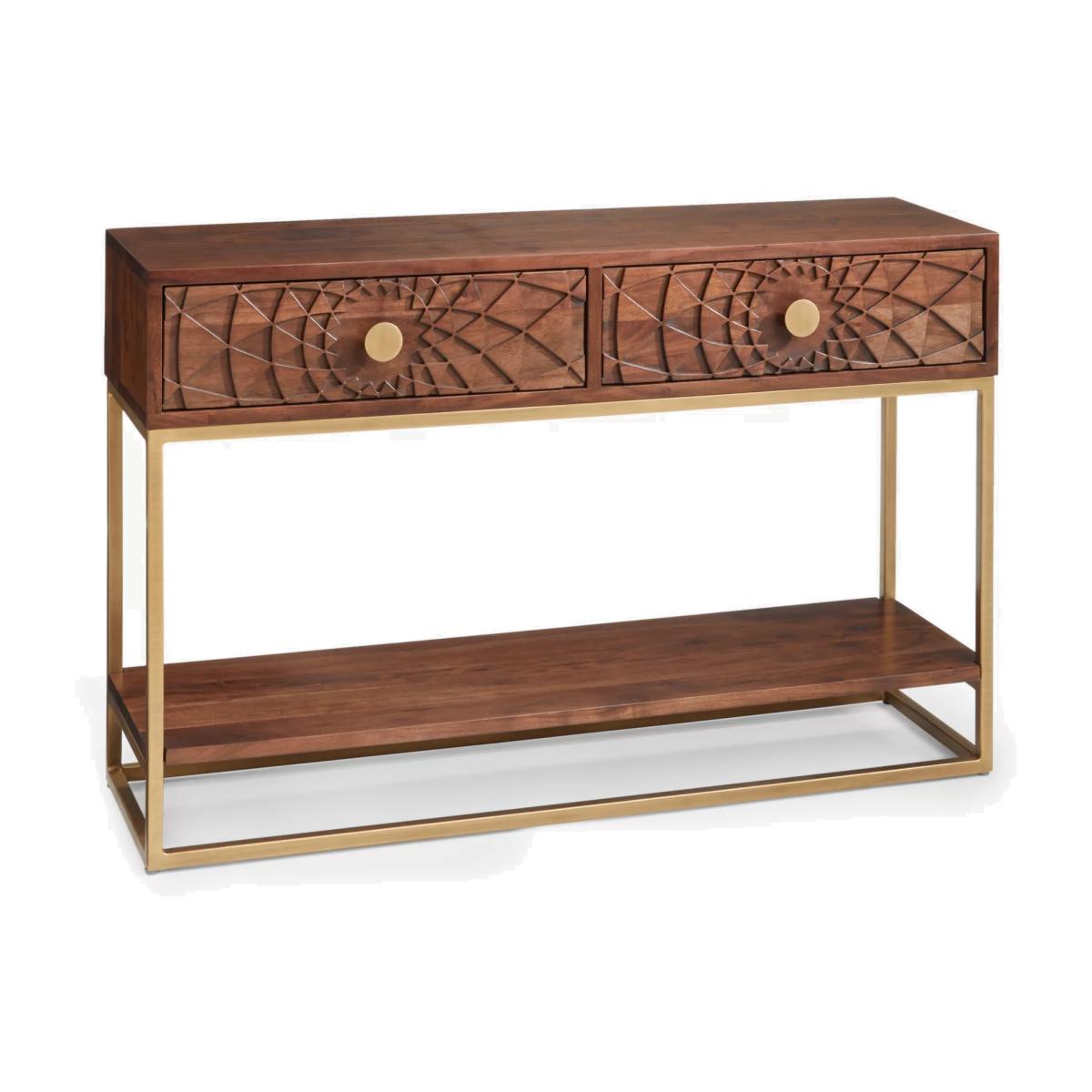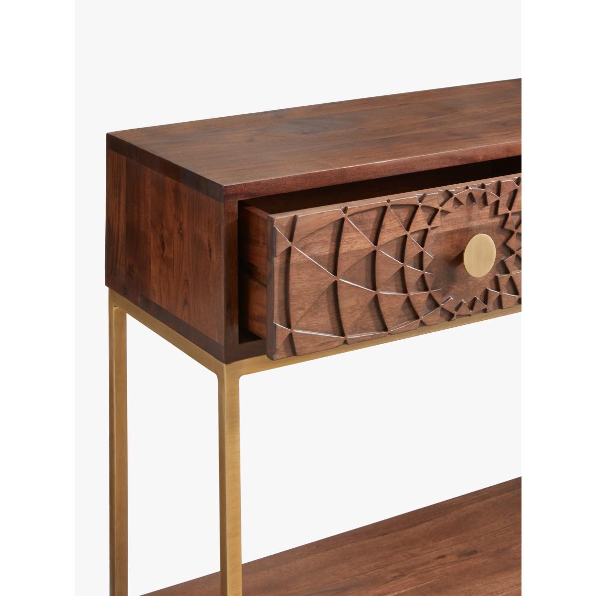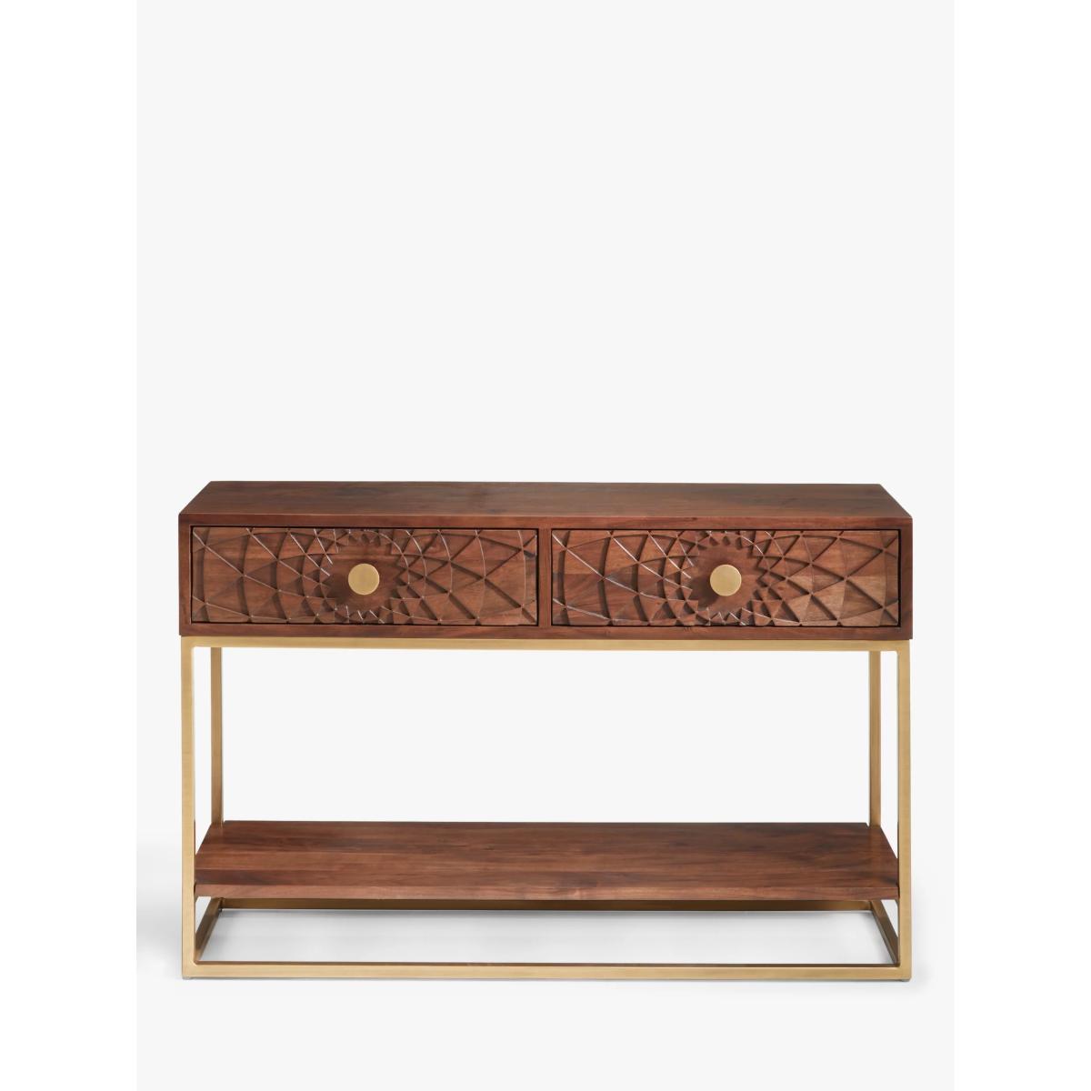 The allure of our Array console table comes from the beautiful mandala pattern, carefully carved into the two drawer doors. Made from solid acacia wood with MDF for support, our in-house designers created this functional table into a bold and beautiful piece that becomes a focal point in any hallway or living room. It's finished with a robust steel frame and drawer handles in a brass finish and a long open shelf underneath for added storage. Want to see it first? You may want to see and get a feel for the furniture in one of our shops before ordering. We'll be able to tell you where the range you'd like to view is on display.