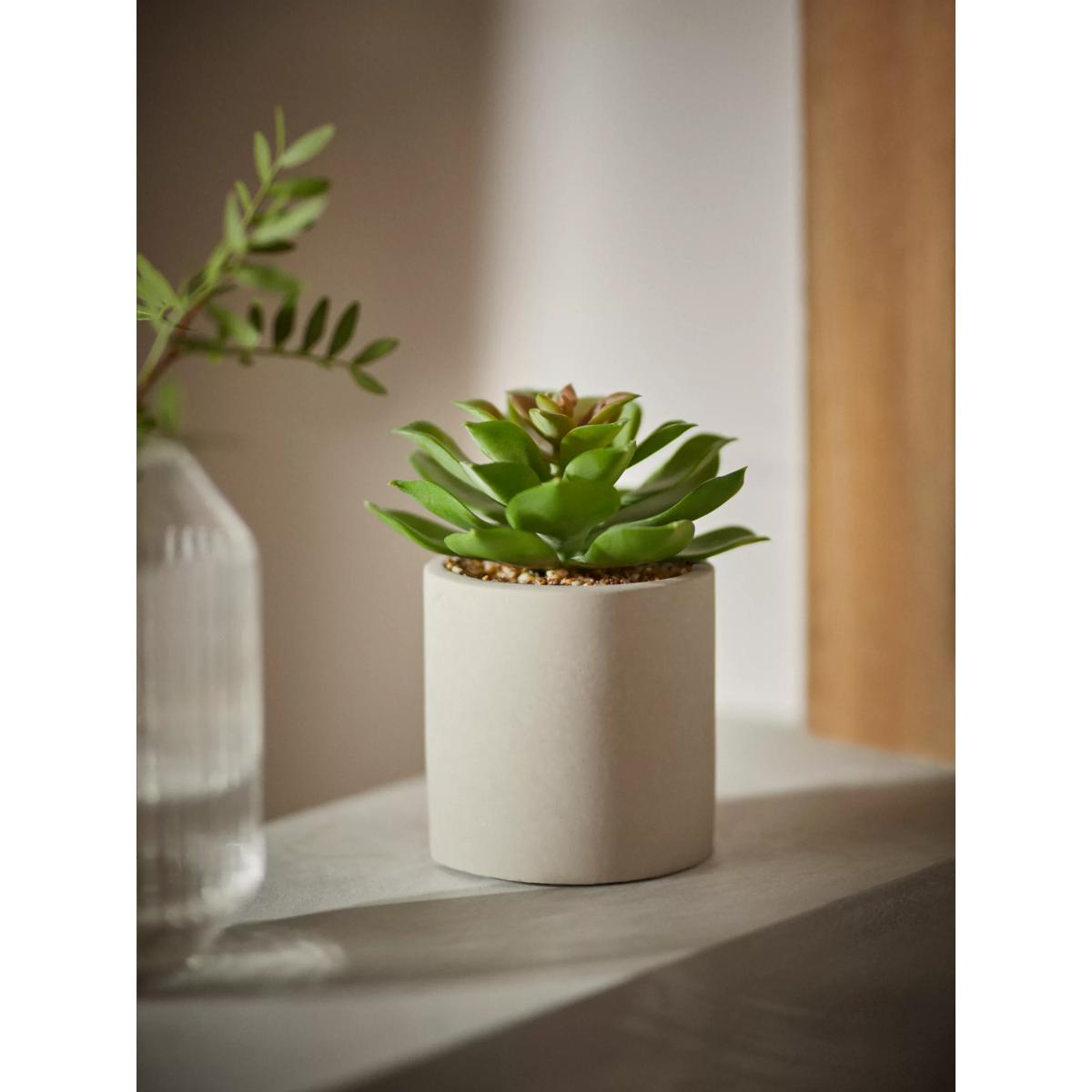 I really like this artificial succulent because it offers a low-maintenance touch of greenery that fits quite seamlessly into many interior styles. It works particularly well in modern or minimalist spaces where clean lines and understated decor are key. The concrete pot gives it an industrial edge, making it versatile for urban or contemporary settings, but it also pairs nicely with natural textures like wood or rattan for a softer, more layered look. For styling tips, try grouping it with other small plants in different textures or colours to add interest or place it on a shelf or side table to bring a subtle hint of nature indoors without the upkeep of real plants.