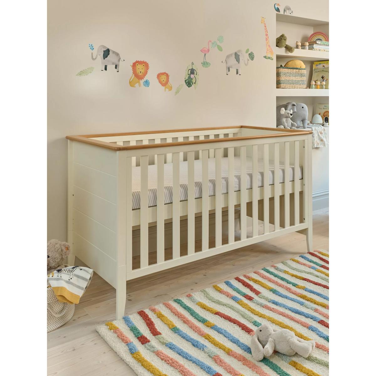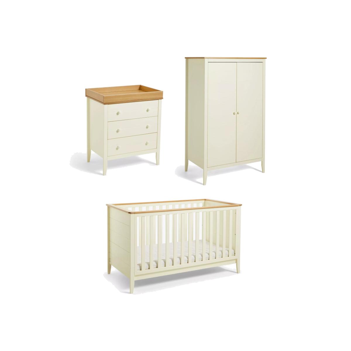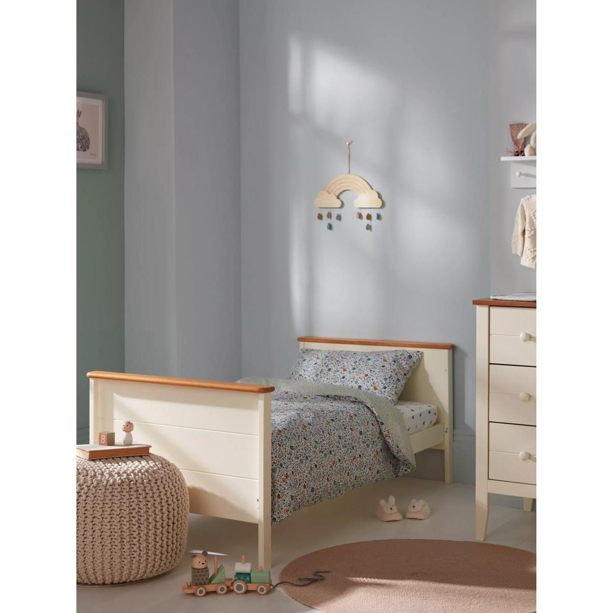 Get your nursery sorted with this cotbed and dresser bundle from our Avery range. The sleek contemporary style of the range combines painted and natural wood for a look that works with most nursery themes. Thoughtfully designed, the Avery cotbed is the perfect sleep space for your little one from birth until well into their toddler years. With 3 base heights you can adjust the cot as they grown and even convert it to a toddler bed when they're ready. Suitable from birth, this cotbed requires a standard 140 x 70cm mattress with a maximum thickness of 12cm (sold separately). The cotbed complies with safety standards EEN 716-1:2017+AC:2019 & EN 8509:2008+A1:2011. The contemporary, understated dresser features a handy nappy changing area to the top and three drawers for easy storage. This item complies to EN 12221-1:2018+A1:2013 safety regulations. We've made the spacious double wardrobe from high-quality solid pine, MDF and veneers. There's a metal hanging rail inside and a dividing storage shelf in the middle. Good to know: The changing unit is suitable from birth until 12 months or 11 kg. Please note: a changing mat is not provided. This changing unit is suitable for a changing mat measuring up to 735 x 480 x 50mm. Please place changing mat within the barriers located at the top of the changing unit. WARNING: Do NOT leave your baby unattended on the changing table for any length of time. This changing unit must be fixed to the wall for safe use of the product. The fastenings used should be appropriate to the wall. Please check assembly instructions for further information.