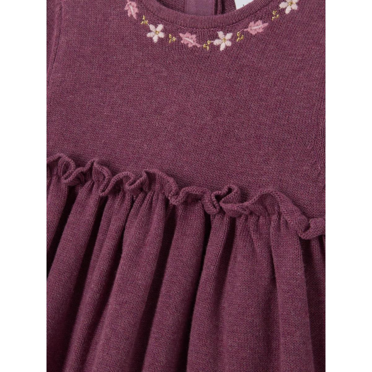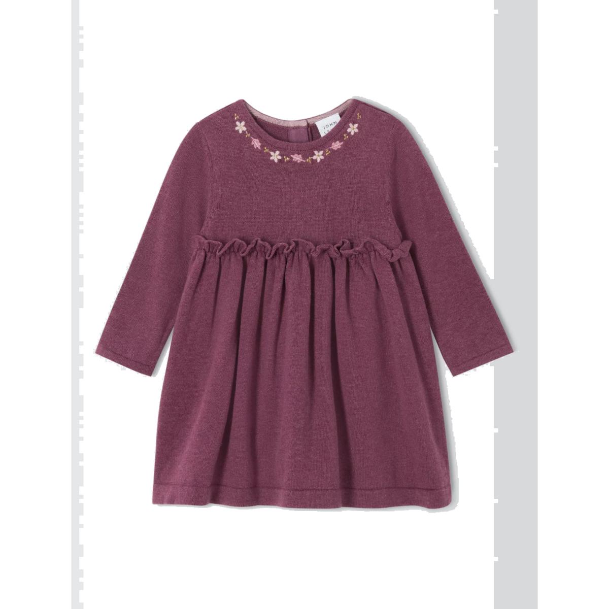 Knitted from super-soft cotton, this dress is decorated with floral embroidery around the round neck and features ruffle detail and long sleeves. Complete with a button fastening at the back.