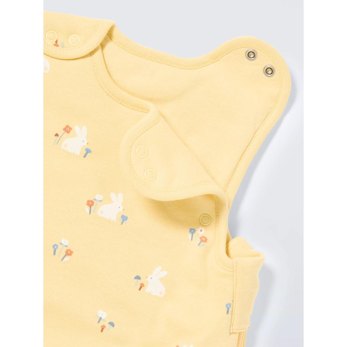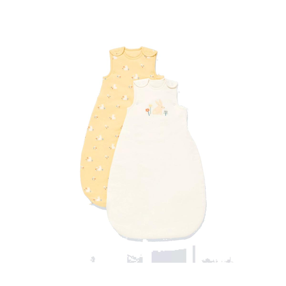 Designed for uninterrupted dreams, our baby sleeping bags have bunny-themed prints making them both a cute and practical choice. Made from breathable, cotton, they help keep little ones warm all night long while being a safer alternative to traditional blankets. The bag has poppers on the top and a zip from the side to the centre bottom that allows for easy dressing. Pair it with other matching items from our nursery range. Sleeping bags are considered to be a safer alternative to traditional blankets. Please note underarm poppers are only available on the size 0-6 months. Choosing the right size: You can start using a sleep bag when your baby weighs more than 8lb 13oz. Your child’s head should not be able to pass through the neck opening when the sleep bag is fastened. Approx. AgeMin. WeightHeight0-6 months4kg/8lbs 13 oz50-65cm6-18 months8.1kg/18lbs65-80cm18-36 months11.4kg/25lbs80-95cm Please note, these are recommendations only as all babies are different. Room Temp. Recommended Tog 24-27 °C 0.5 Tog 20-24 °C 1 Tog 16-20 °C 2.5 Tog 16 °C and below 3.5 Tog