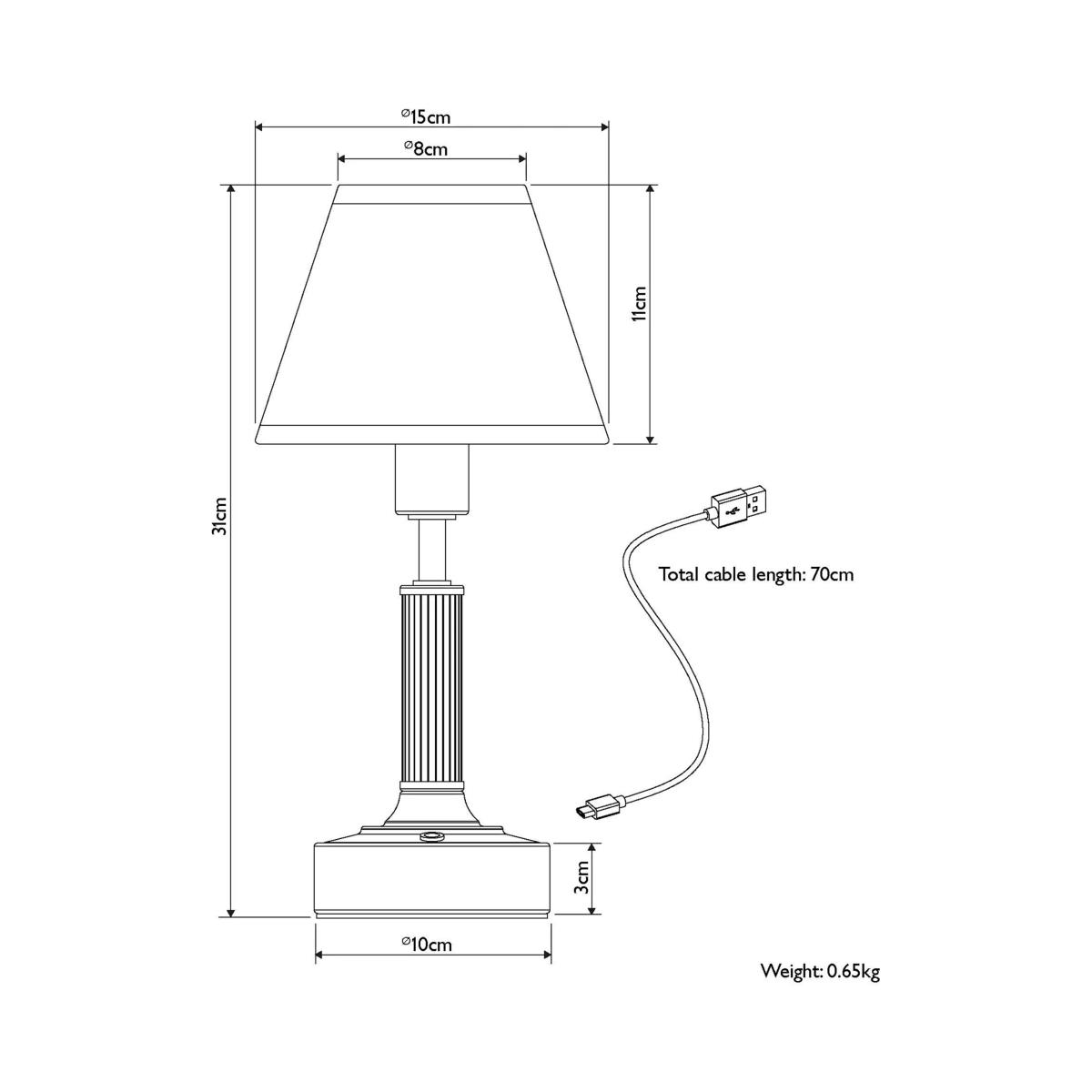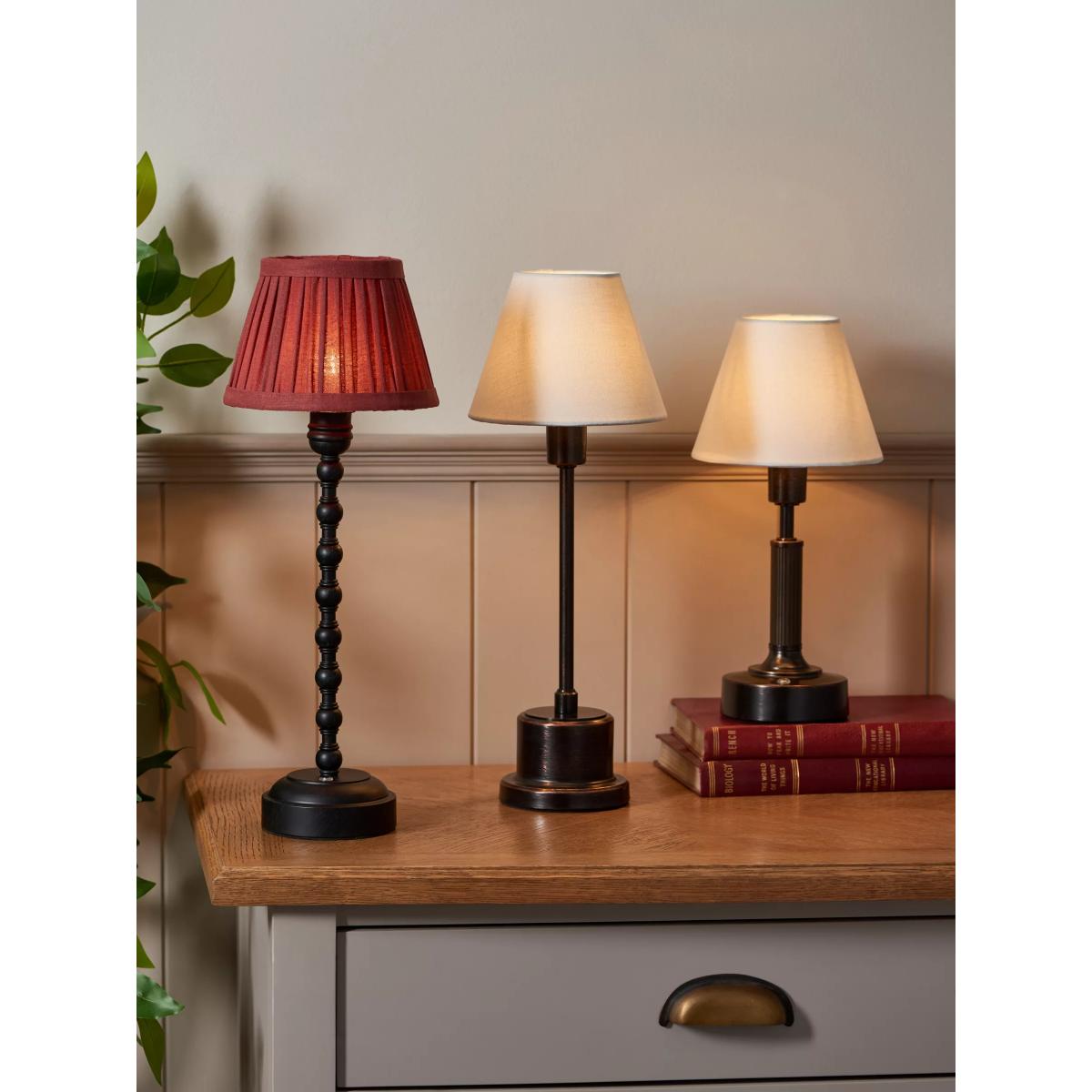 Complete your eclectic sideboard, create a cosy reading corner or inspire some post dinner party conversations with this rechargeable cordless lamp. You can place it wherever suits you. Design features include heritage detailing on the ribbed stand and a warmly lit fabric shade. This LED table lamp has three different brightness settings operated by a touch button. The lamp is USB chargeable and will last for up to eight hours on a full charge. Take it wherever you need it.