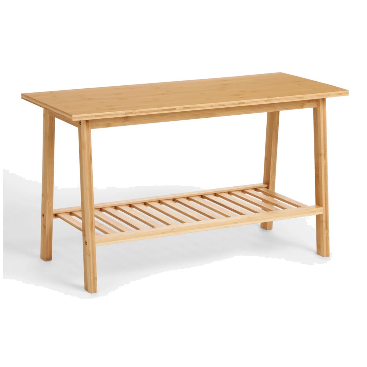 Sturdy shoe bench made of easy-to-maintain bamboo with a lower shelf for keeping shoes. Use the top for storage or take a seat and pull on your footwear.