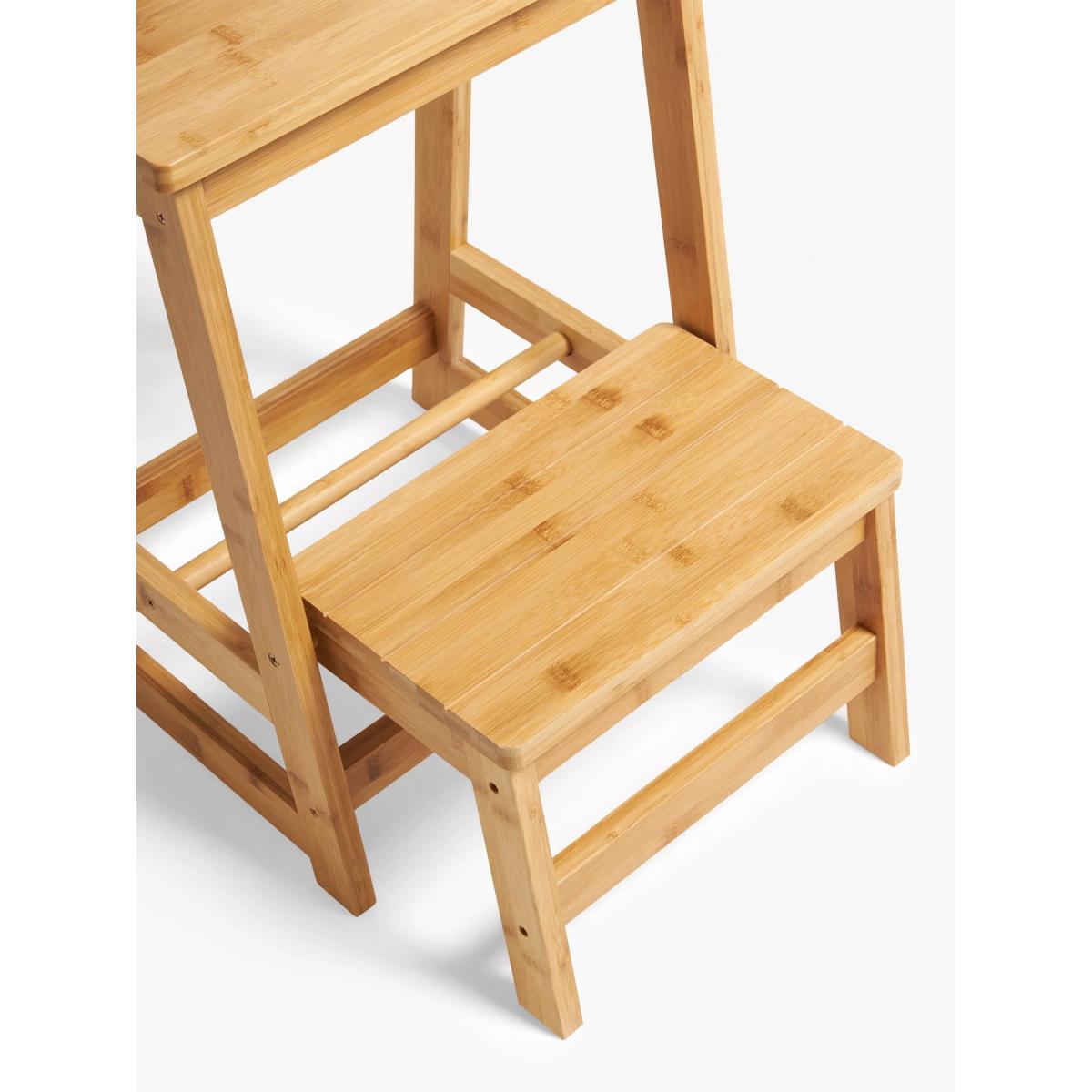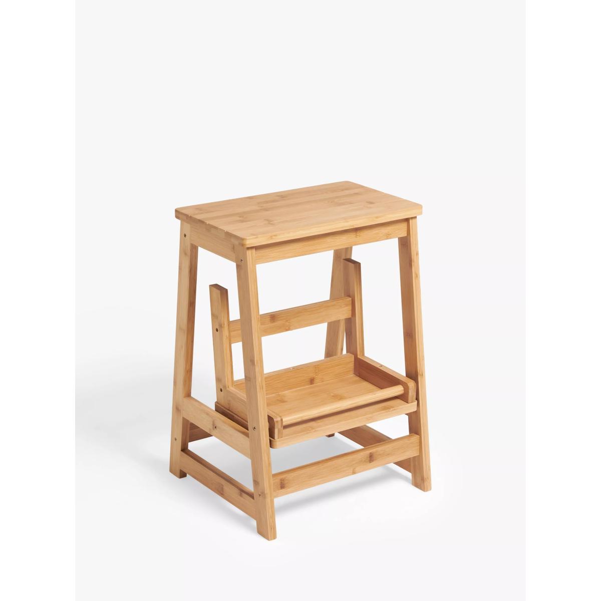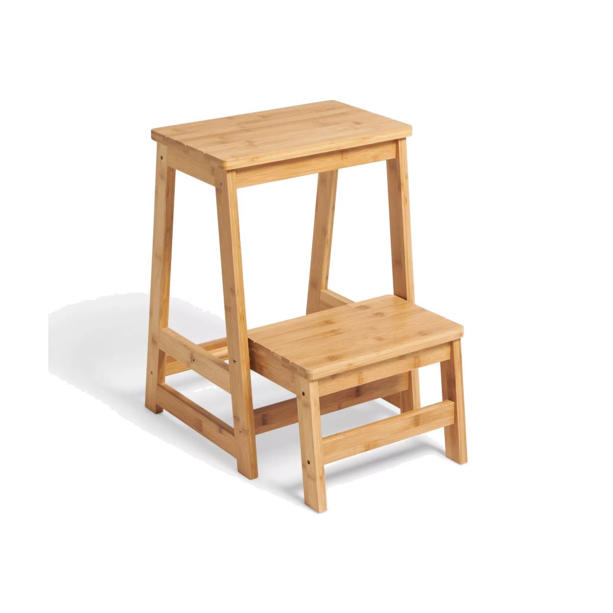 This sturdy bamboo step stool comes fully assembled. The second step simply folds out for tasks that require a higher reach.