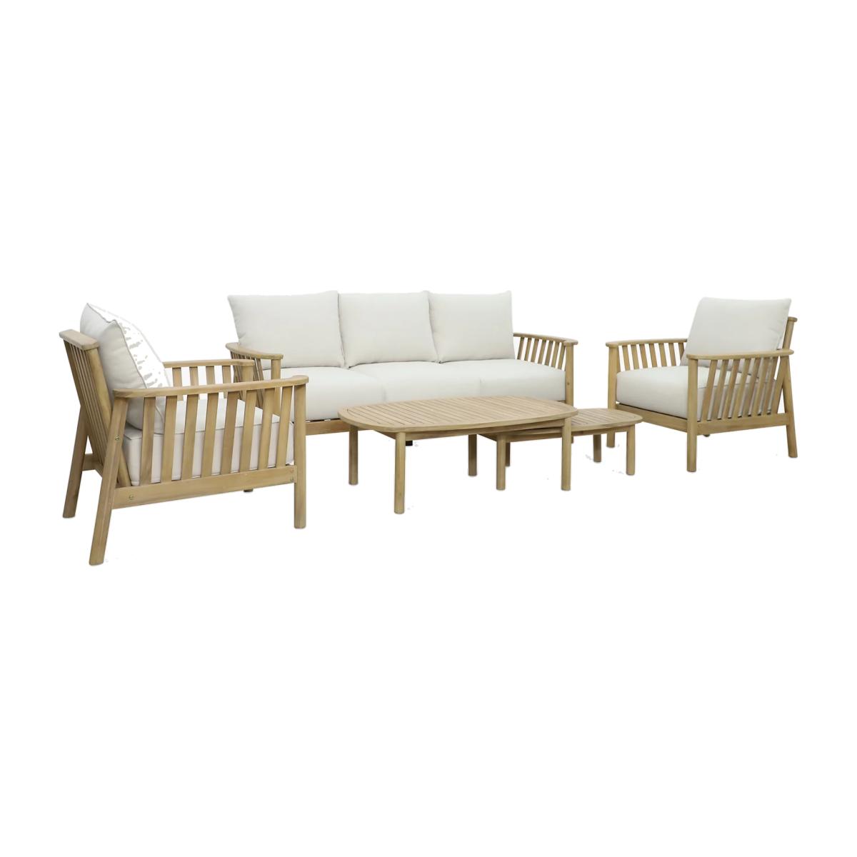 Our Boardwalk furniture boasts classic good looks made from hardy FSC-certified acacia wood that suits both indoor and outdoor use. The includes a pair of oval-shaped Boardwalk coffee tables that nest together for compact storage, the smaller table neatly sliding underneath the larger one. Seating includes two Boardwalk lounge chairs and a three-seater with an ergonomic design twinned with deep sumptuous cushions, making them very comfortable. The seat and backrest cushions are shower-resistant but bring them inside during poor weather conditions and winter months. Key features: Weather-resistant FSC-certified acacia wood Two oval coffee tables nest together 3-seater ergonomic shaped sofa Two ergonomic shaped lounge chairs Shower-resistant sumptuous seat and backrest cushions Team with our Boardwalk range of garden furniture Large table: H37 x W120 x D70cm, Small table: H31 x W100 x D46cm, H81.6 x W87.5 x D90.1cm, Sofa: H81.6 x W214.1 x D87.5cm By choosing this product you are supporting responsible management of the world's forests. The Forest Stewardship Council® (FSC®) is a global, not-for-profit organisation that helps take care of forests and the people and wildlife that call them home. To learn more, visit fsc.org. Choose the perfect outdoor furniture We have a selection of wooden furniture for you to choose from which will suit the home or garden. Below are a few options to consider when choosing your perfect outdoor furniture. TeakA premium and popular wood with an attractive appearance which ages beautifully. Strong, durable and resistant to rot and decay, this furniture requires little maintenanceEucalyptusDistinctive scent and appearance which darkens as it ages. Provides similar natural benefits to teak including moisture resistance, hardness and durability. It's plentiful in supply which makes the furniture an inexpensive choice. AcaciaNaturally durable, this wood is incredibly hard and is unlikely to suffer damage during everyday use. It provides similar natural benefits to teak, yet unlike many other hardwoods, acacia is also relatively fast growing which minimises the environmental impact. Want to see it first? You may want to see and get a feel for the product in one of our shops before ordering. We'll be able to tell you where the range you'd like to view is on display.