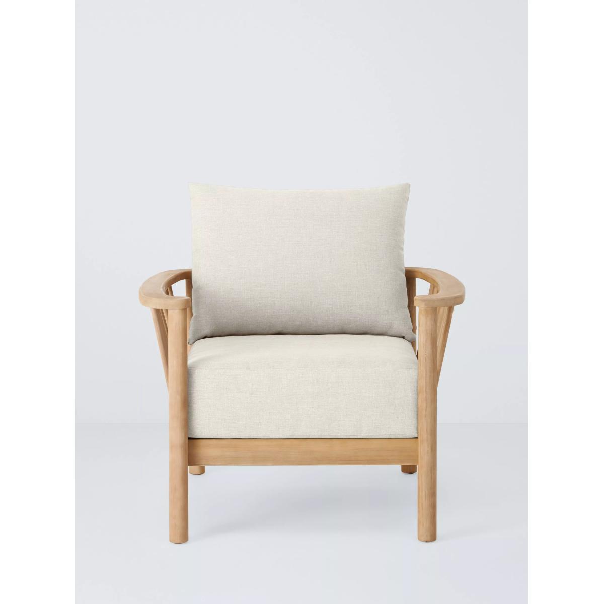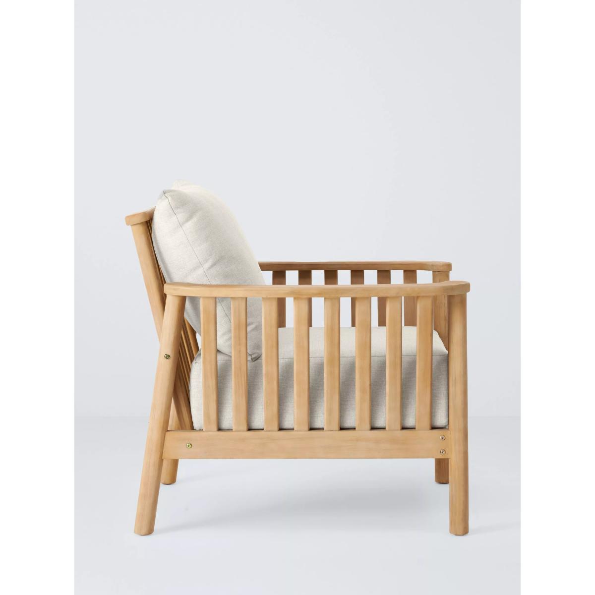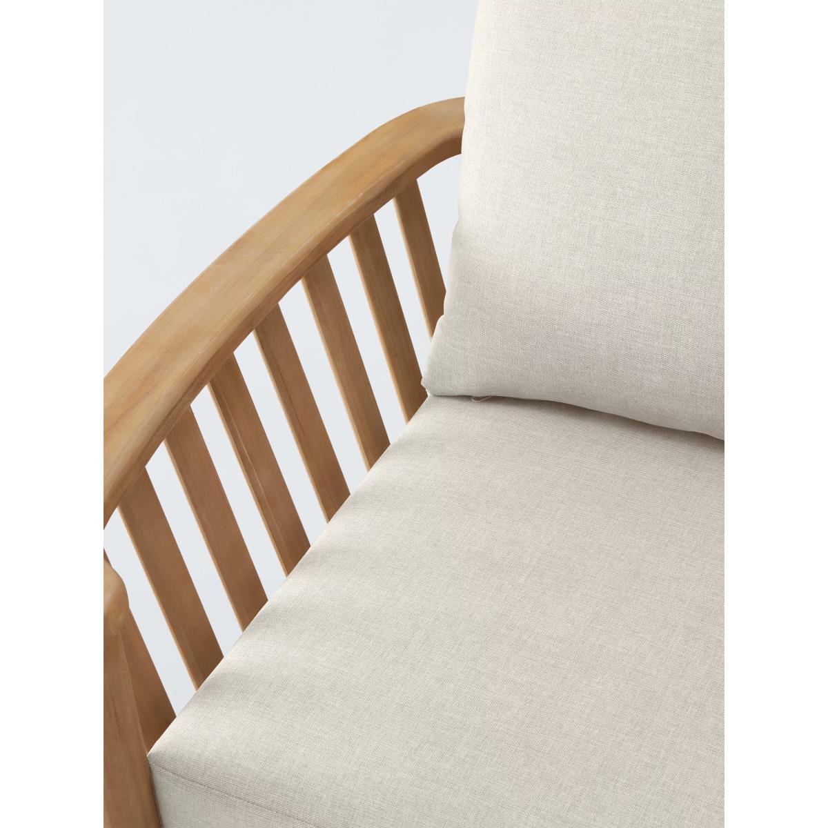 Our Boardwalk furniture is made from hardy and naturally weather-resistant FSC-certified acacia wood. This Boardwalk lounge chair has an ergonomic and generous design with deep, sumptuous and shower-resistant seat and backrest cushions. The oatmeal fabric works tonally with the timber finish. "We really focussed on making these transitional pieces — that means the same furniture can work just as well in a garden as it does in a conservatory or sunroom." — designer Matthew Steels, John Lewis Design Studio. Key features: Ergonomic shaped lounge chair Weather-resistant FSC-certified acacia wood Shower-resistant sumptuous seat and backrest cushions Team with our Boardwalk range of garden furniture Garden furniture care: To keep your outdoor furniture in the best condition, store it in a cool, dry, well-ventilated spot indoors over the winter. If it’s staying outside, use an outdoor furniture cover whenever the weather is wet or unseasonal. Make sure furniture is clean and dry before storing it away, and keep cushions in a clean and dry place when not in use. By choosing this product you are supporting responsible management of the world's forests. The Forest Stewardship Council® (FSC®) is a global, not-for-profit organisation that helps take care of forests and the people and wildlife that call them home. To learn more, visit fsc.org. Choose the perfect outdoor furniture We have a selection of wooden furniture for you to choose from which will suit the home or garden. Below are a few options to consider when choosing your perfect outdoor furniture. TeakA premium and popular wood with an attractive appearance which ages beautifully. Strong, durable and resistant to rot and decay, this furniture requires little maintenanceEucalyptusDistinctive scent and appearance which darkens as it ages. Provides similar natural benefits to teak including moisture resistance, hardness and durability. It's plentiful in supply which makes the furniture an inexpensive choice. AcaciaNaturally durable, this wood is incredibly hard and is unlikely to suffer damage during everyday use. It provides similar natural benefits to teak, yet unlike many other hardwoods, acacia is also relatively fast growing which minimises the environmental impact.