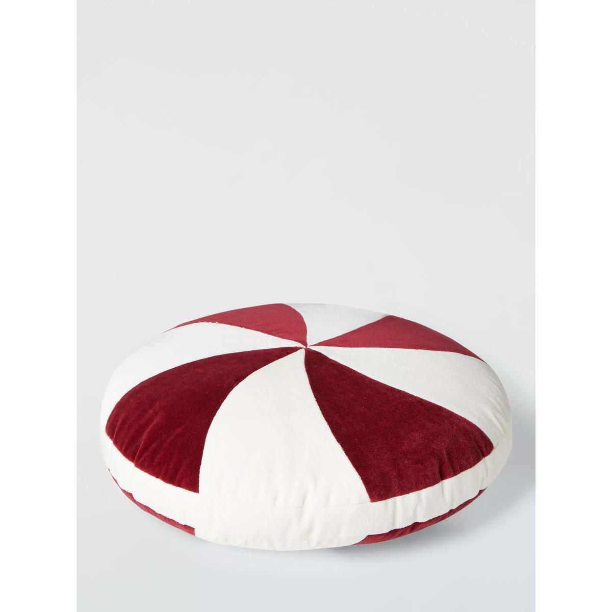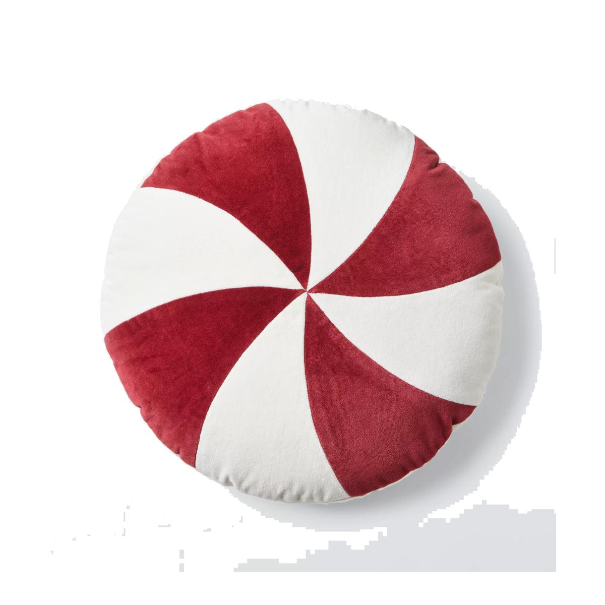 A plump round cushion in luxurious cotton velvet in a seasonal bon-bon inspired design.