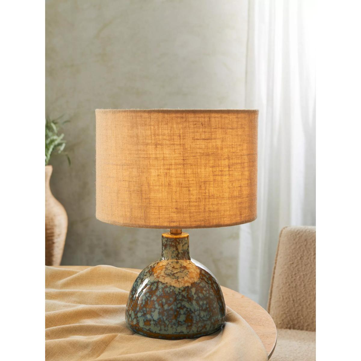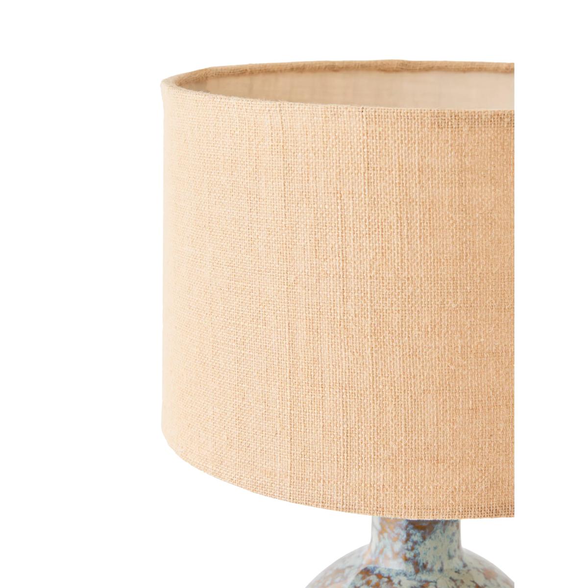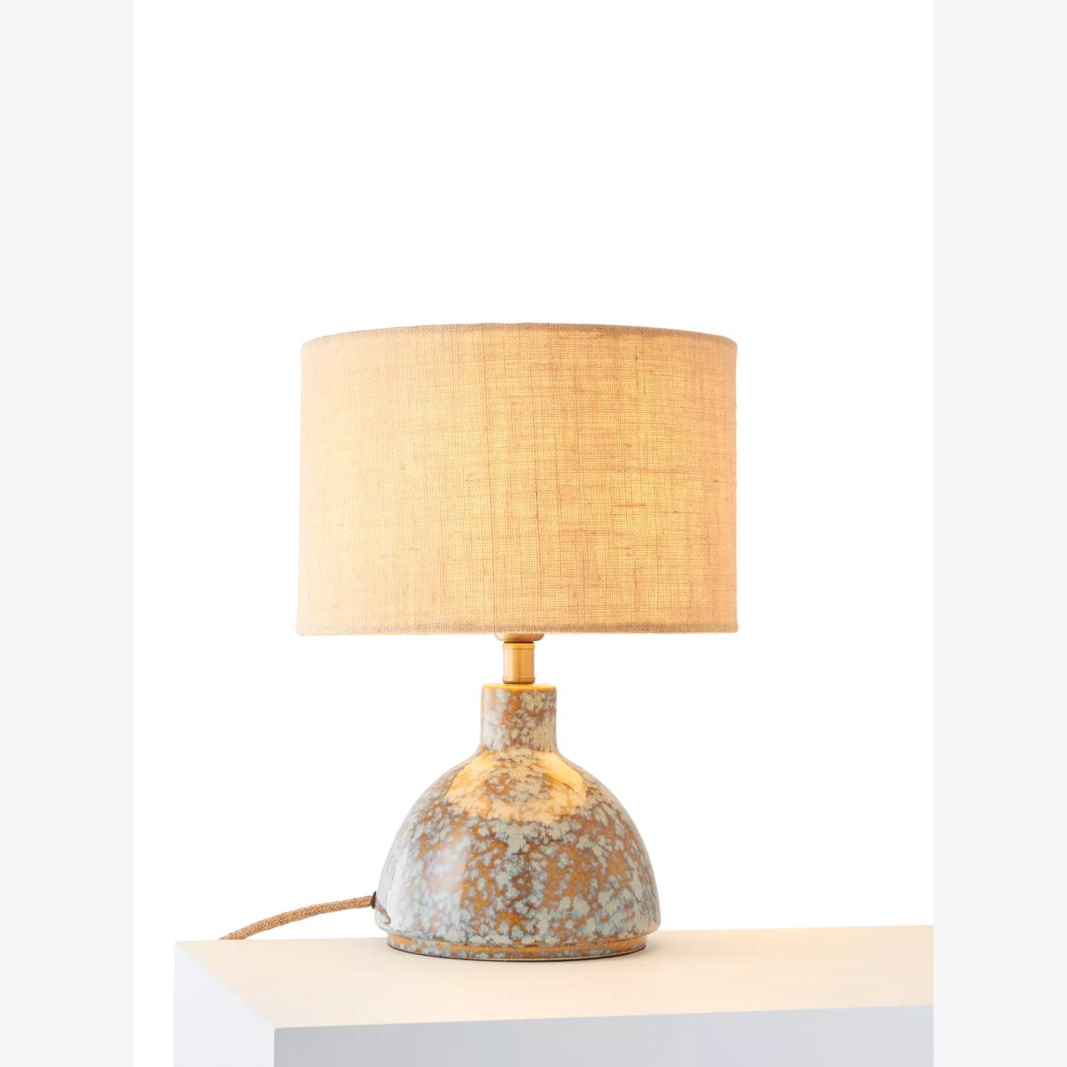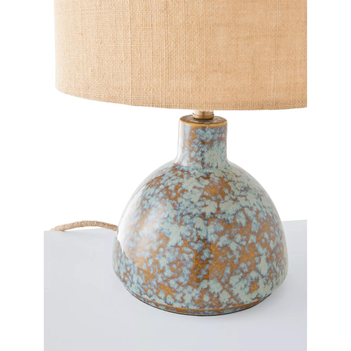 The Botal table lamp has a glossy reactive glaze, which creates a symphony of hues. Paired with a caramel jute shade to diffuse a soft glow of light, it also features a natural jute flex and warm brass accents. Crafted by hand, the distinctive glaze variations are integral to the design, creating a practical lamp that's also a ceramic art piece for your home.