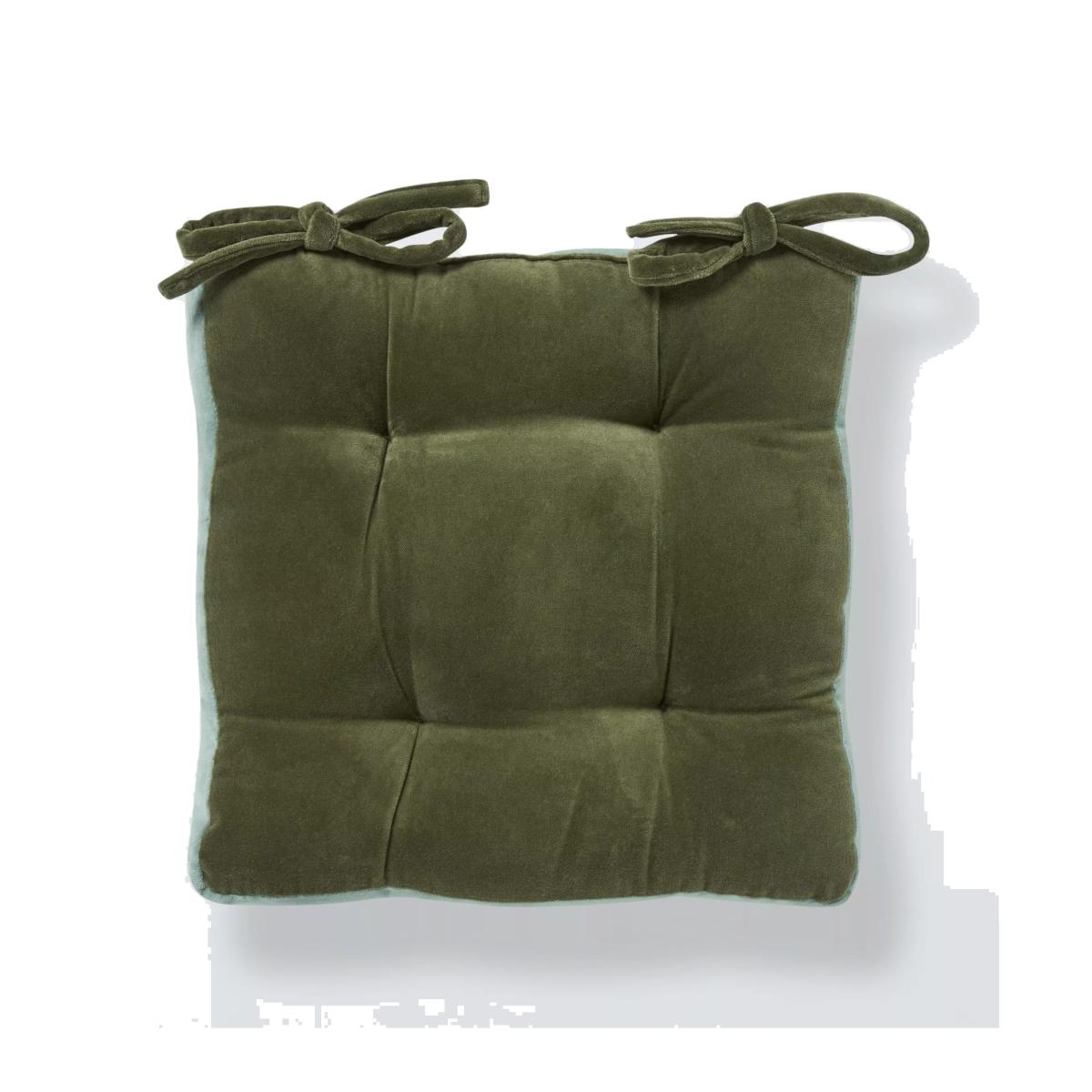 Add a comfortable layer to dining chairs with these polyester filled seat pads. They fasten easily at the back with ties and are covered in plush velvet in two contrasting shades.