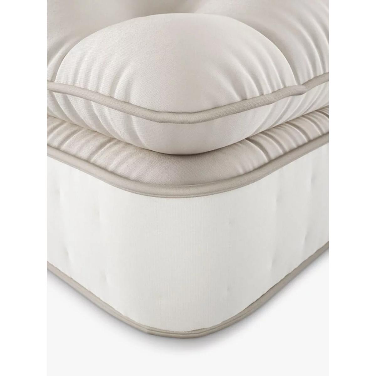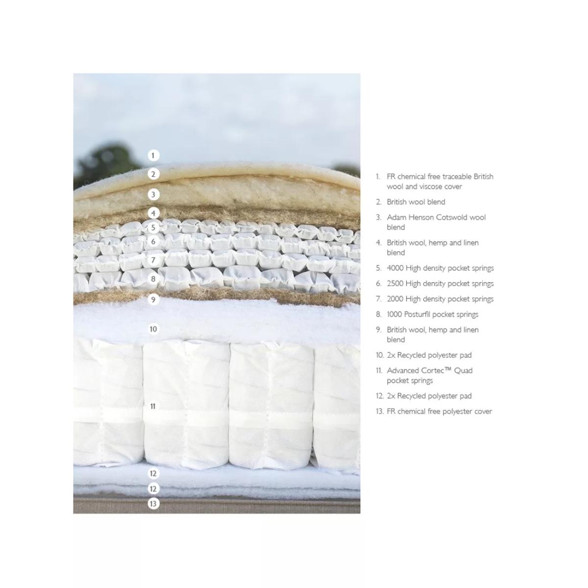 The Cotswold Pillowtop 10250 is made with layers of natural fillings, including Cotswold wool, combining 100% natural fillings with innovative pocket spring technology for a super comfortable sleep. The addition of a pillowtop adds a soft and sumptuous extra layer to this mattress. This mattress has a soft feel but can be ordered in a regular or firmer tension depending on your comfort needs. Our British Natural Collection is handmade by experts in Yorkshire, with natural fillings chosen for their wonderful comfort, temperature-regulating and moisture-wicking properties. The innovative, high-density pocket springs reduce pressure points and give excellent targeted support. Plus, the combination of eco-friendly and natural fillings, alongside a completely glue-free design means these mattresses are fully recyclable at end of life for a much more sustainable sleep space. Handcrafted by Harrison Spinks. Natural fillings Manufactured in Yorkshire, this mattress is upholstered with layers of locally-sourced natural fillings to wick away moisture, keeping your bed fresh and hygienic, without compromising on comfort. Cortec™ Quad pocket spring system This glue-free support system has been designed, developed and manufactured in-house, with a design that unites comfort and sustainability. It offers a two-stage level of support thanks to a spring-in-spring design, delivering even greater lumbar support and pressure relief. The heavier parts of your body will be perfectly supported to help maintain an aligned spine and to prevent unwanted aches and pains. Plus, as the springs work individually, air can flow better through the mattress to keep the temperature controlled. Eco-friendly design Marking a huge and sustainable step forward in mattress manufacturing, the patented Cortec™ Quad springs are sealed with heat rather than glue. Not only does this mean the springs can work individually for maximum efficiency, it also means each spring can be disassembled and reinvented in the future. So this mattress is 100% recyclable at the end of its life, rather than ending up in landfill sites across the country. We guarantee to recycle your mattress responsibly when you’re ready to buy your next one, after seven years. and we’ll help you to choose a new mattress and recycle this one. Make the most of your mattress After unwrapping your new mattress, leave it in a well-ventilated room for a few hours. Any natural scent from the fillings will dissipate after a few days. We recommend using a cotton mattress protector and airing your mattress regularly. If you’re placing this mattress on a slatted base, ensure the gaps are no more than 7.5cm apart. Try before you buy This is an important purchase and it’s worthwhile to try your choice of mattress in store to make sure it's right for you. Our store Partners will be able to tell you more about its benefits, and recommend options based on your needs.