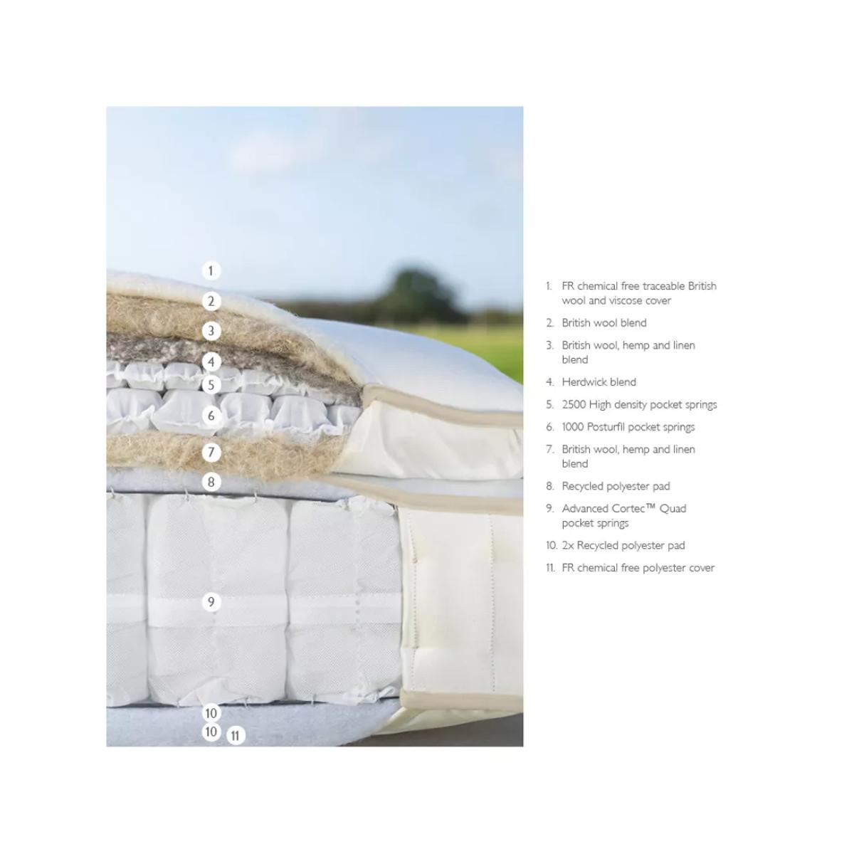 The John Lewis British Natural Collection is crafted by renowned heritage bedmakers Harrison Spinks. Designed and made in-house in Yorkshire, the Herdwick 4250 features layers of natural fillings including traceable British wool, homegrown hemp fibres and award-winning spring technology. The addition of a pillowtop adds a soft and sumptuous extra layer to this mattress. This zip link model can be used as one large mattress or as two independent mattresses. Herdwick wool has even greater insulating properties and even more bounce in the fibres than traditional wool. Used in the mattress and pillowtop to regulate body temperature, the Herdwick wool helps you stay cool in the Summer and warm in the Winter. Cortec™ Quad pocket spring system This glue-free support system has been designed, developed and manufactured in-house, with a design that unites comfort and sustainability. It offers a two-stage level of support thanks to a spring-in-spring design, delivering even greater lumbar support and pressure relief. The heavier parts of your body will be perfectly supported to help maintain an aligned spine and to prevent unwanted aches and pains. Plus, as the springs work individually, air can flow better through the mattress to keep the temperature controlled. Eco-friendly design Marking a huge and sustainable step forward in mattress manufacturing, the patented Cortec™ Quad springs are sealed with heat rather than glue. Not only does this mean the springs can work individually for maximum efficiency, it also means each spring can be disassembled and reinvented in the future. So this mattress is 100% recyclable at the end of its life, rather than ending up in landfill sites across the country. We guarantee to recycle your mattress responsibly when you’re ready to buy your next one, after seven years. and we’ll help you to choose a new mattress and recycle this one. Make the most of your mattress After unwrapping your new mattress, leave it in a well-ventilated room for a few hours. Any natural scent from the fillings will dissipate after a few days. We recommend using a cotton mattress protector and airing your mattress regularly. If you’re placing this mattress on a slatted base, ensure the gaps are no more than 7.5cm apart. Try before you buy This is an important purchase and it’s worthwhile to try your choice of mattress in store to make sure it's right for you. Our store Partners will be able to tell you more about its benefits, and recommend options based on your needs.
