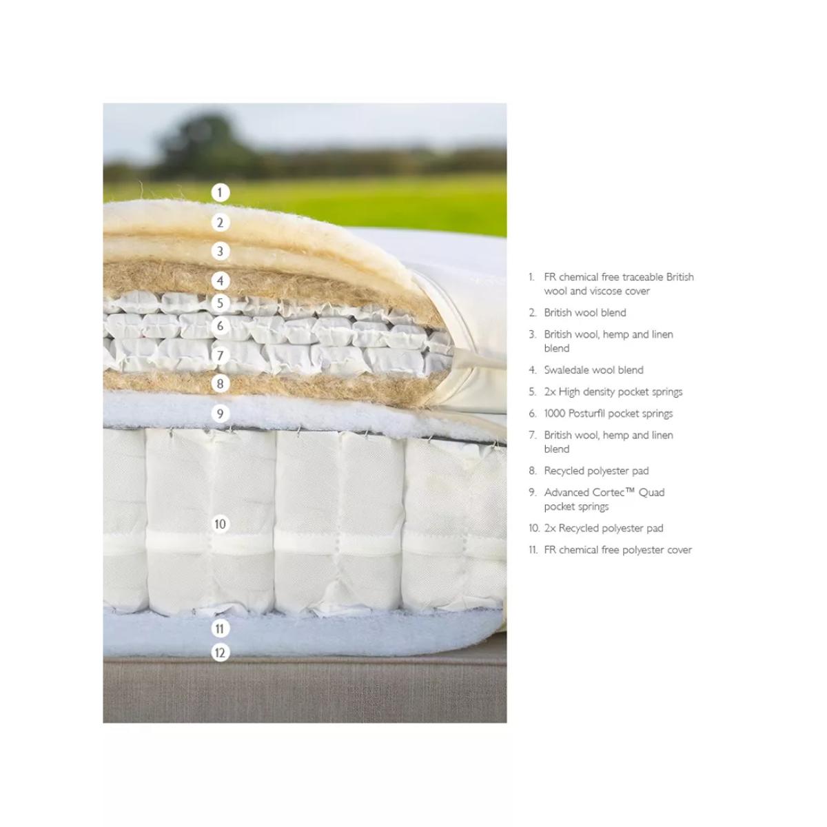 The Swaledale Pillowtop 6250 is made with layers of natural fillings, including Swaledale wool, combining 100% natural fillings with innovative pocket spring technology for a super comfortable sleep. The addition of a pillowtop adds a soft and sumptuous extra layer to this mattress. Our British Natural Collection is handmade by experts in Yorkshire, with natural fillings chosen for their wonderful comfort, temperature-regulating and moisture-wicking properties. The innovative, high-density pocket springs reduce pressure points and give excellent targeted support. Plus, the combination of eco-friendly and natural fillings, alongside a completely glue-free design means these mattresses are fully recyclable at end of life for a much more sustainable sleep space. Handcrafted by Harrison Spinks. Natural fillings Manufactured in Yorkshire, this mattress is upholstered with layers of locally-sourced natural fillings to wick away moisture, keeping your bed fresh and hygienic, without compromising on comfort. Cortec™ Quad pocket spring system This glue-free support system has been designed, developed and manufactured in-house, with a design that unites comfort and sustainability. It offers a two-stage level of support thanks to a spring-in-spring design, delivering even greater lumbar support and pressure relief. The heavier parts of your body will be perfectly supported to help maintain an aligned spine and to prevent unwanted aches and pains. Plus, as the springs work individually, air can flow better through the mattress to keep the temperature controlled. Eco-friendly design Marking a huge and sustainable step forward in mattress manufacturing, the patented Cortec™ Quad springs are sealed with heat rather than glue. Not only does this mean the springs can work individually for maximum efficiency, it also means each spring can be disassembled and reinvented in the future. So this mattress is 100% recyclable at the end of its life, rather than ending up in landfill sites across the country. We guarantee to recycle your mattress responsibly when you’re ready to buy your next one, after seven years. and we’ll help you to choose a new mattress and recycle this one. Make the most of your mattress After unwrapping your new mattress, leave it in a well-ventilated room for a few hours. Any natural scent from the fillings will dissipate after a few days. We recommend using a cotton mattress protector and airing your mattress regularly. If you’re placing this mattress on a slatted base, ensure the gaps are no more than 7.5cm apart. Try before you buy This is an important purchase and it’s worthwhile to try your choice of mattress in store to make sure it's right for you. Our store Partners will be able to tell you more about its benefits, and recommend options based on your needs.