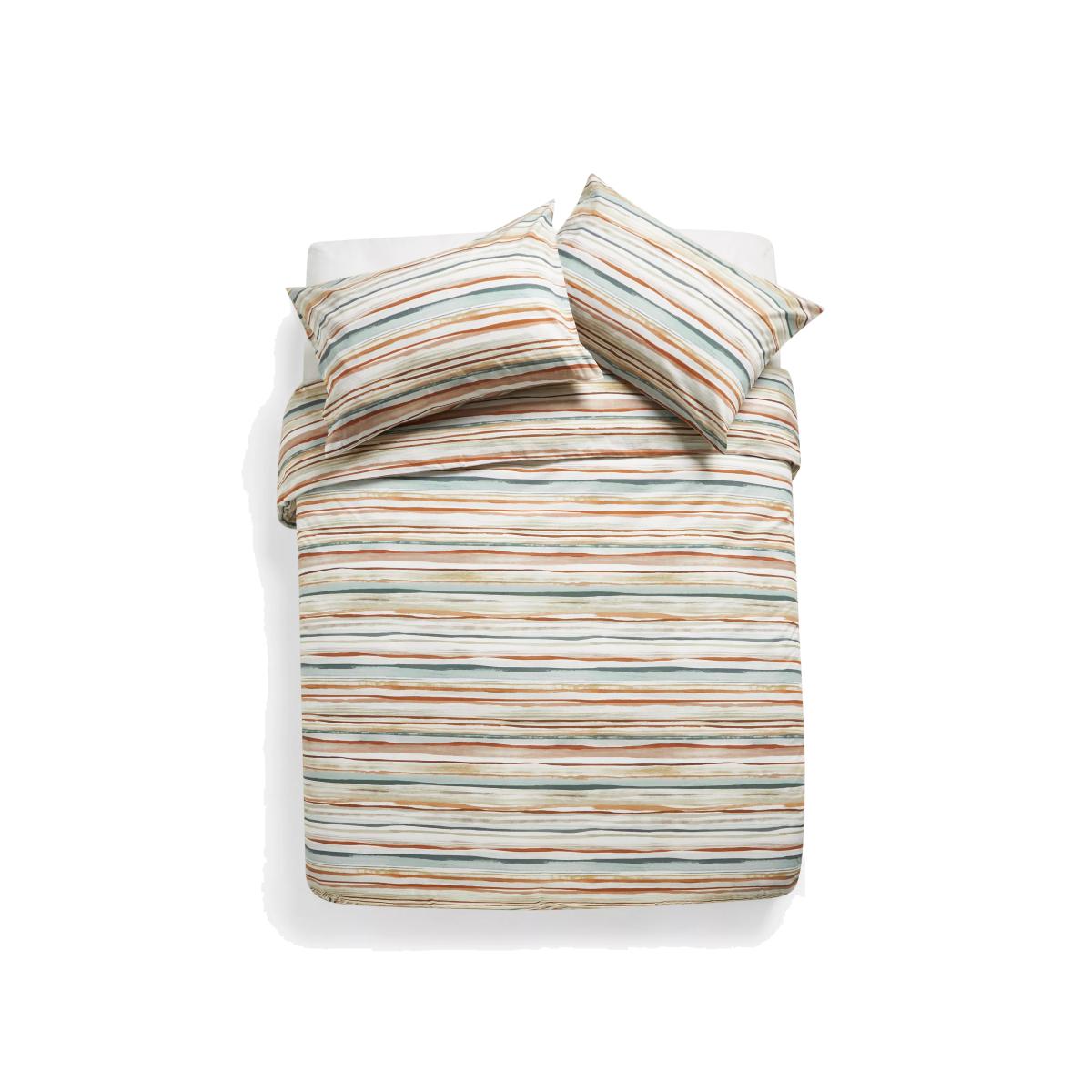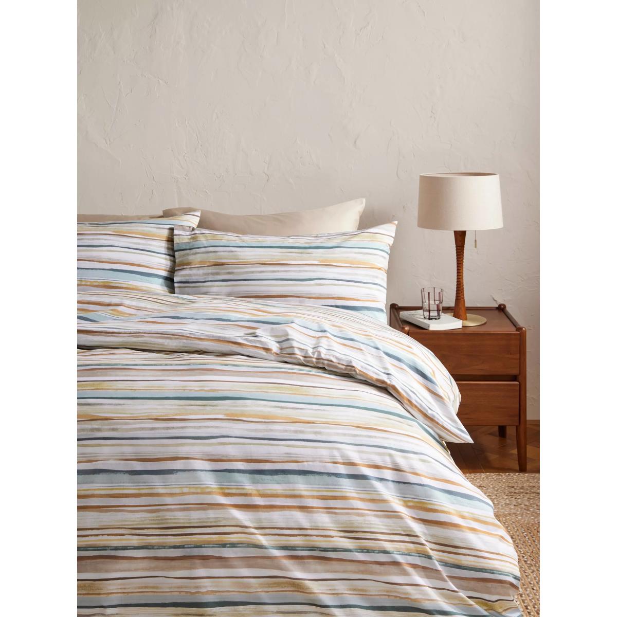 Painterly stripes, in a range of beautiful earth tones, run horizontally across this duvet covet set for a relaxed bedroom look. This bedding is made from 100% cotton fabric to help to keep you cool and comfortable throughout the night. The single set comes with one standard pillowcase, while the double, king and super king sets come with two standard pillowcases. Bedding sizes To fit duvet/pillow size (cm) Standard pillowcase, L75 x W50cm Single duvet cover, L200 x W135cm Double duvet cover, L200 x W200cm King duvet cover, L220 x W225cm Super king duvet cover, L220 x W260cm Better Cotton By choosing our cotton products, you’re supporting our investment in Better Cotton’s mission to help cotton communities survive and thrive while protecting and restoring the environment. Better Cotton Farmers are farmers who care for the environment and respect workers’ rights and wellbeing. This product is sourced via a system of mass balance and therefore may not contain Better Cotton. bettercotton.org/massbalance