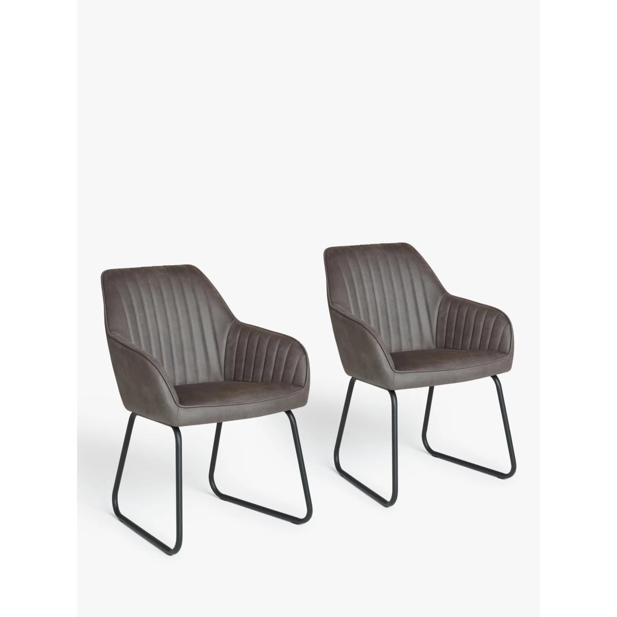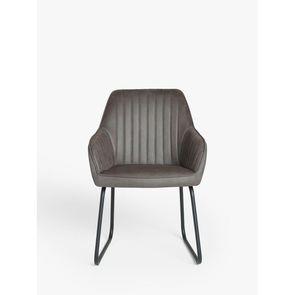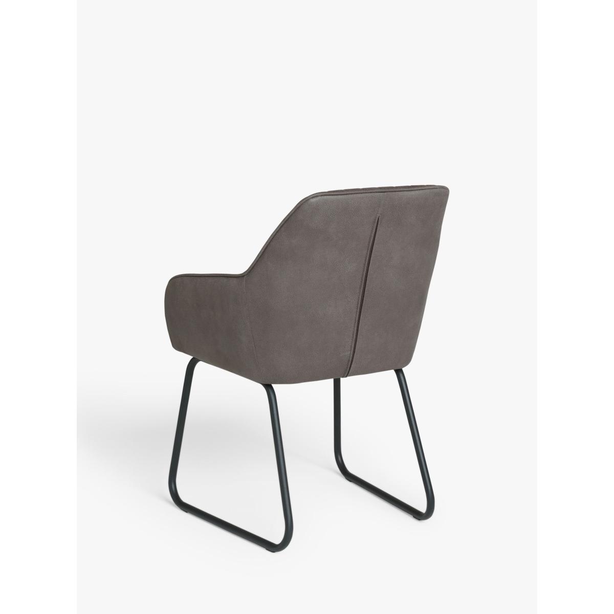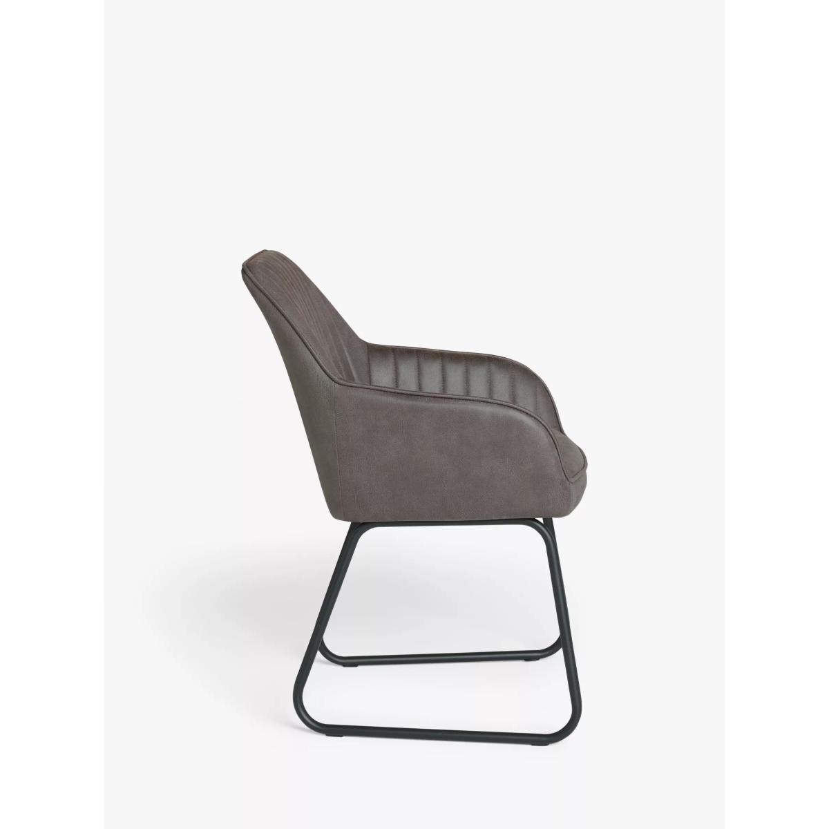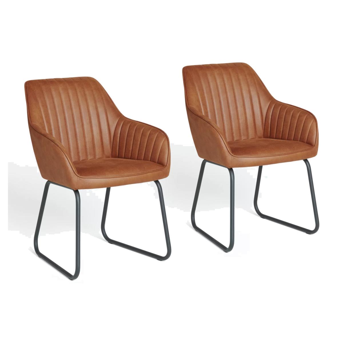 Upholstered in resilient faux leather, our Brooks armchairs provide a functional seating option for both dining and living spaces. Designed with a high backrest and incorporated armrests for support and with minimalist metal legs providing a stable base. Easy to assemble and supplied as a pair, these armchairs are foam-filled for comfort. The fabric has a soft-touch feel, a blend of 65% polyester and 35% leather which makes it resistant to cracking. The surface is coated to make it water-repellent. If other liquids are spilt, you have a few minutes to quickly wipe the fabric clean to keep it in good condition. Want to see it first? You may want to see and get a feel for the furniture in one of our shops before ordering. We'll be able to tell you where the range you'd like to view is on display.