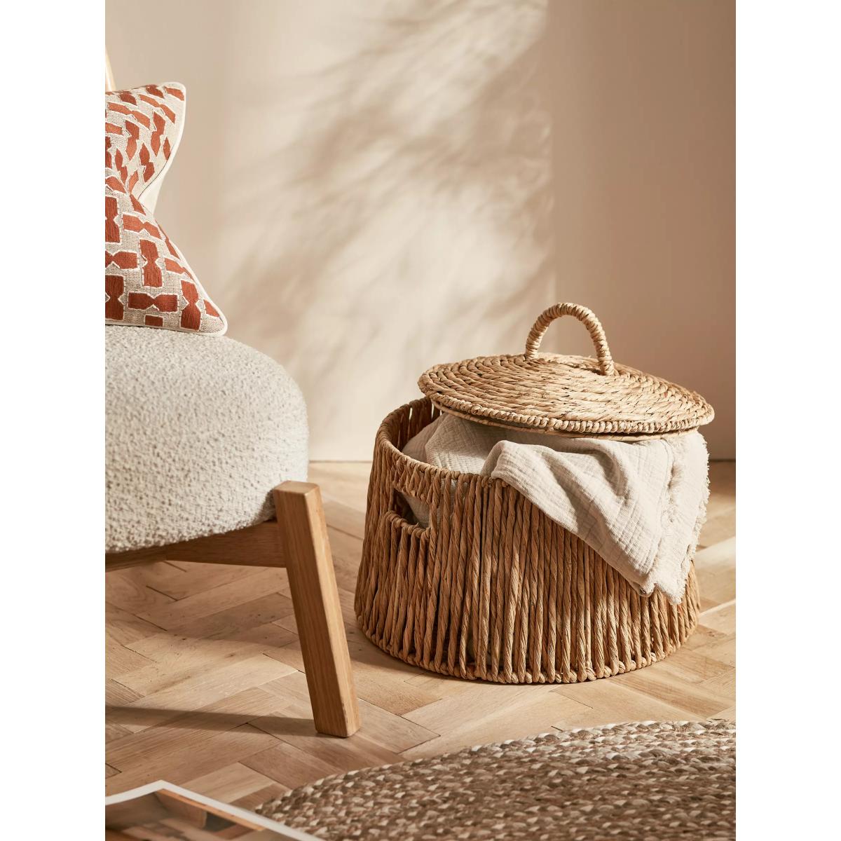 I love this basket for its casual, natural aesthetic-it adds warmth and texture to a space without feeling bulky. It works particularly well in boho, coastal, or Scandi-inspired interiors, where organic materials are key. Practical styling tips include using it for storing throws in the living room, kids’ toys in a playroom, or even as a neat laundry hamper. Its low profile makes it perfect for placing under tables or on shelves, helping to keep clutter out of sight while maintaining a relaxed vibe. Just a straightforward piece that offers both style and functionality in a variety of settings.