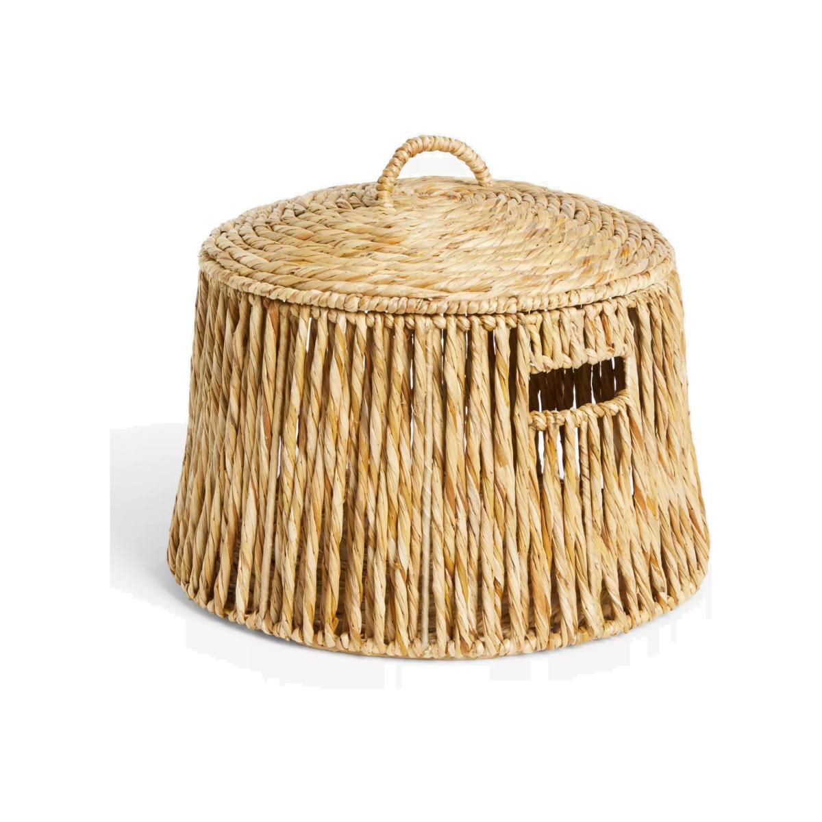 This handcrafted lidded basket is made from bulrush woven onto a metal frame. Suitable for general storage.