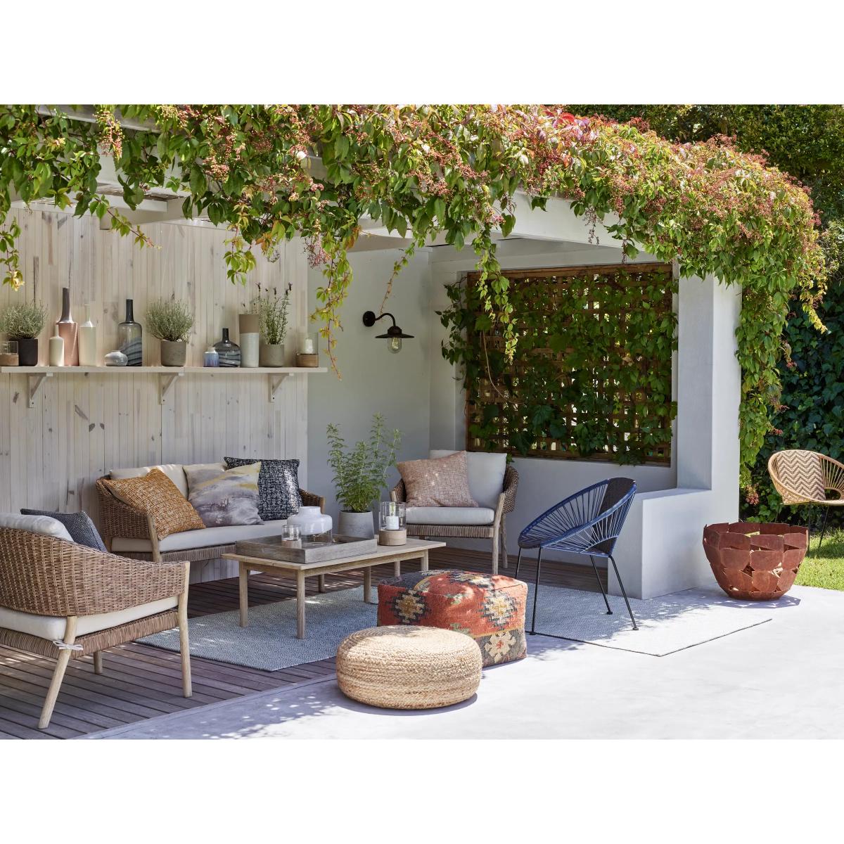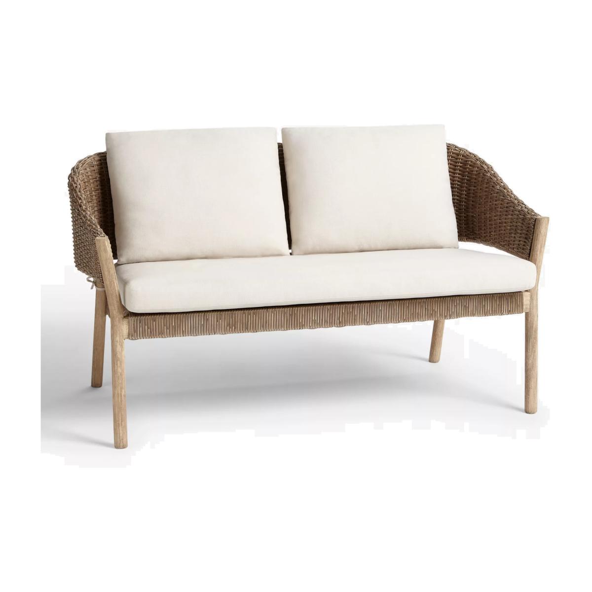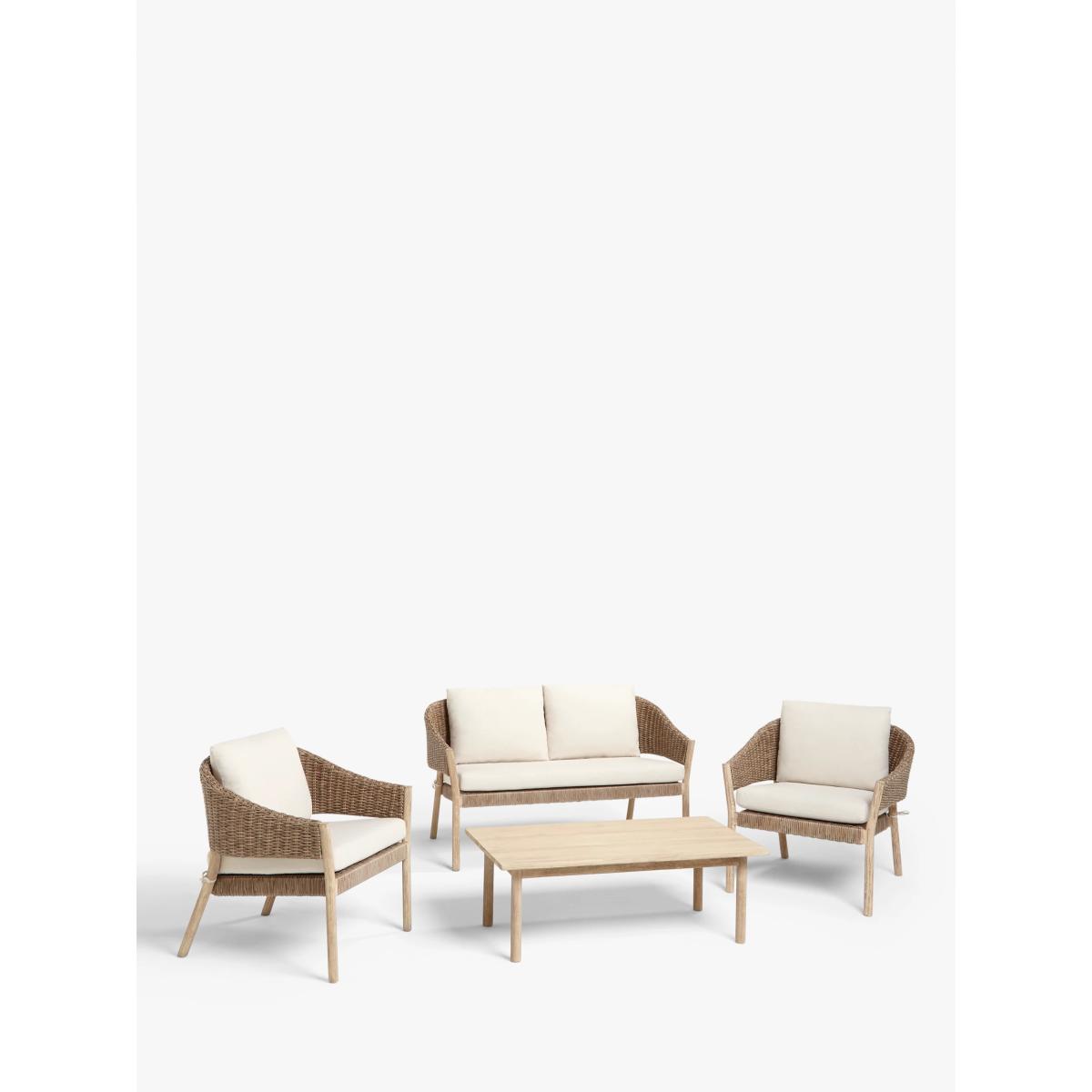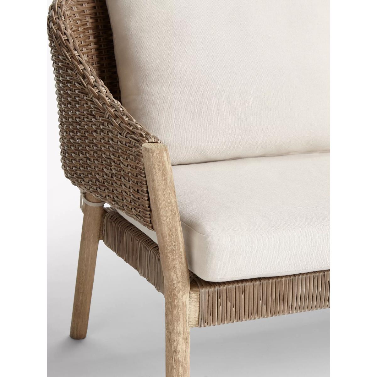 Suitable for the garden or conservatory, this two-seater sofa has wooden frames with a limed finish to highlight the beauty of the grain. The seat and curved back support are made of synthetic wicker with an attractive 6mm-thick, half-round weave design. Easy to maintain, the wicker is waterproof and UV-protected to prevent fading so the sofa can be left outside throughout the seasons. Removable shower-resistant seat and backrest cushions are included, providing sumptuous comfort. The frames are made of responsibly sourced FSC-certified acacia wood, matching furniture from our Burford range. Key features: 2-seater sofa FSC-certified acacia wood and synthetic wicker Sumptuous shower-resistant cushions included Suitable for indoor and outdoor use Suits our Burford range of outdoor furniture Choose the perfect outdoor furniture We have a selection of wooden furniture for you to choose from which will suit the home or garden. Below are a few options to consider when choosing your perfect outdoor furniture. Teak (Best)A premium and popular wood with an attractive appearance which ages beautifully. Strong, durable and resistant to rot and decay, this furniture requires little maintenanceEucalyptus (Better)Distinctive scent and appearance which darkens as it ages. Provides similar natural benefits to teak including moisture resistance, hardness and durability. It's plentiful in supply which makes the furniture an inexpensive choice Acacia (Good)Naturally durable, this wood is incredibly hard and is unlikely to suffer damage during everyday use. It provides similar natural benefits to teak, yet unlike many other hardwoods, acacia is also relatively fast growing which minimises the environmental impact. The majority of our furniture ranges have been hand woven using a synthetic wicker; the thinner the weave, the longer it takes for more skilled workers to complete. All weave types are durable so they'll last throughout the seasons All woven outdoor furniture is UV protected so it will not fade in direct sunlight All woven outdoor furniture is easy to maintain; simple wipe clean with warm water FlatA weave of various widths which offers incredible value for money Half roundMore detailed with a 3D effect, the half round is a round weave in half which displays a wicker appearance on the top and hollowed underside Double half roundA double strand of half round, this is a wider width of weave which achieves a premium appearanceRound weaveA very tight weave which is available in various widths: 2mm and 5mm (4 Seasons), 3mm (Dante) RopeA selection of our ranges have been made using rope originally made for the fishing industry such as our Ariel and Leia furniture and LG Outdoor Hanoi. The yarn is made up of 10,000 (approx) woven strands with a double core for extreme strength, does not attract mould even if wet for a long time and is UV resistant.