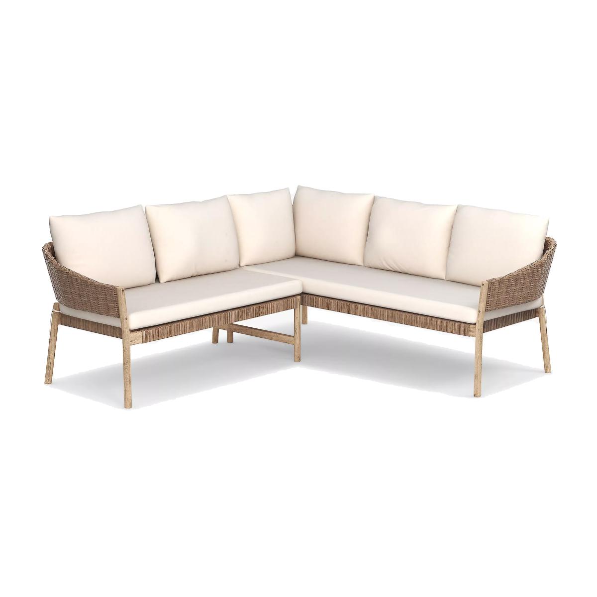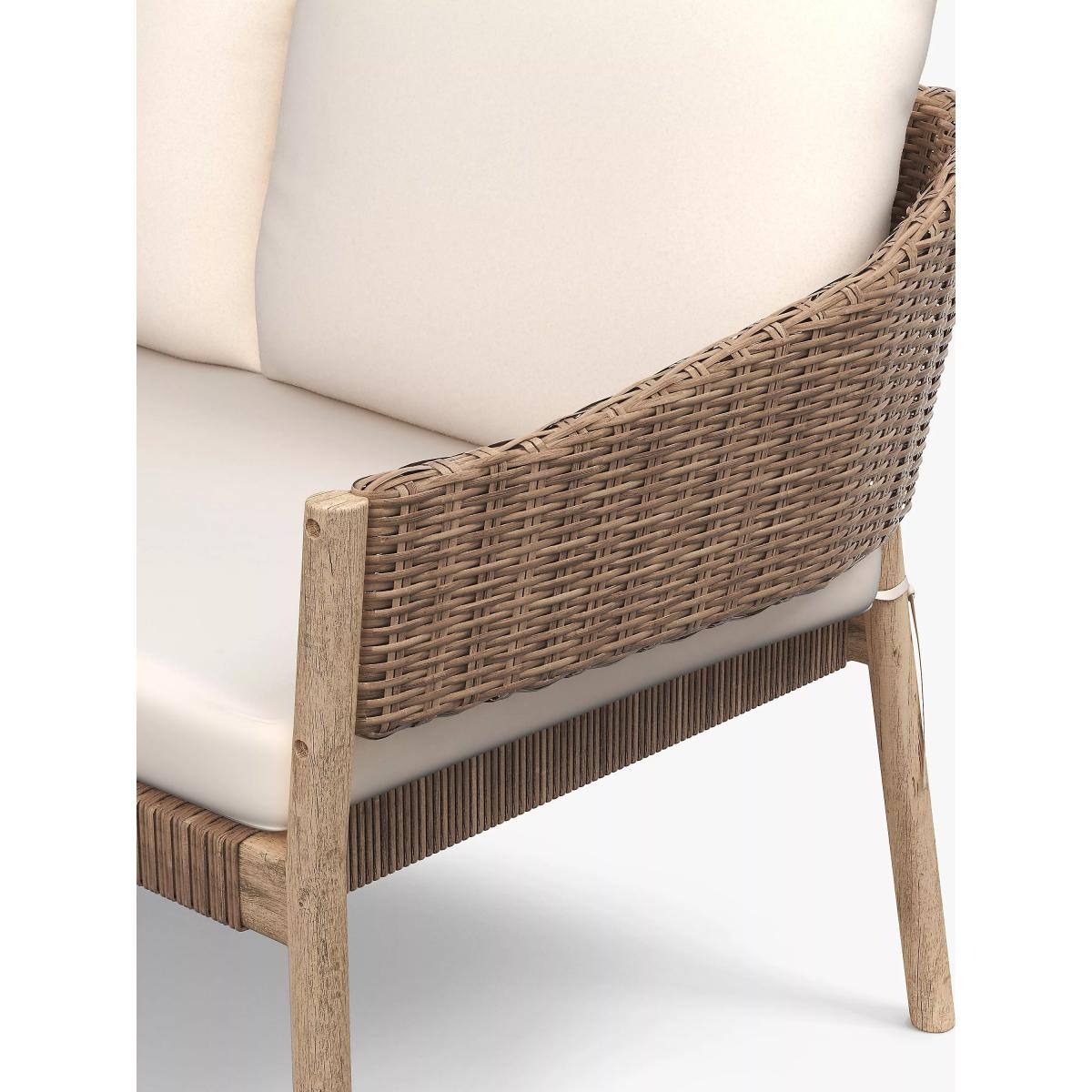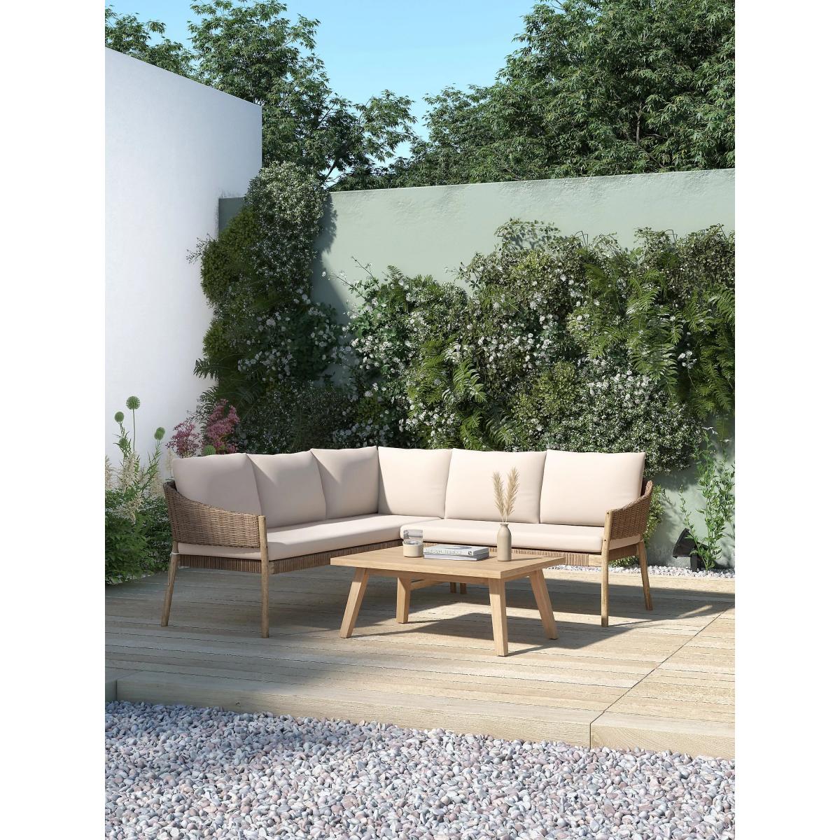 Suitable for the garden or conservatory, our Burford garden furniture is made of FSC-certified acacia wood with a limed finish for protection and to highlight the beauty of the wood grain. Seats and curved backrests on the seating in this range are made of weather-resistant synthetic wicker with an attractive 6mm-thick, half-round weave design. Easy to maintain, the wicker is waterproof and UV-protected to prevent fading, so the furniture can be left outside throughout the seasons. Removable shower-resistant seat and backrest cushions are included, providing sumptuous comfort. Key features: Five-seater corner garden sofa FSC-certified acacia wood frames and legs Attractive 6mm-thick, half-round weave design Sumptuous shower-resistant seat and backrest cushions included Suitable for indoor and outdoor use Matches outdoor furniture in our Burford range Garden furniture care: To keep your outdoor furniture in the best condition, store it in a cool, dry, well-ventilated spot indoors over the winter. If it's staying outside, use an outdoor furniture cover whenever the weather is wet or unseasonal. Make sure furniture is clean and dry before storing it away, and keep cushions in a clean and dry place when not in use. By choosing this product you are supporting responsible management of the world's forests. The Forest Stewardship Council® (FSC®) is a global, not-for-profit organisation that helps take care of forests and the people and wildlife that call them home. To learn more, visit fsc.org. Choose the perfect outdoor furniture We have a selection of wooden furniture for you to choose from which will suit the home or garden. Below are a few options to consider when choosing your perfect outdoor furniture. Flat. A weave of various widths which offers incredible value for money Half round. More detailed with a 3D effect, the half round is a round weave in half which displays a wicker appearance on the top and hollowed underside Double half round. A double strand of half round, this is a wider width of weave which achieves an expensive appearance. Round weave. A very tight weave which is available in various widths, from 2mm to 5mm Rope A selection of our ranges have been made using rope. The yarn is made up of 10,000 (approx) woven strands with a double core for extreme strength, does not attract mould even if wet for a long time and is UV resistant.