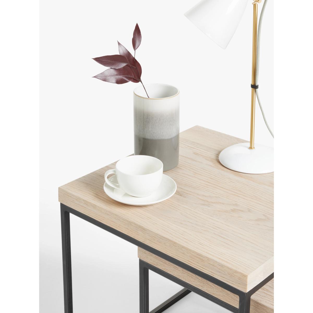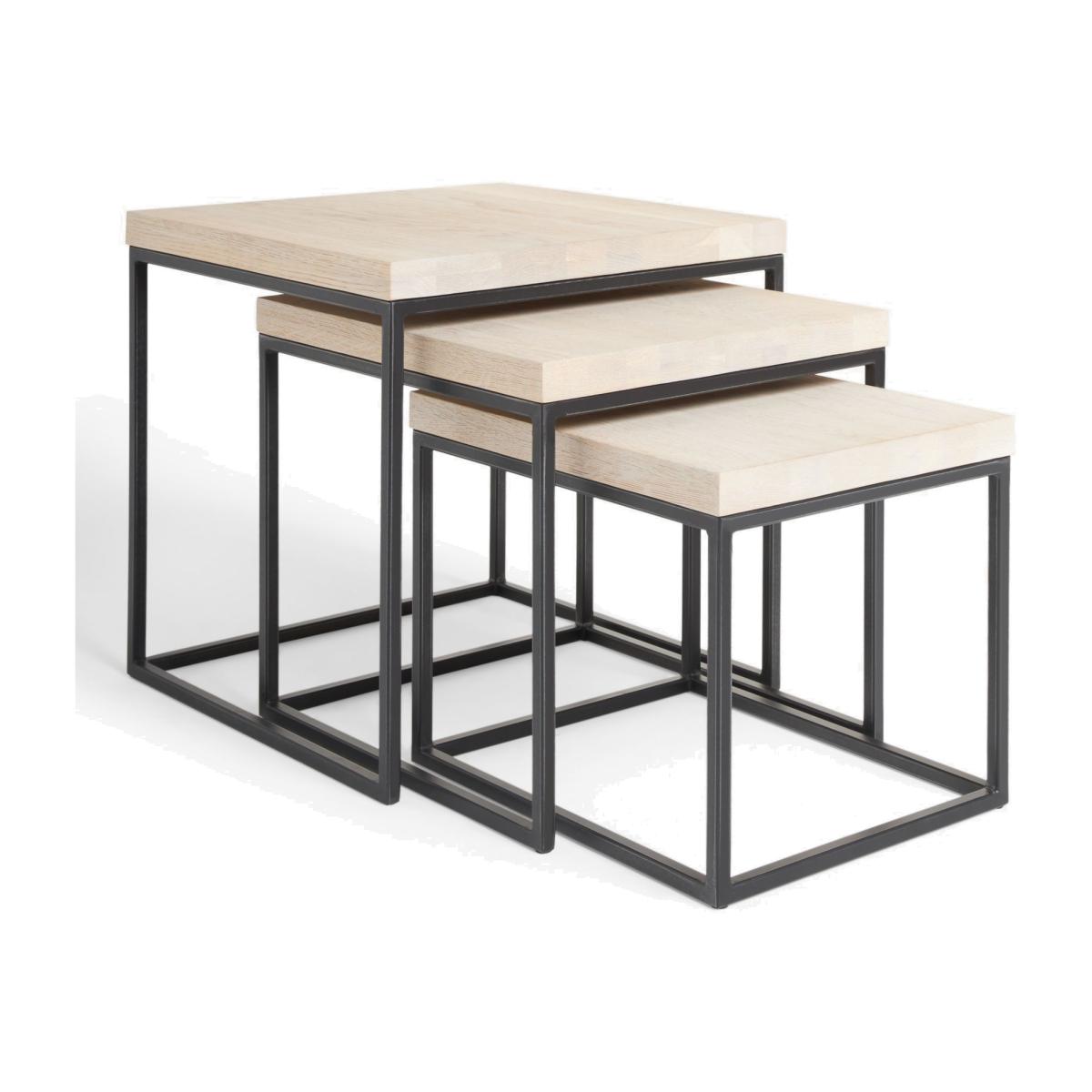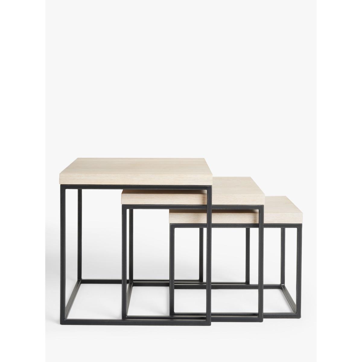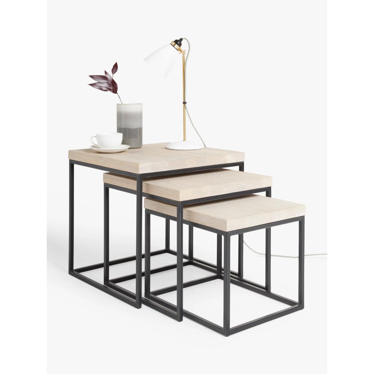 Made predominantly from solid American white oak, our Calia range of furniture has a natural, rustic look thanks to its wire-brushed, distressed finish. Each piece is made from individual wood slats that are carefully selected and sorted by skilled craftsman. They ensure that the natural pattern in the wood grain, even with its unique irregularities, uphold our design and quality standards, to offer an authentic and tactile look. This practical nest of three tables allows you to maximise your living space as they neatly stack underneath each other. The square, well-balanced design of each table is supported by a robust, welded iron base that's finished with a durable lacquer. Offering both a retro and industrial-inspired aesthetic, these tables are ideal for entertaining. Worth knowing Oak is a natural, living material, and part of its charm is that it develops over time. This means that surface splits may start to appear with the natural movement of the wood. Knots will vary in size and location and a subtle colour variation can also be expected. These distinctive qualities give the range a unique feel, as no two pieces will be exactly the same. To keep your furniture looking its best, we recommend periodic oiling and oiling before first use. This is applicable to the Oak version only, as the Dark version has a lacquered finish. More information can be found in the assembly instructions supplied. Want to see it first? You may want to see and get a feel for the furniture in one of our shops before ordering. We'll be able to tell you where the range you'd like to view is on display.