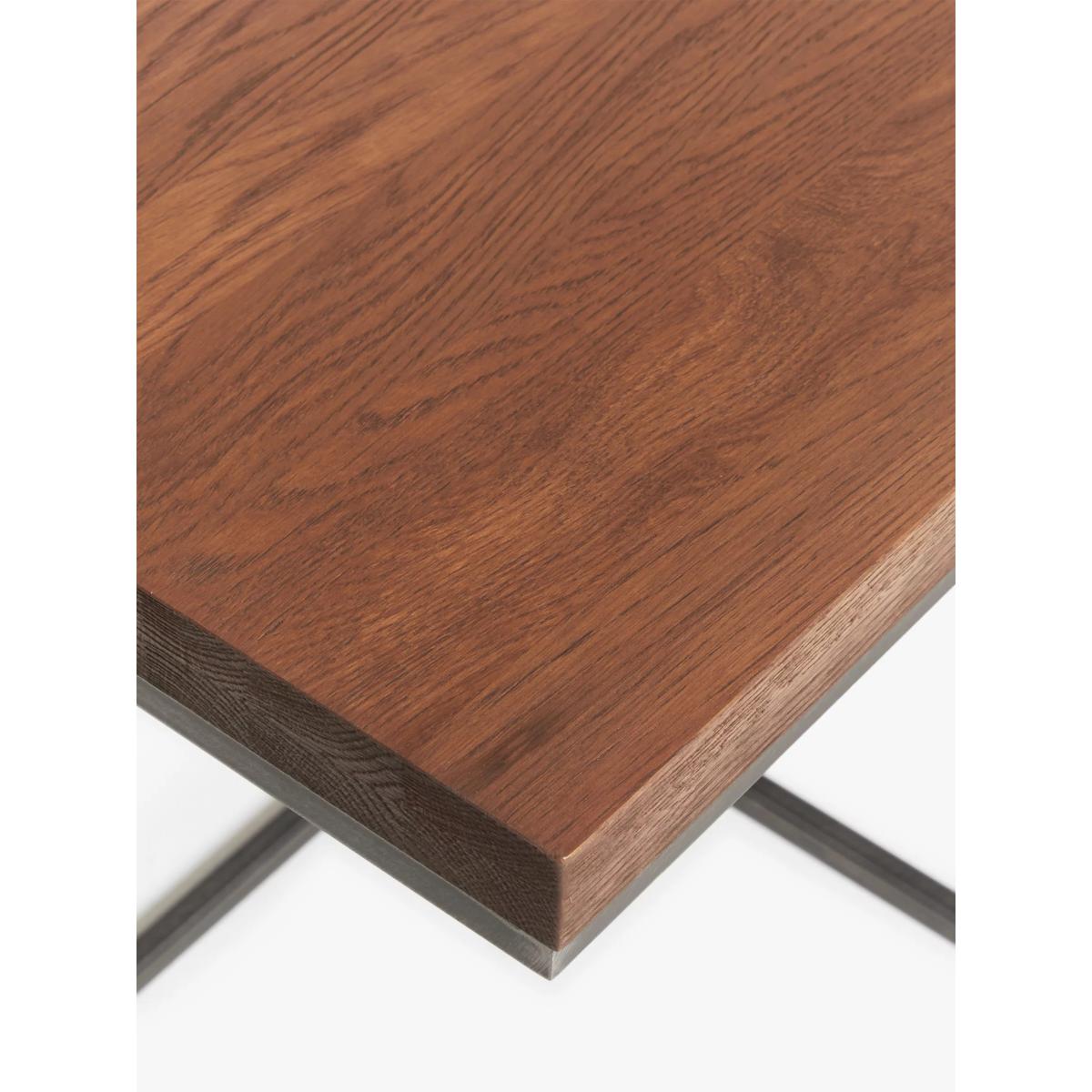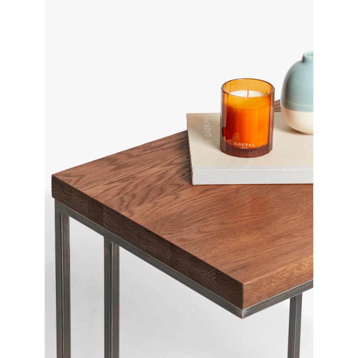 How would we describe our Calia range of furniture? Well, it's loved for its industrial aesthetic and strong welded iron details, which have a wire-brushed and distressed finish. But it's also loved for its natural charm. Individual slats of solid oak make up the rustic surfaces which have been thoughtfully chosen by skilled craftsmen and women. They ensure that the natural pattern of the wood grain, even with its unique irregularities, uphold the design and quality standards that we're known for. This ensures our Calia range offers a look that's as authentic as possible. This side table can do it all. A spot for your favourite photo and a table lamp? Check. Sick of your desk and want to migrate to the sofa for the last hour of work? Perfect! It's really practically sized and its slender frame means it won't take up too much room. Worth knowing Oak is a natural, living material, and part of its charm is that it develops over time. This means that surface splits may start to appear with the natural movement of the wood. Knots will vary in size and location and a subtle colour variation can also be expected. These distinctive qualities give the range a unique feel, as no two pieces will be exactly the same. To keep your furniture looking its best, we recommend periodic oiling and oiling before first use. This is applicable to the Oak version only, as the Chestnut version has a lacquered finish. More information can be found in the assembly instructions supplied. Want to see it first? You may want to see and get a feel for the furniture in one of our shops before ordering. We'll be able to tell you where the range you'd like to view is on display.