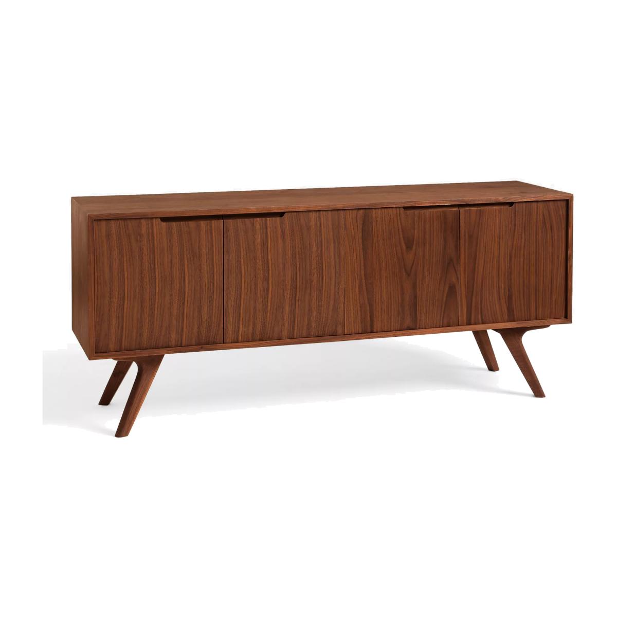 This sideboard is strongly constructed in solid and veneered American black walnut with an oiled finish and features a slim and elegant top and splayed legs. Four doors have inset handles, giving this piece a clean, sleek profile and open to reveal two adjustable shelves. Maximum load 25kg for the top, 10kg for each shelf. Want to see it first? You may want to see and get a feel for the furniture in one of our shops before ordering. We'll be able to tell you where the range you'd like to view is on display.