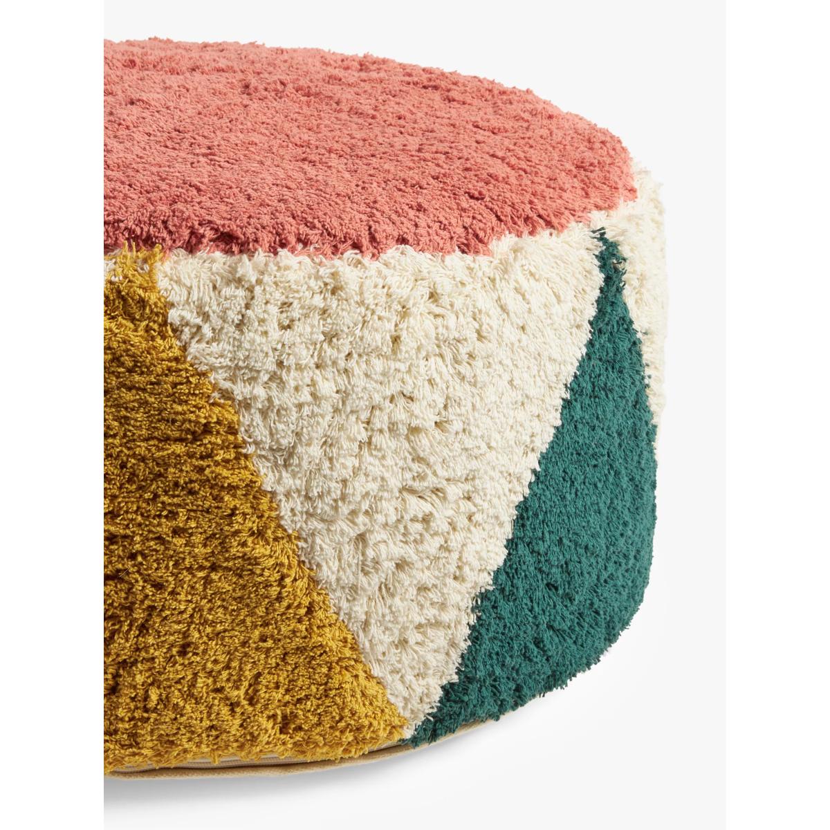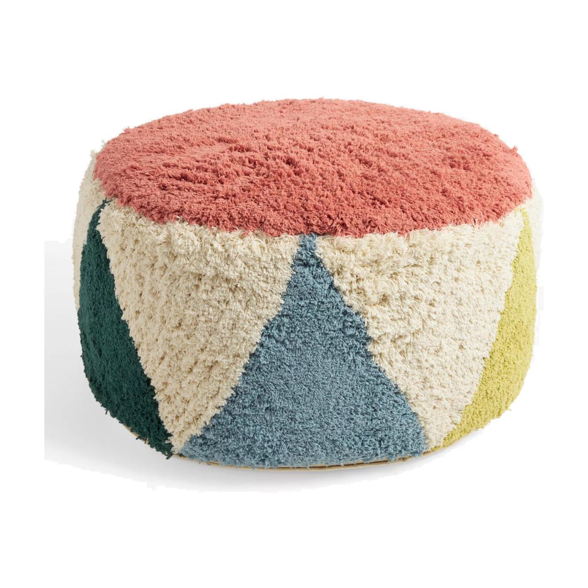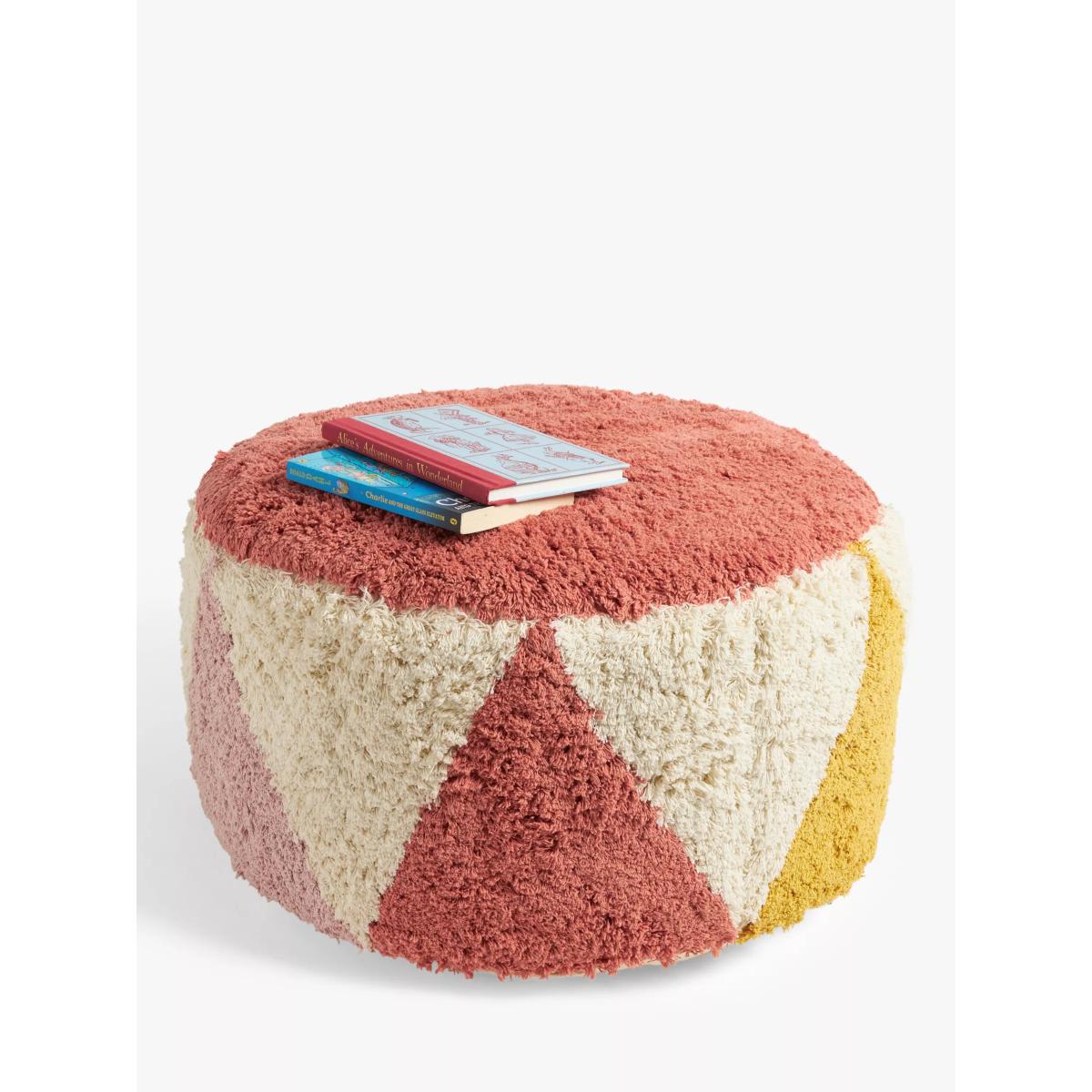 I love this pouffe for its playful geometric pattern and cheerful colour palette, making it a versatile addition to both modern and eclectic interiors. It works particularly well in living rooms or bedrooms where it can double as extra seating or a statement footrest. For styling tips, consider pairing it with neutral sofas to add a pop of colour, or mix it with other textured textiles for an inviting, layered look. Its soft, textured fabric and rounded shape lend it a comfortable, cosy feel, while its sturdy structure makes it practical for everyday use. A great choice to add both function and fun to a variety of spaces.