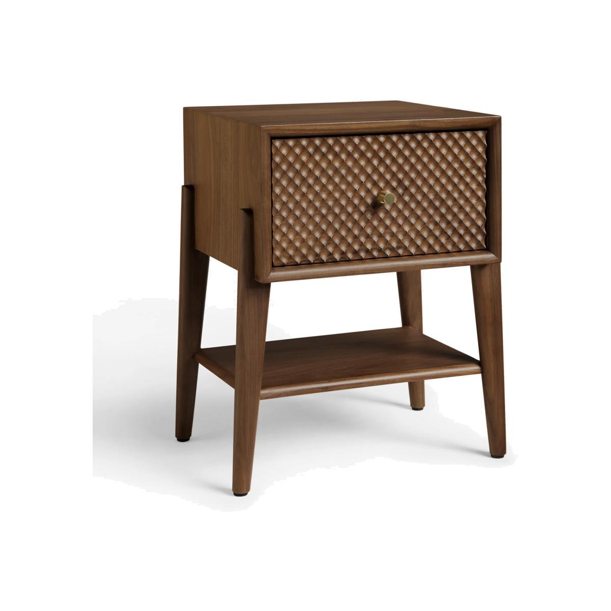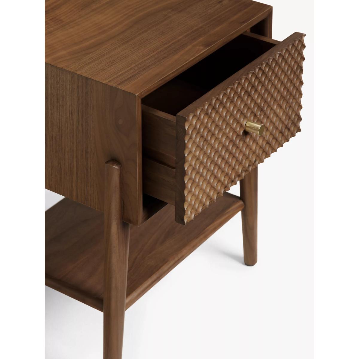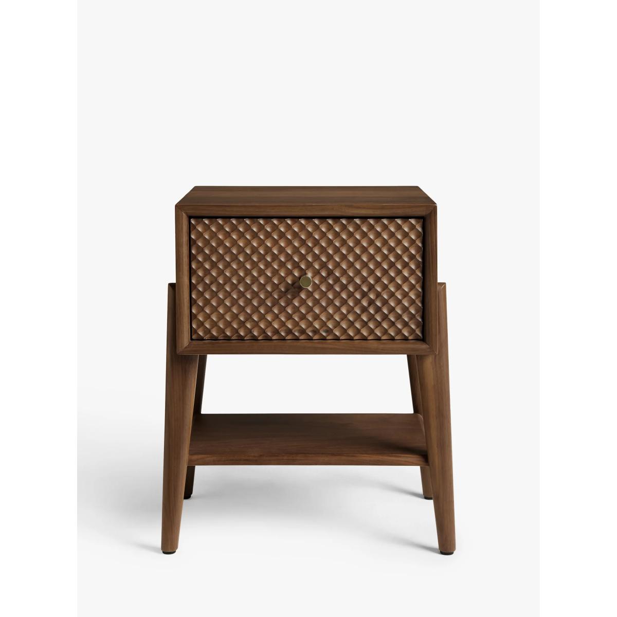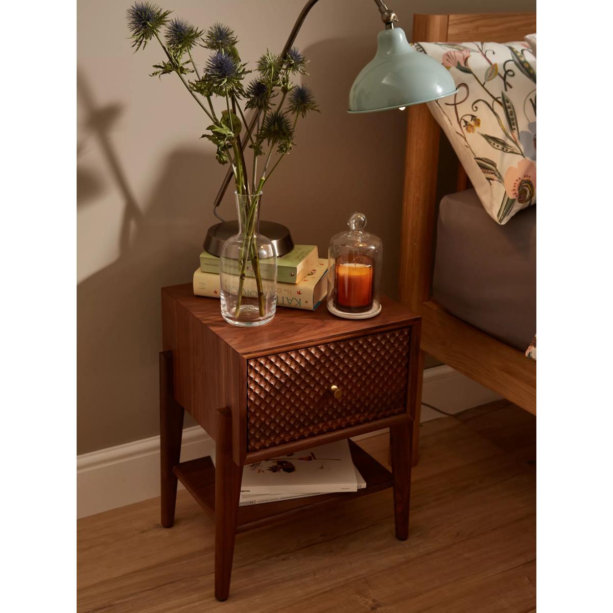 With its smooth profile, tapered frame and distinctive, textured drawer front, this bedside table is an expression of quality woodwork. It's made from a combination of walnut and pine woods, and MDF, and features a spacious drawer and shelf section. We like it's Mid-Century-inspired design that makes it easy to style in most interior schemes. Want to see it first? You may want to see and get a feel for the furniture in one of our shops before ordering. We'll be able to tell you where the range you'd like to view is on display.