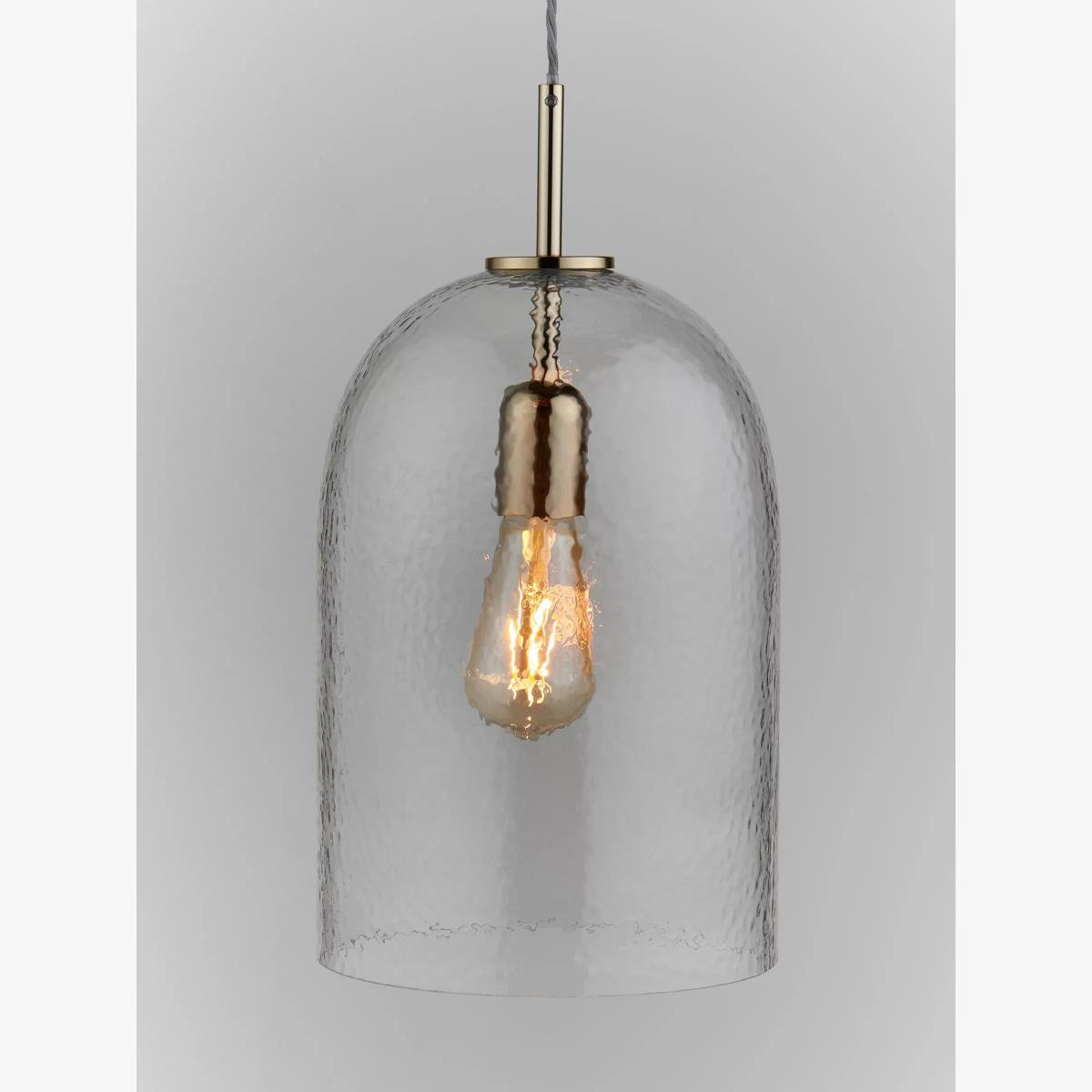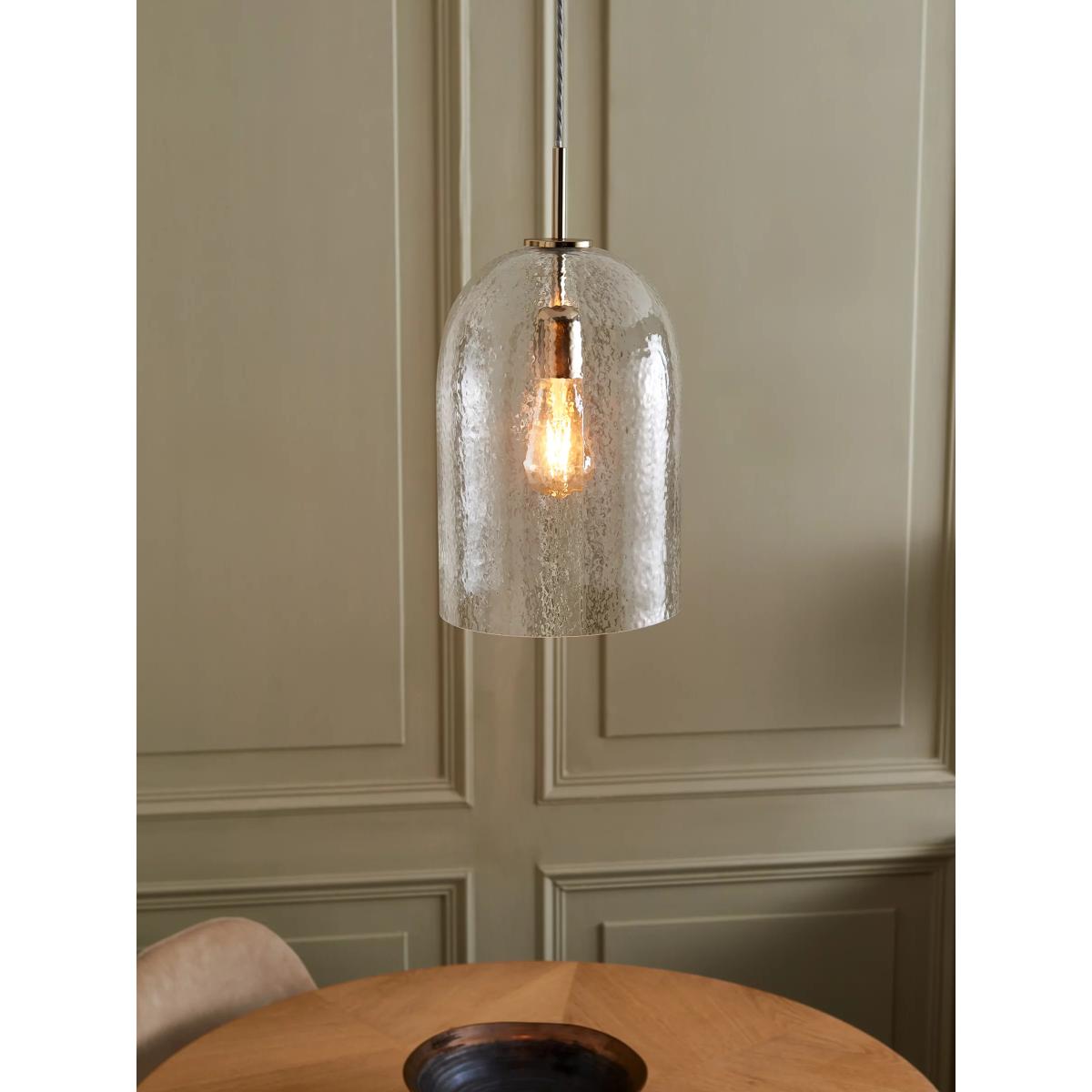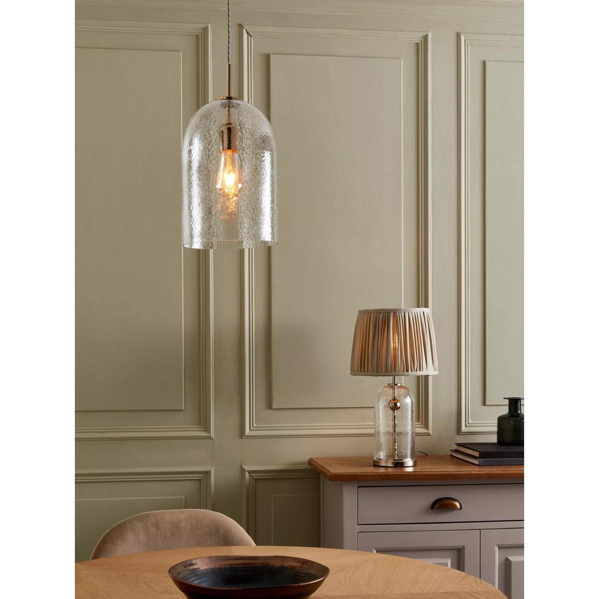 Vintage elegance and statement proportions. Hammer-beaten glass creates an alluring light effect on our Chalice pendant. The tall, elegant glass stands proud in any classic interior. Finished in subtly warm brass plating and suspended on an adjustable, twisted fabric cable. Coordinating Chalice lighting options are available to complete the look of your room.
