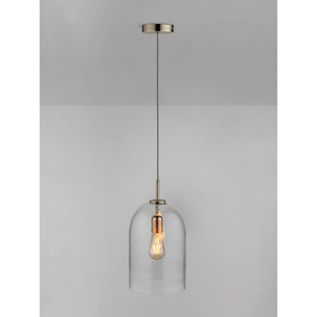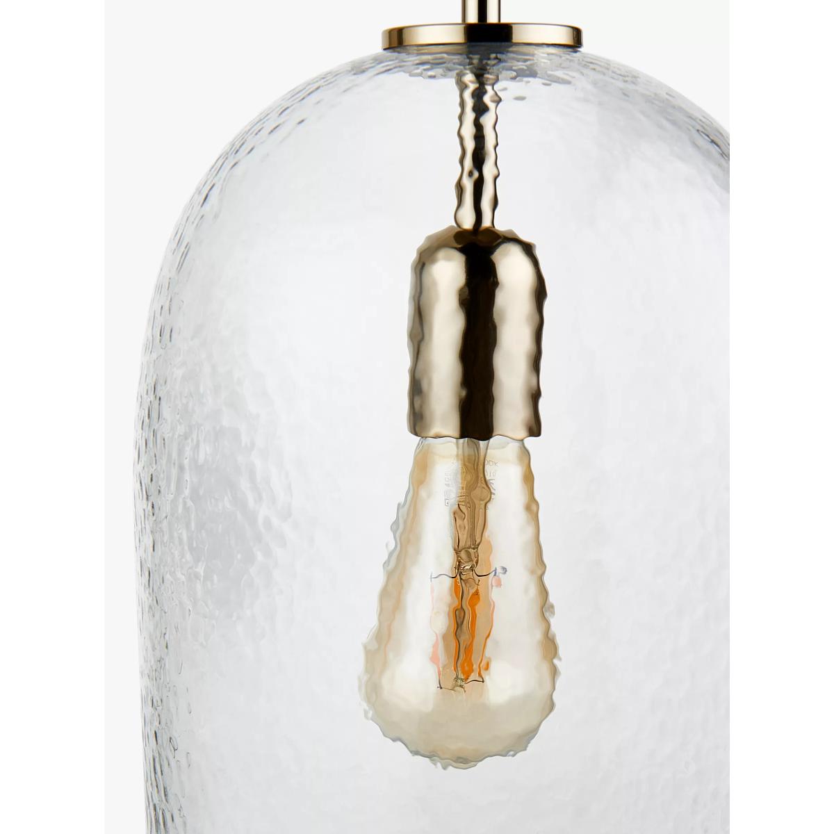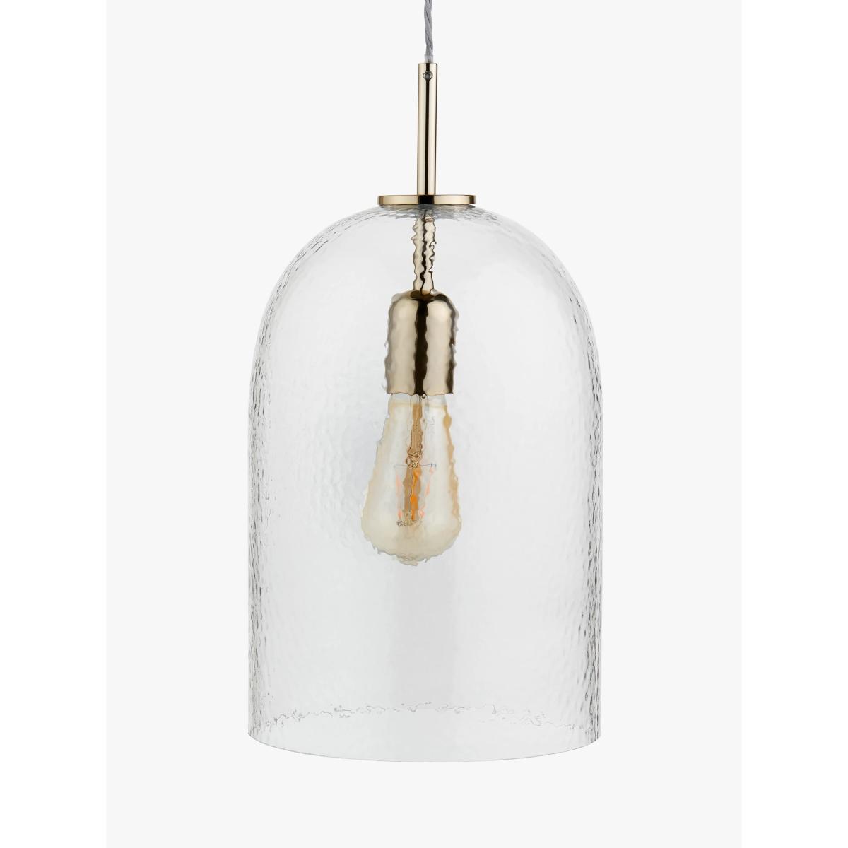 Vintage elegance and statement proportions. Hammer-beaten glass creates an alluring light effect on our Chalice pendant. The tall, elegant glass stands proud in any classic interior. Finished in subtly warm brass plating and suspended on an adjustable, twisted fabric cable. Coordinating Chalice lighting options are available to complete the look of your room.