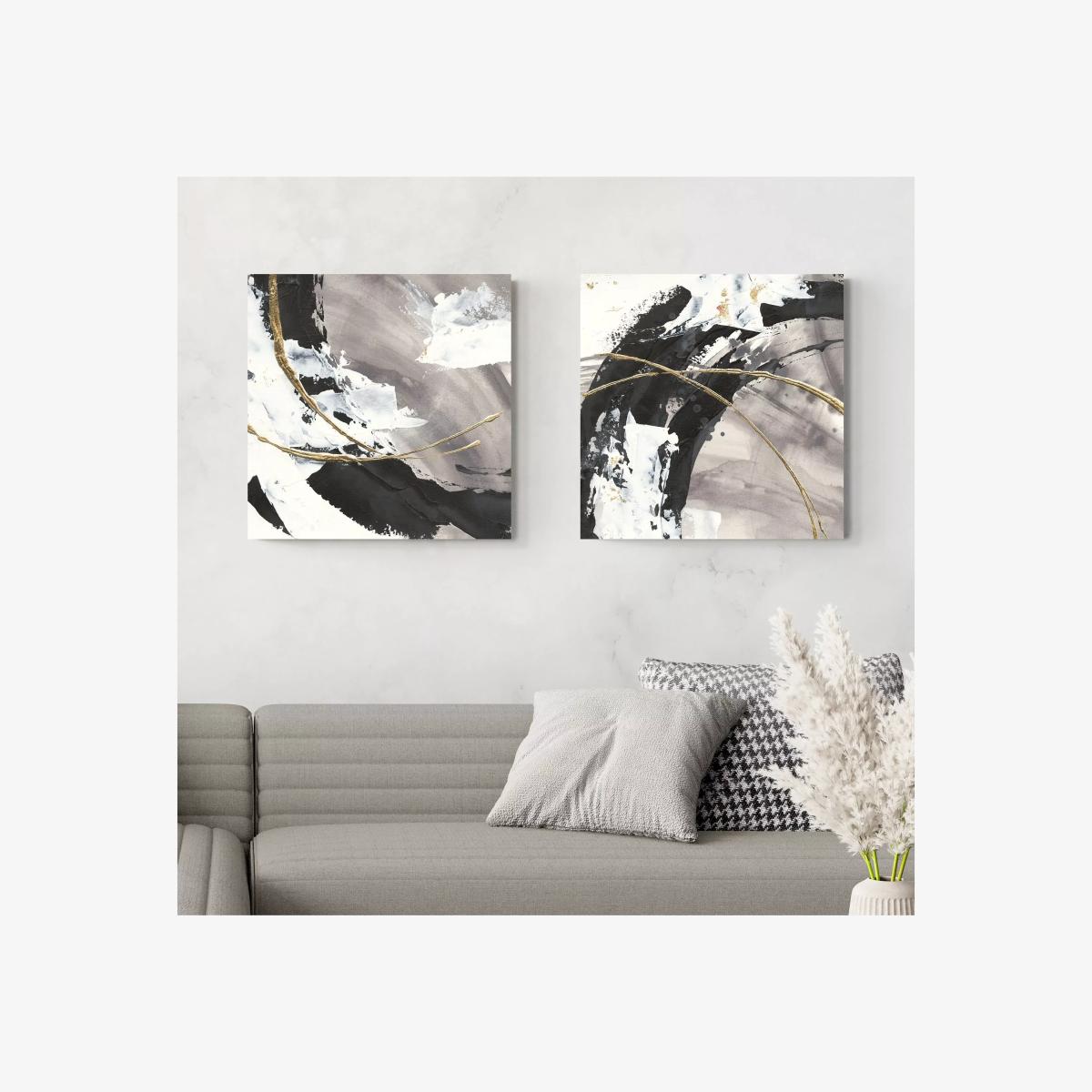 Pair of canvas prints of abstract works by artist Chris Paschke, with gold-toned arcs. Made in the UK and ready to wall hang. Chris Paschke is an accomplished fine artist and calligraphic designer currently residing in Tehachapi, California. Her fascination for calligraphy and pen-written letterforms began in college and has been a lifelong study. First captured by the precision and structure of historic illuminated alphabets, her work was set free when studying with European masters from Germany, Austria and Russia who encouraged abstraction and personal interpretation. Have you thought about wall hooks and fittings?