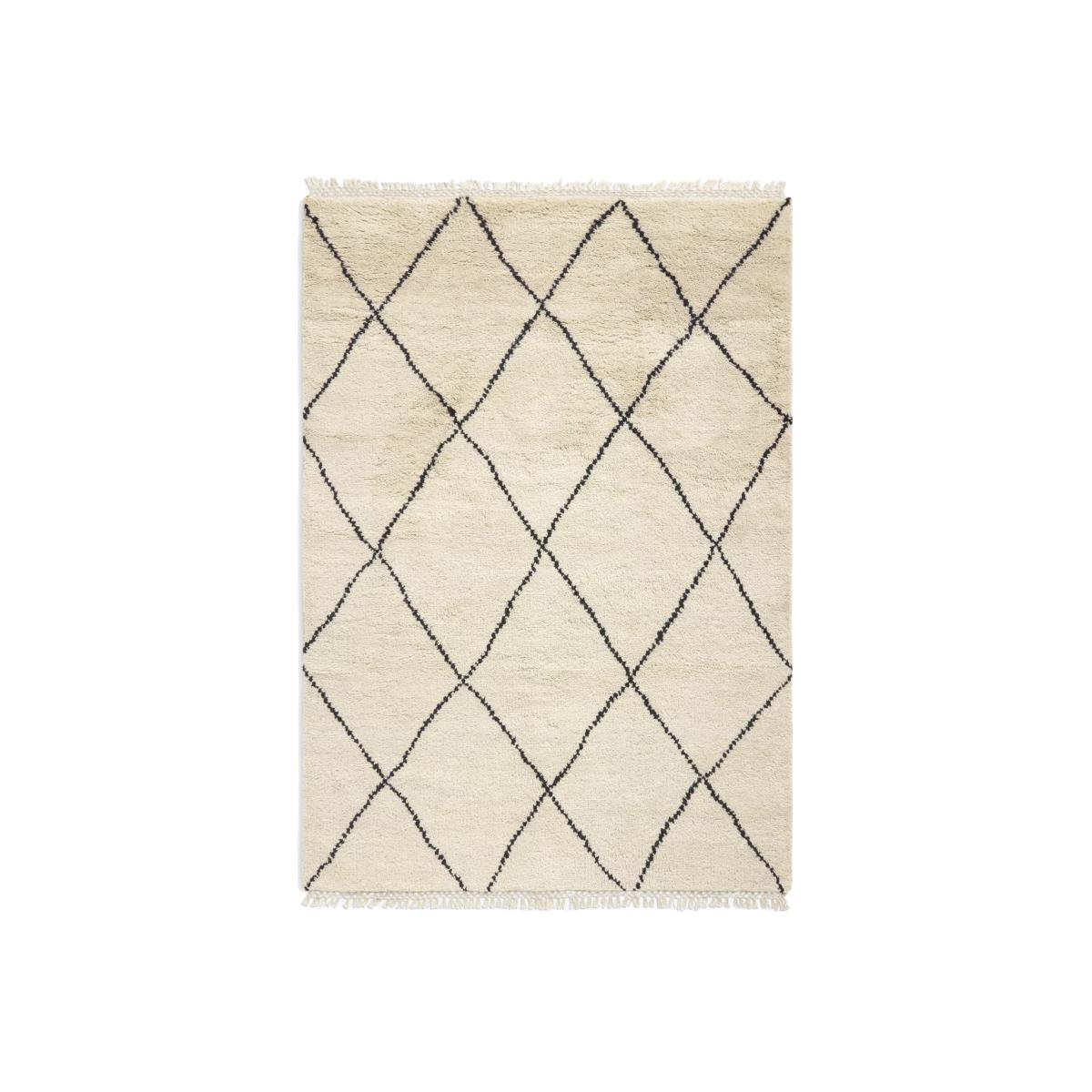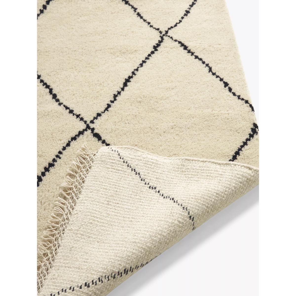 One of the oldest styles of rug design, our in-house design team imagined this floor covering with a timeless diamond Berber-style pattern. Sitting on plush, 100% wool for an inimitably soft feel underfoot, tassels at either end add a relaxed twist to contrast the rigid, geometric pattern. This rug has been knotted by hand, the oldest and most individual way a rug can be made. This involves an intricate process of weaving by hand on a loom where yarns are tied one at a time, giving the rug a durable construction. The benefits of a wool rug Warm and durable, wool feels beautifully soft underfoot and is long-lasting Naturally flame-retardant and odour resistant Water repellent so easier to clean Naturally biodegradable, wool is part of the circular economy and contains no micro plastics About your new rug We recommend John Lewis & Partners Rug Hold Underlay. It prevents your rug from moving underfoot and protects against colour transfer to the floor As this rug is made using natural fibres, shedding is to be expected. This will reduce over time, and should not have an impact on the lifespan or performance of your rug. When you first get your rug, please use the brush attachment on your vacuum cleaner whilst the shedding dies down. After that, when vacuuming your rug, use suction only. Rotating brushes may damage the fibres. When vacuuming your rug, use suction only. Rotating brushes may damage the fibres Blot any spills with a clean, dry cloth. Do not rub or use harsh detergents. Textile backed Attend to spillages immediately and blot with a clean, dry cloth to prevent staining. Dilute a small amount of appropriate carpet shampoo in water. Dampen a colourfast cloth in the diluted shampoo solution and dab the rug, lightly agitating, moving in the direction of the pile. Treat the whole rug and not just the affected area. To restore the appearance of the affected area, use a soft bristled brush to gently comb in the direction of the pile. Allow the rug to thoroughly dry.