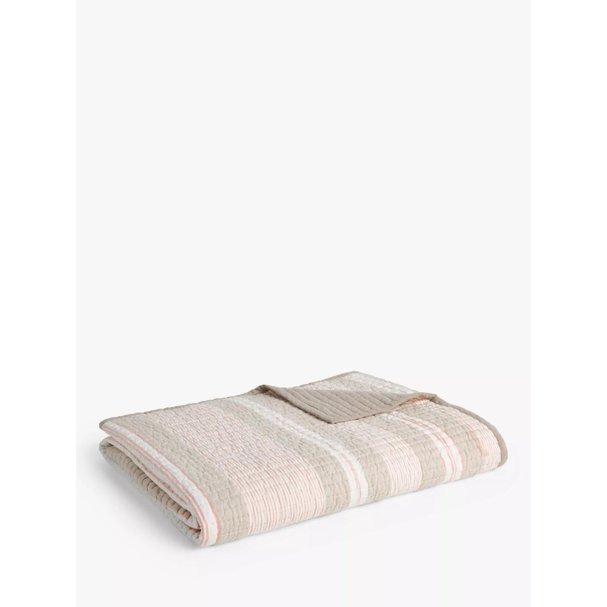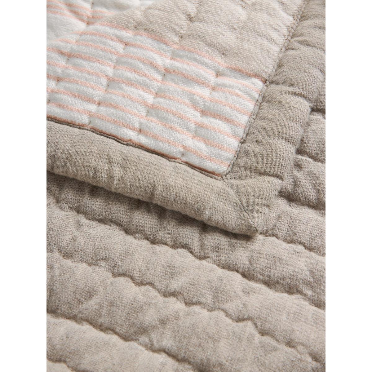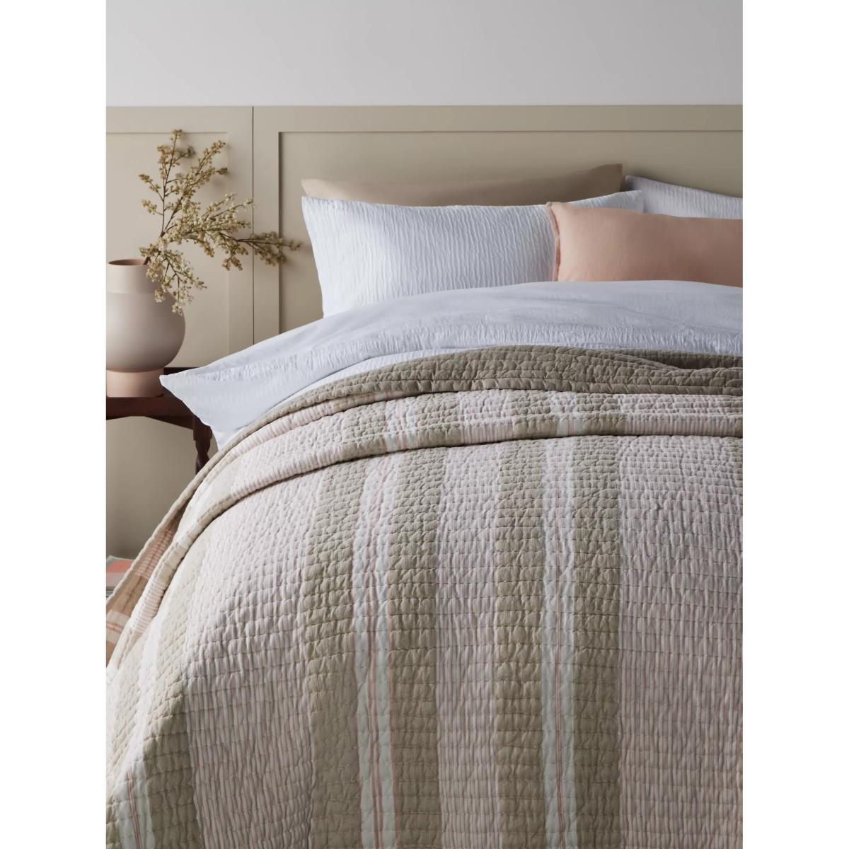 This classic hand-quilted, woven bedspread is reversible, offering a channelled, natural weave on one side and a ticking stripe on the other. We recommend this size for double and kingsize beds. Mimicking the feel of more luxurious fibres, this smart polyester bedspread adds a touch of elegance to your sleep sanctury, with the added benefit of being easy to care for; machine washable and quick drying. Made using GRS Certified Recycled Polyester. This ensures chain of custody, social and environmental practices and chemical restrictions. Better Cotton By choosing our cotton products, you’re supporting our investment in Better Cotton’s mission to help cotton communities survive and thrive while protecting and restoring the environment. Better Cotton Farmers are farmers who care for the environment and respect workers’ rights and wellbeing. This product is sourced via a system of mass balance and therefore may not contain Better Cotton. bettercotton.org/massbalance