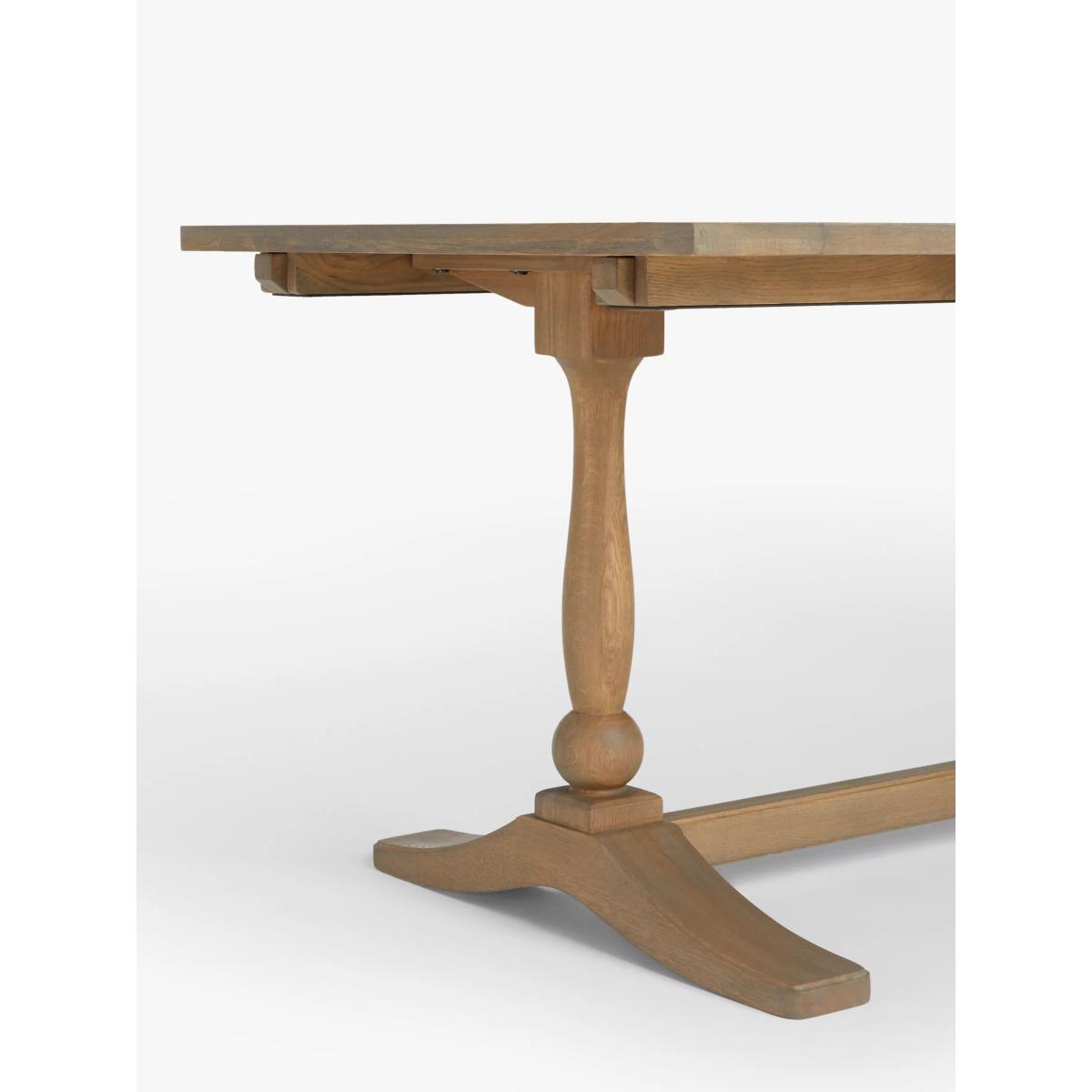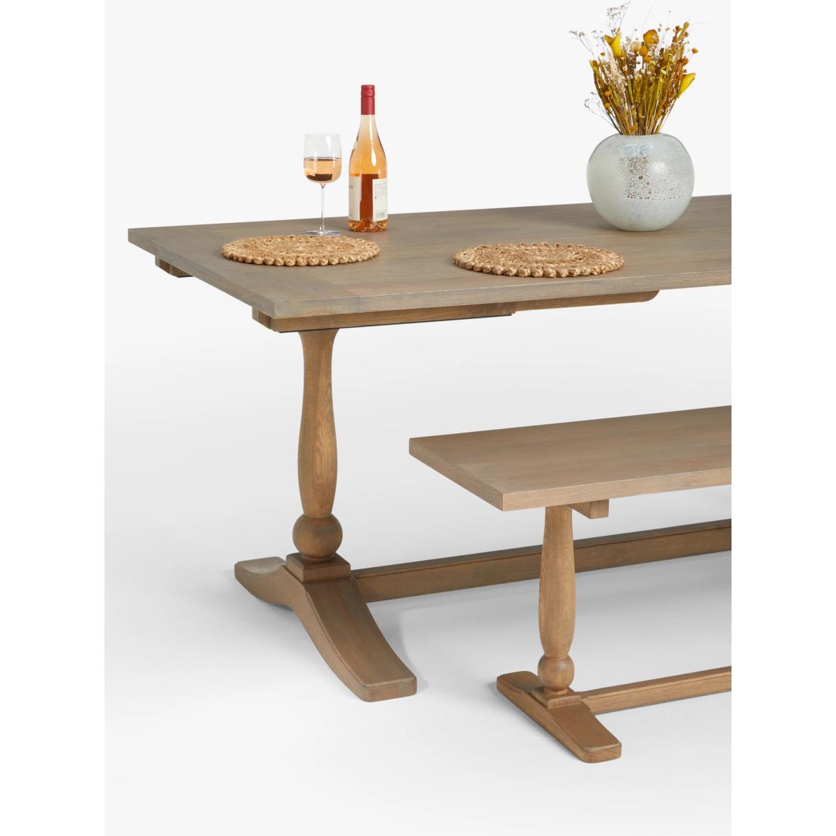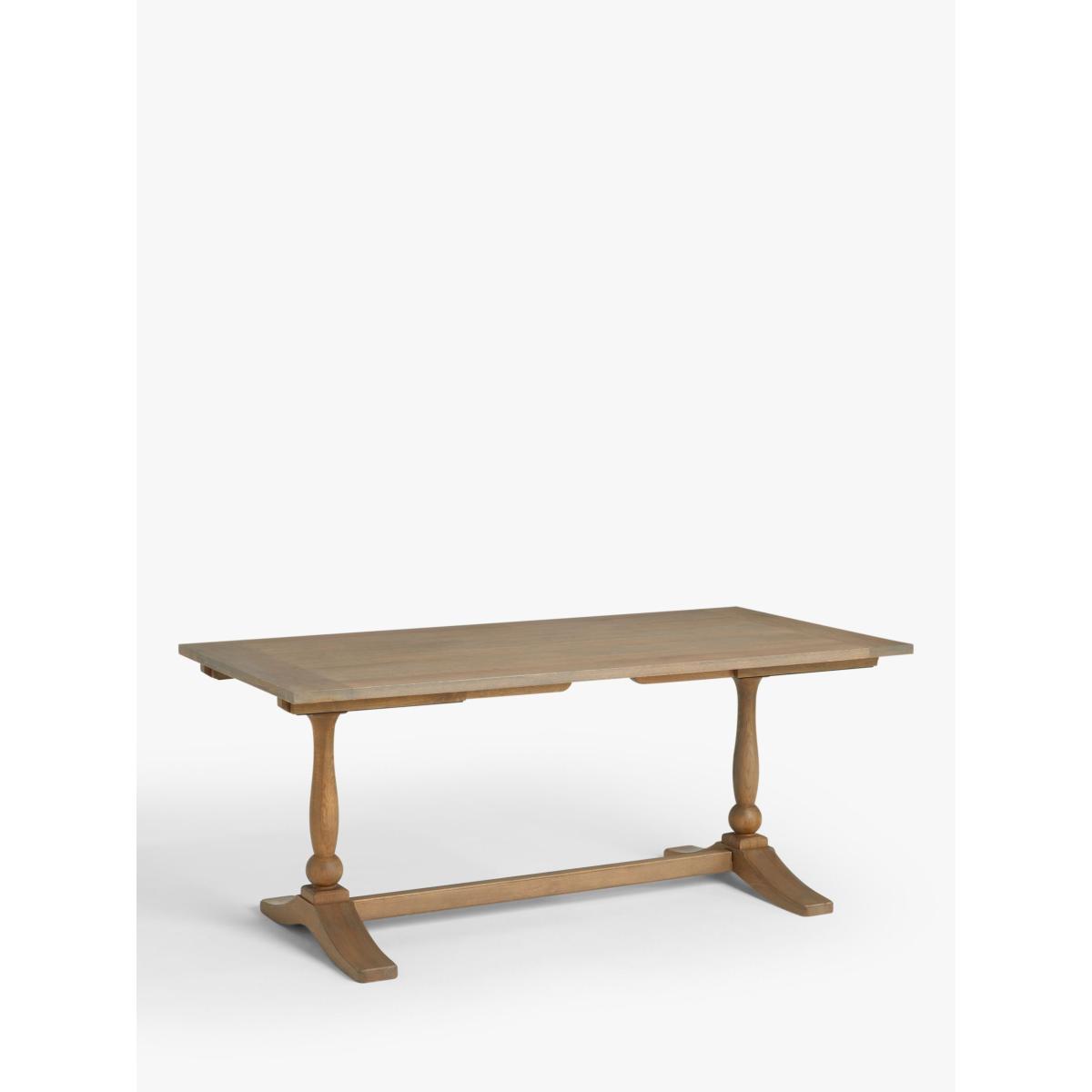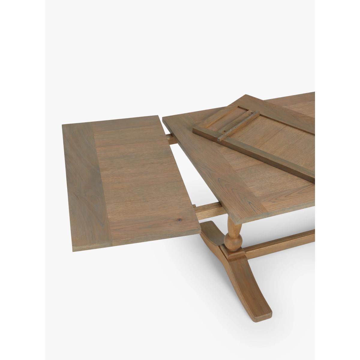 This attractive dining table extends via a slide-out leaf to seat up to 8 and features extended, braced pillar legs for stability. Designed in-house by the design studio, Clemence is an oak and rattan range with antique brass hardware and heritage detailing, elegant turned and fluted details and pillar legs. A soft grey stain adds a refined and aged look to this classic range. Want to see it first? You may want to see and get a feel for the furniture in one of our shops before ordering. We'll be able to tell you where the range you'd like to view is on display.