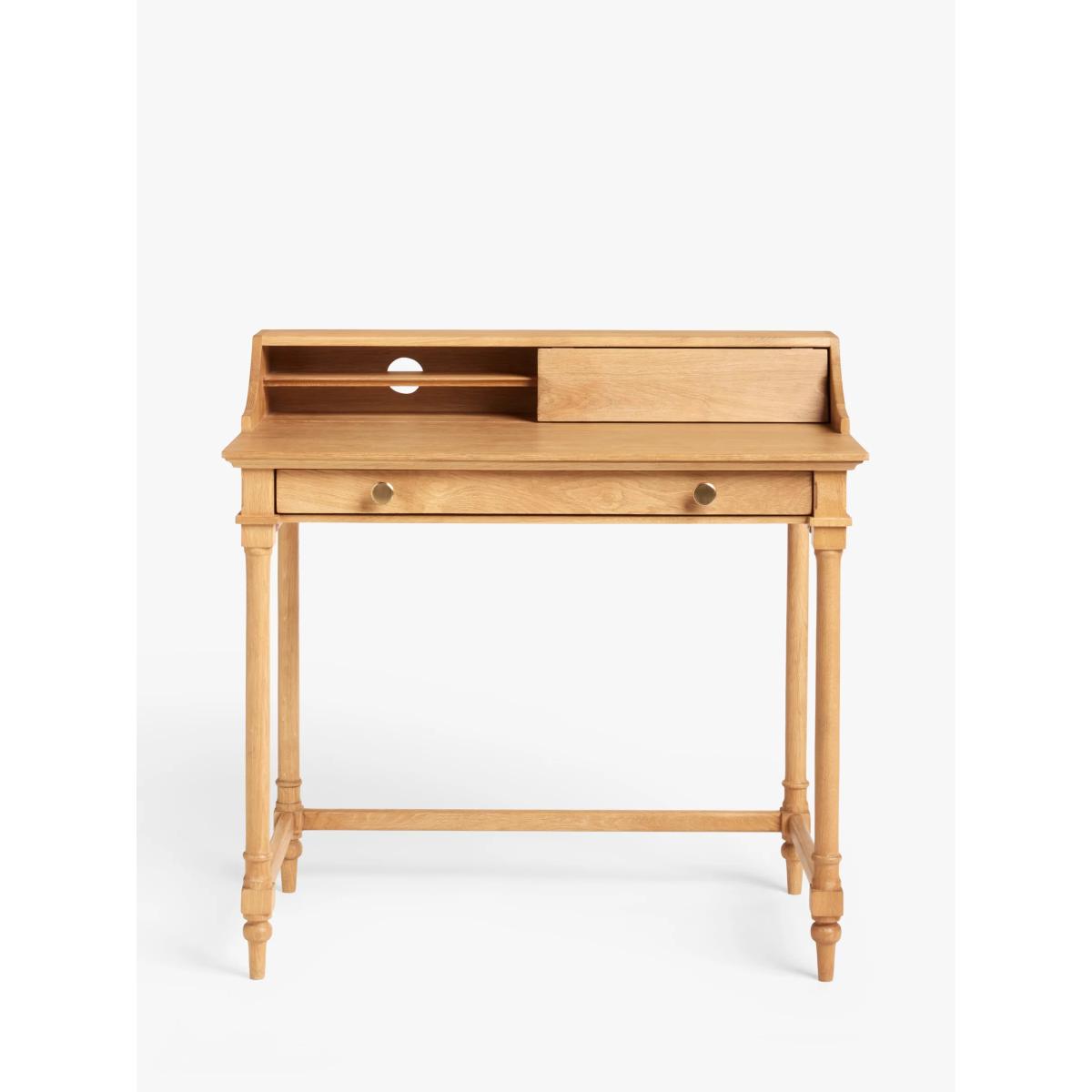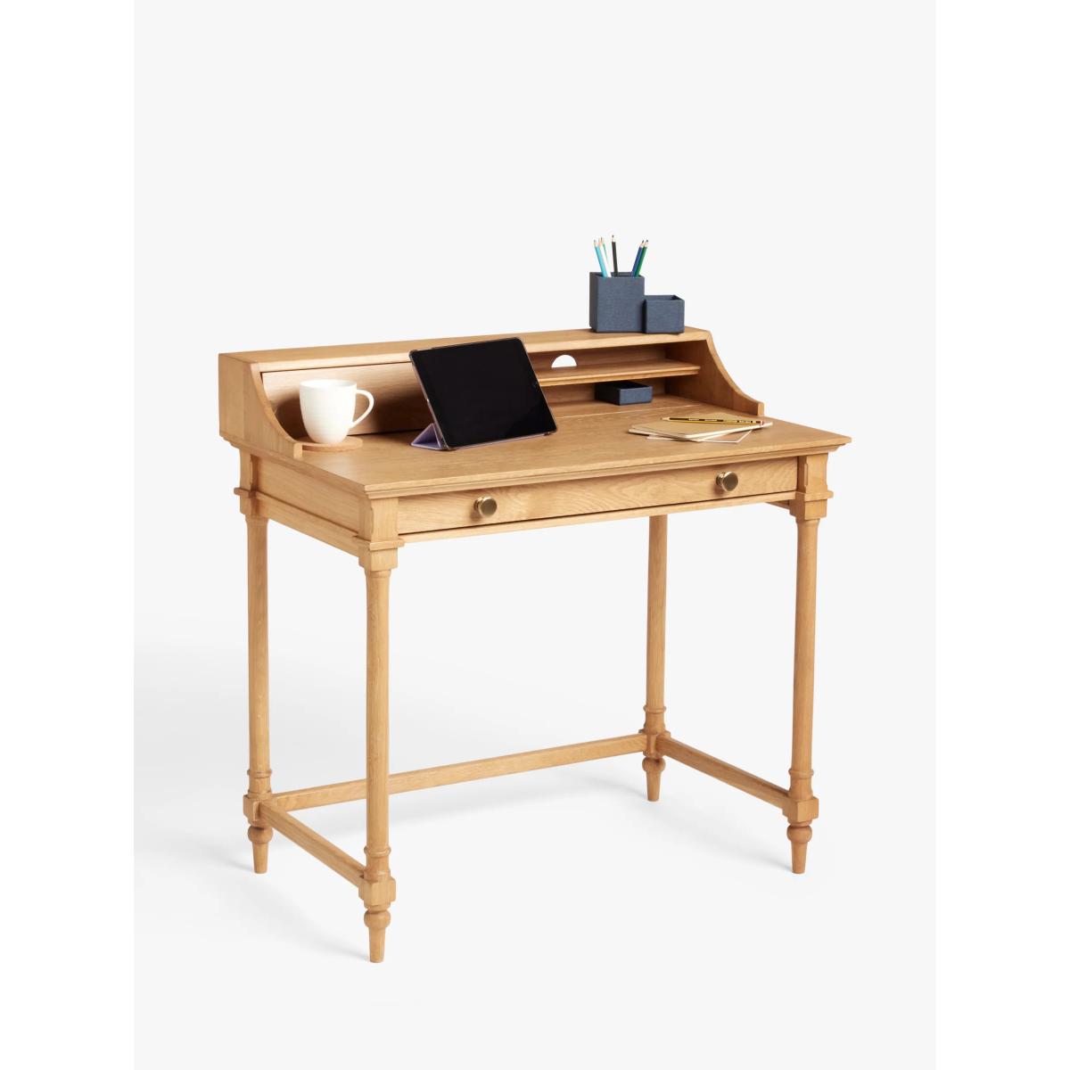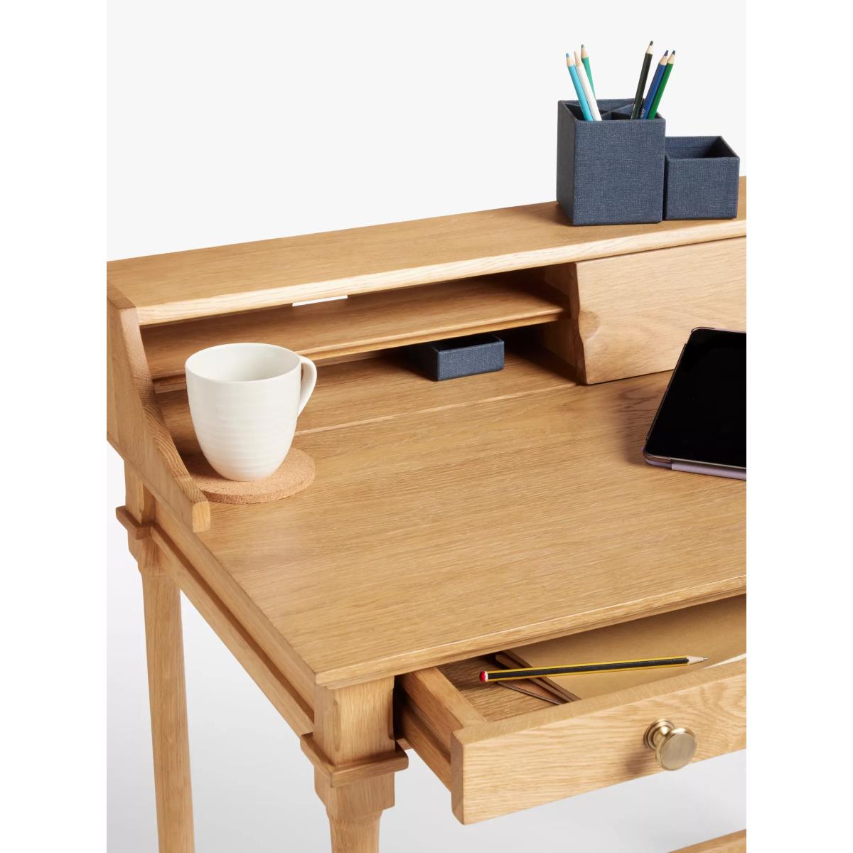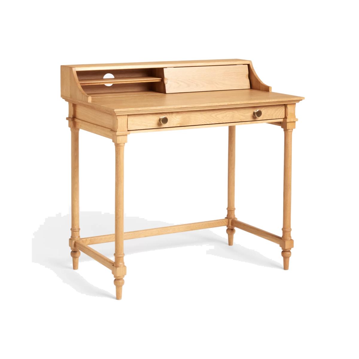 I really like this one for its clean, timeless look and natural oak finish, which works beautifully in both classic and contemporary interiors. It’s ideal for a home office setting where you want a piece that adds warmth without feeling bulky. The compact size makes it perfect for smaller spaces or as a stylish additional work station, while the classic design with subtle detailing lends it versatility. For styling, consider pairing it with sleek modern accessories or vintage-inspired decor to highlight its heritage charm. Adding a colourful desk lamp or some greenery can also help bring life to the space without overpowering its understated elegance.